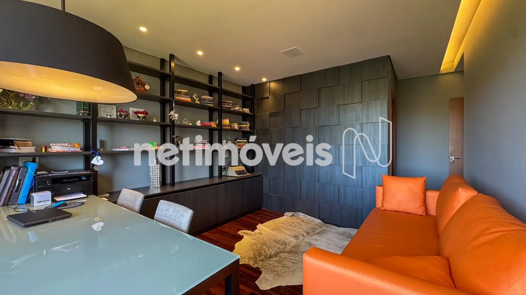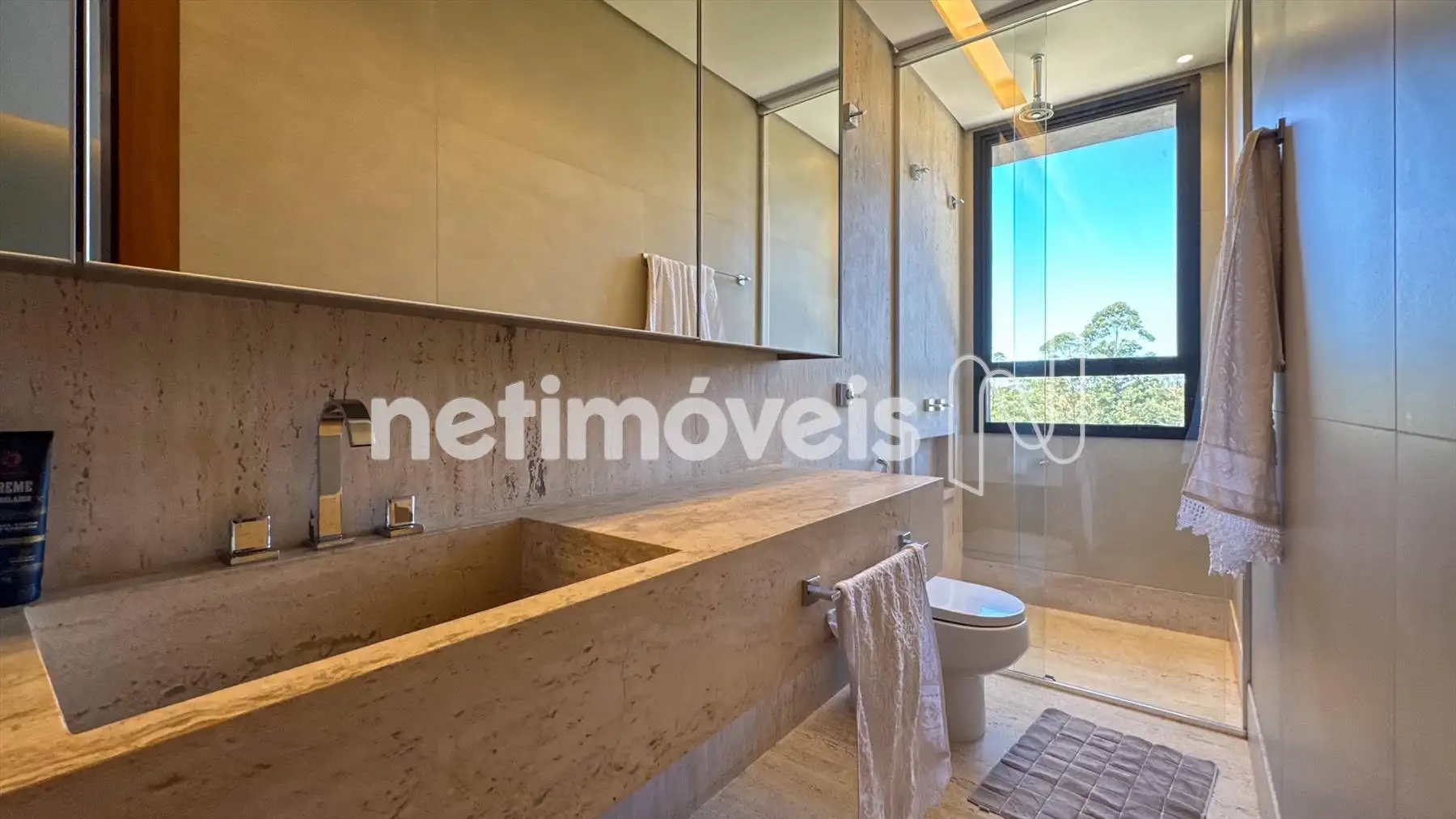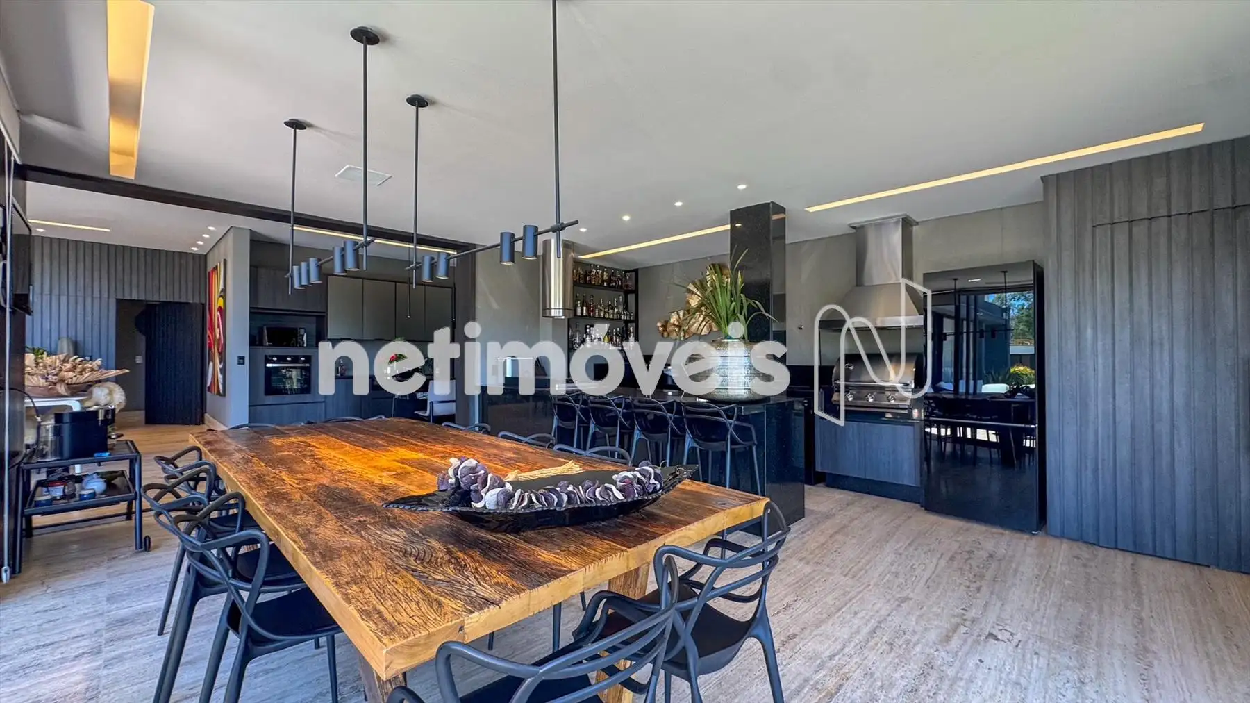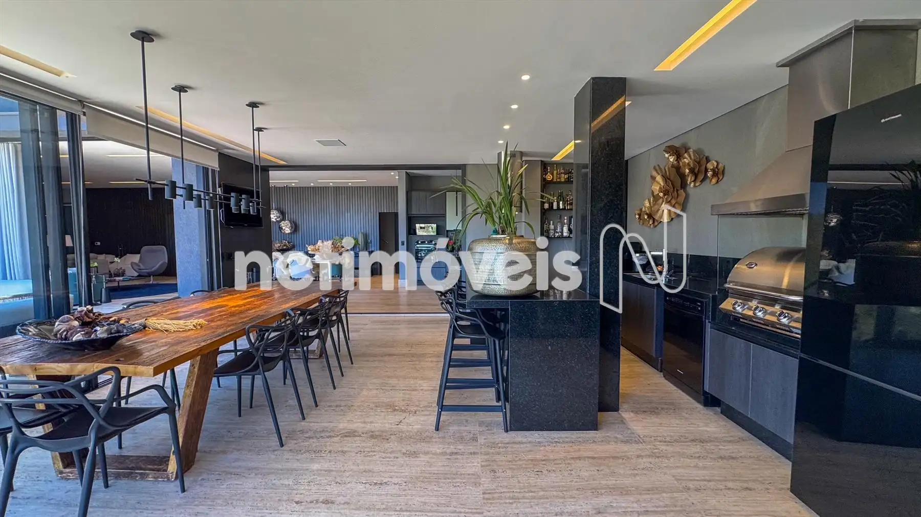 Acabamentos nobres, marcenaria planejada e pisos em travertino em todo o pavimento principal.