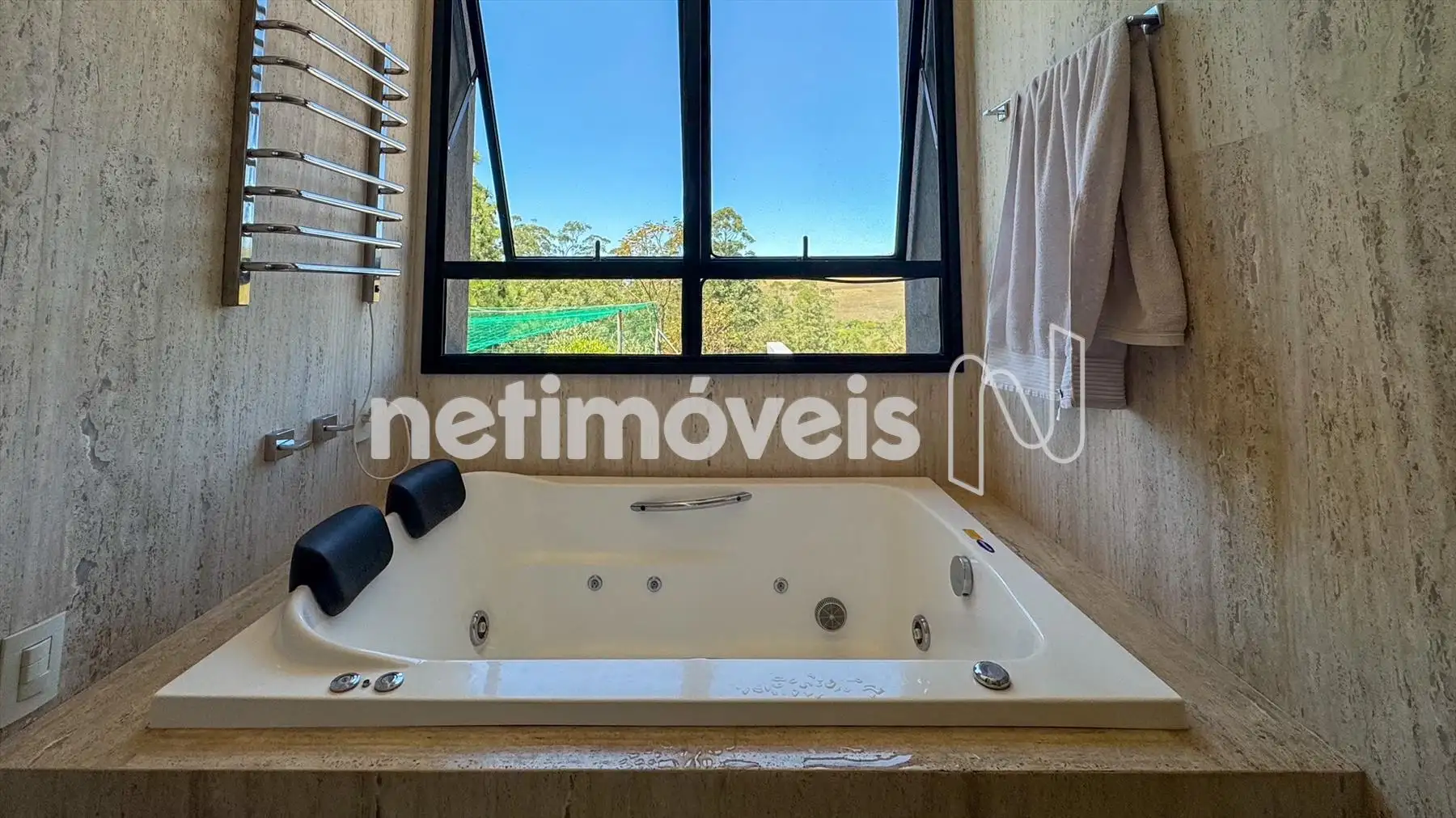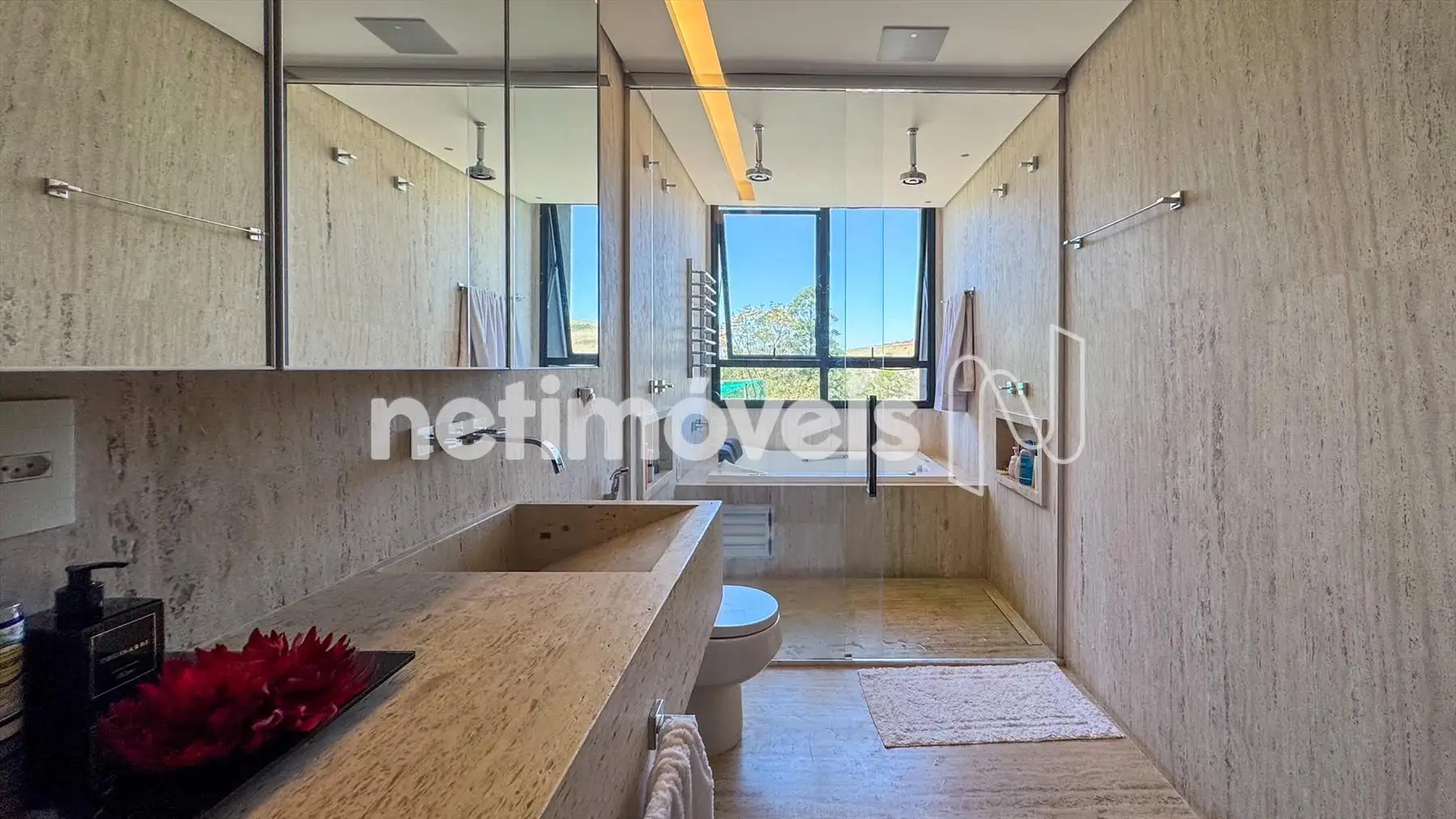 Suíte master espaçosa com banheiro luxuoso, banheira, bancada dupla e vista privilegiada.