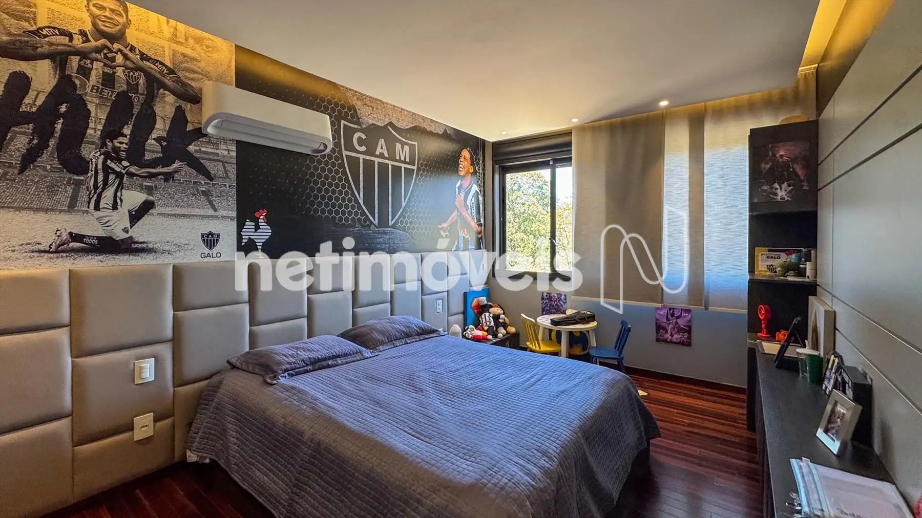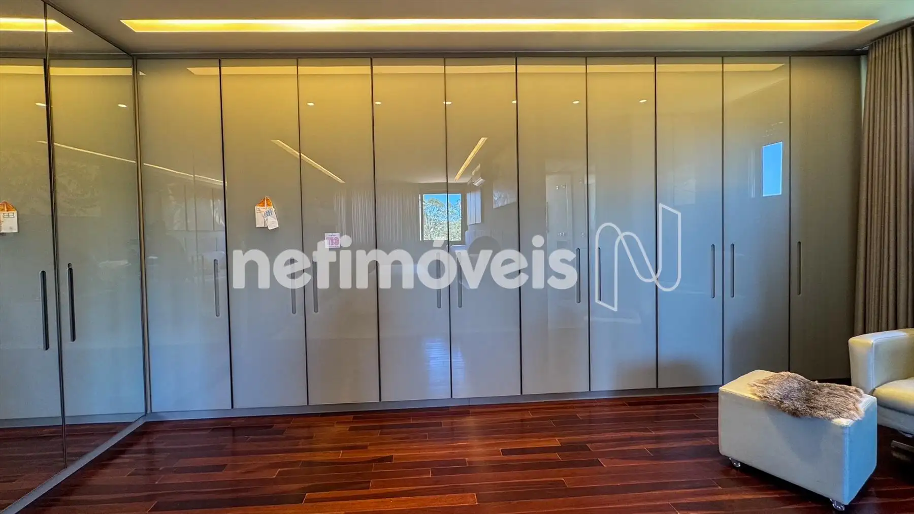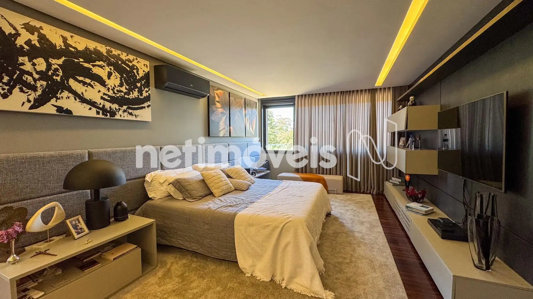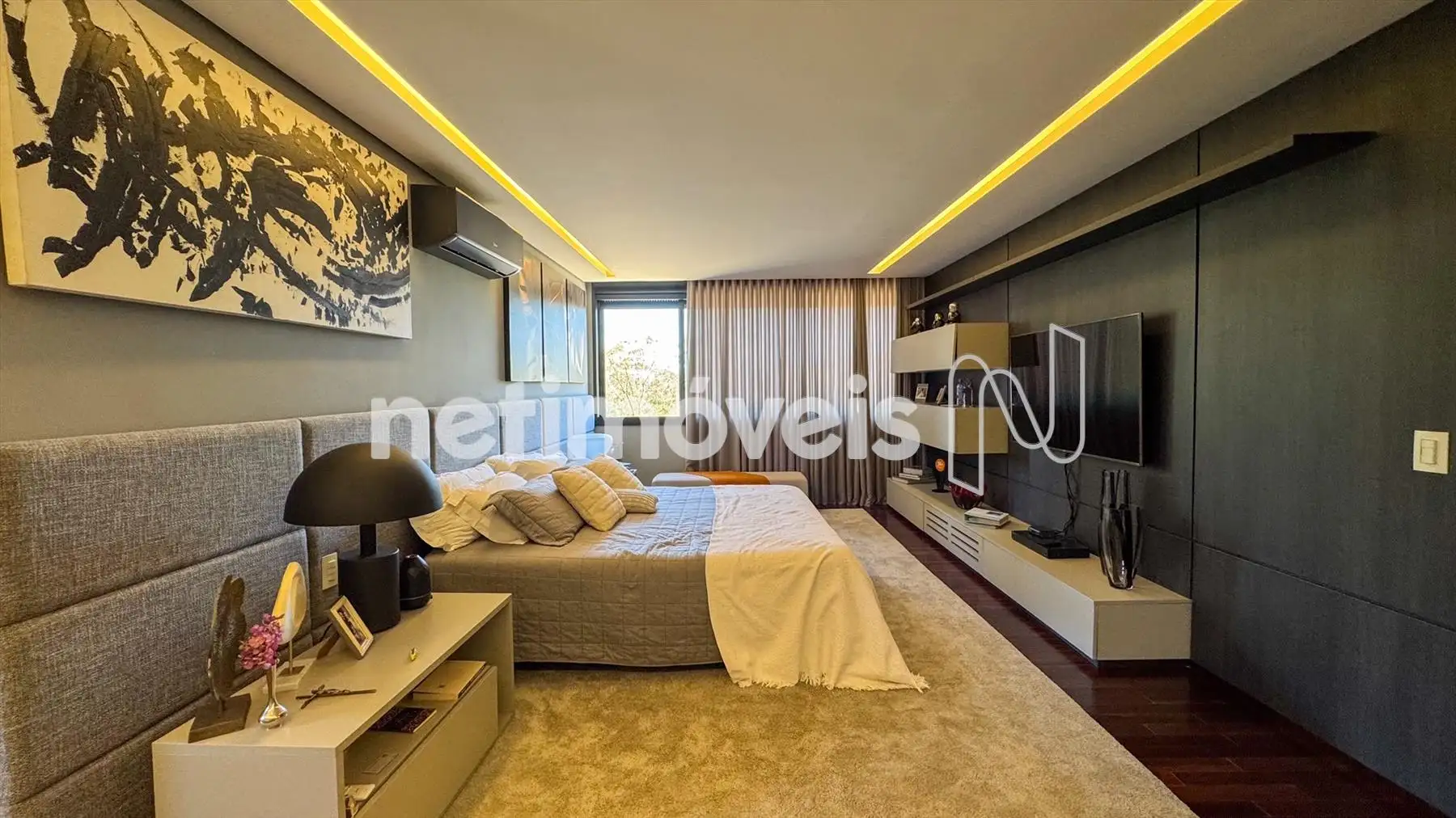 4 suítes climatizadas no andar superior, com piso em madeira natural e janelas automatizadas.