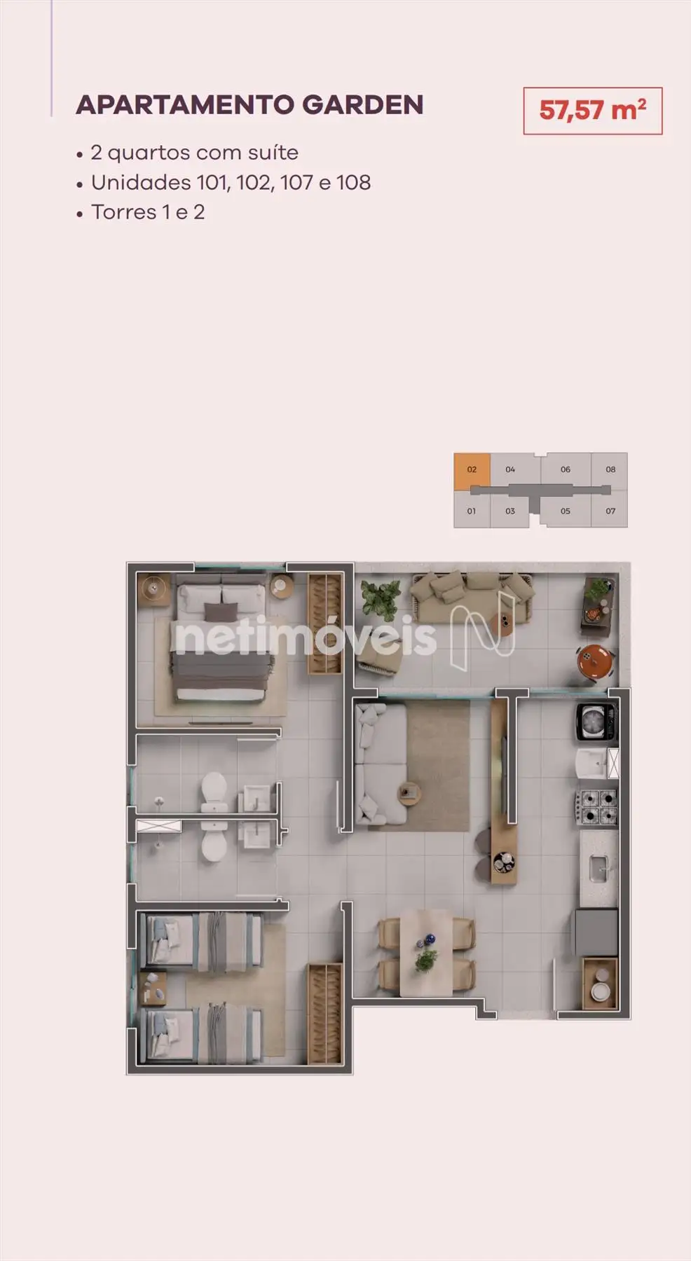 - 4 unid de 2 quartos com suíte - 57,57m²;