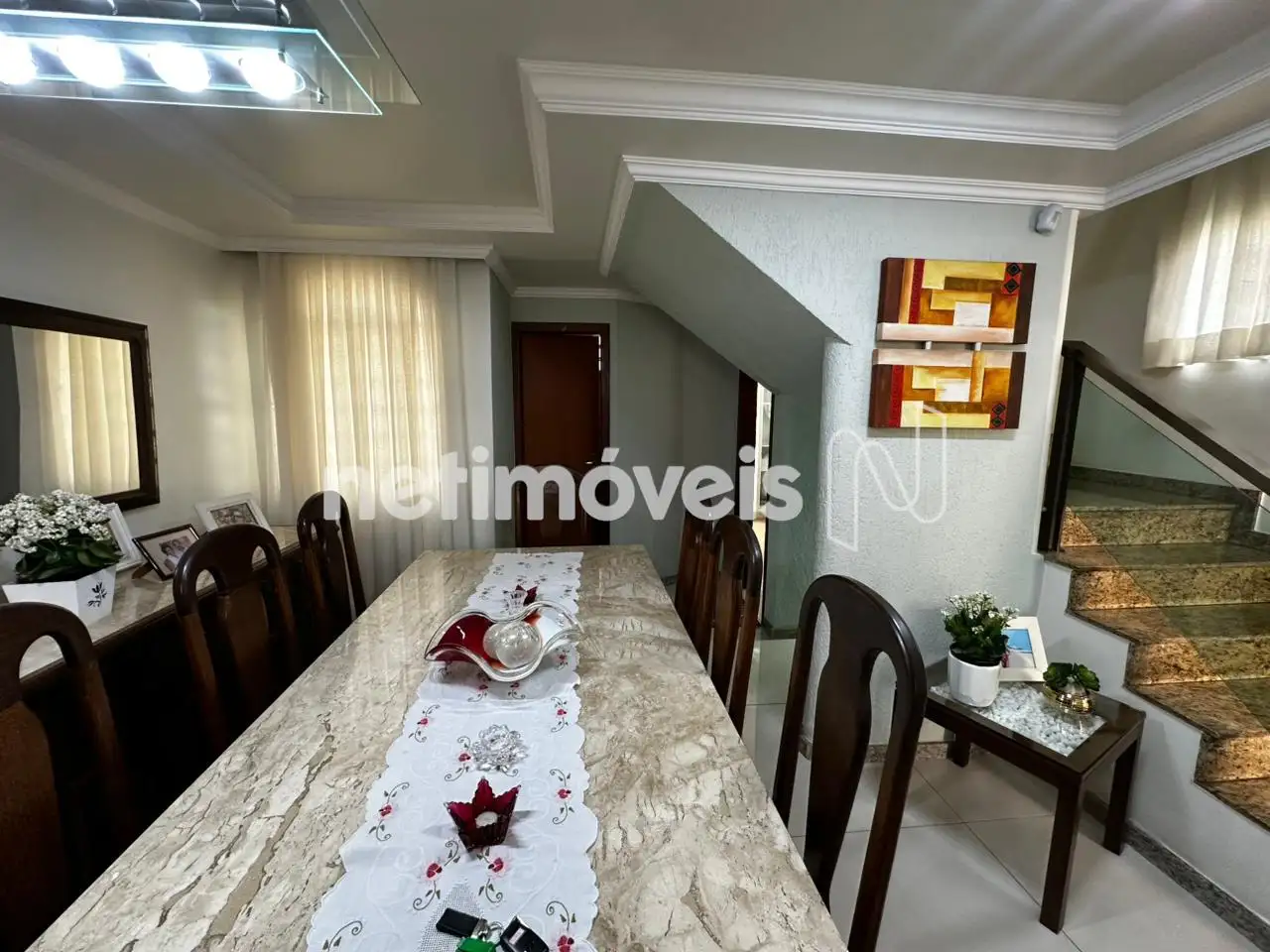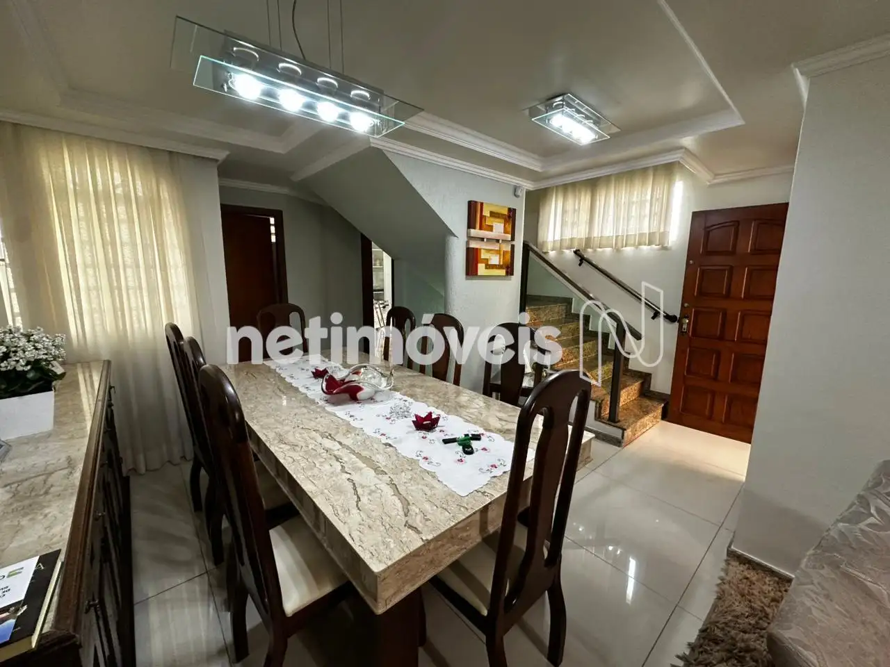 No primeiro pavimento, o imóvel conta com uma ampla sala para dois ambientes, integrada à copa conjugada. A cozinha com armários planejados