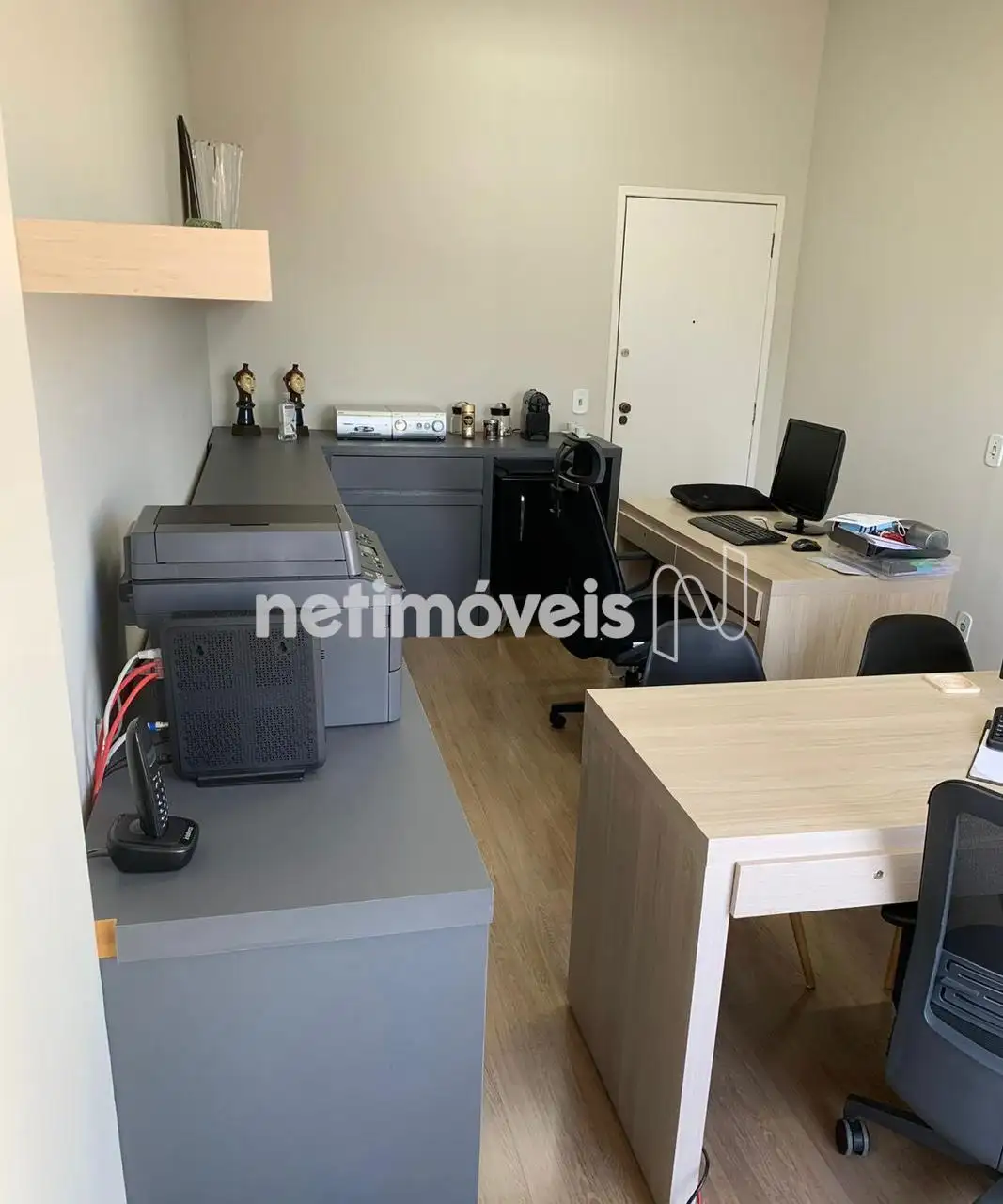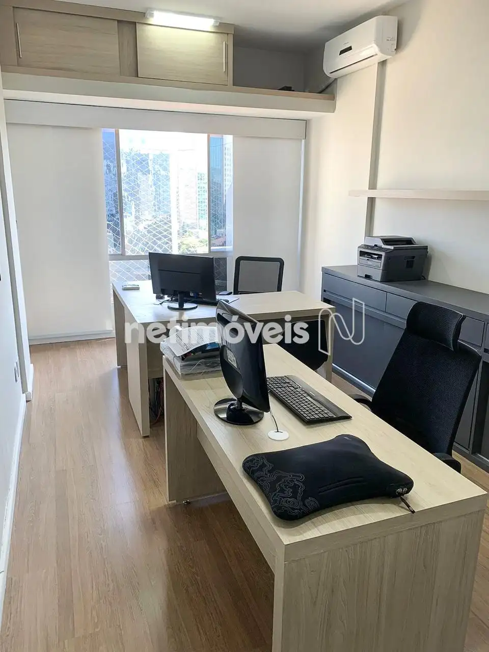 Sala com área total de 25 m², mobiliada, com piso em laminado, armários e ar-condicionado.