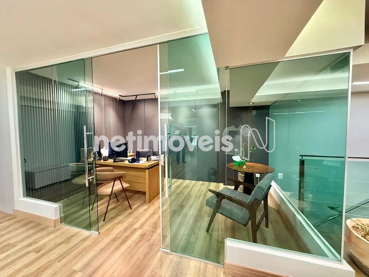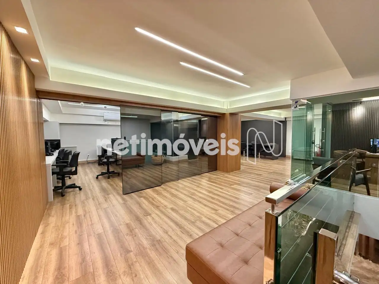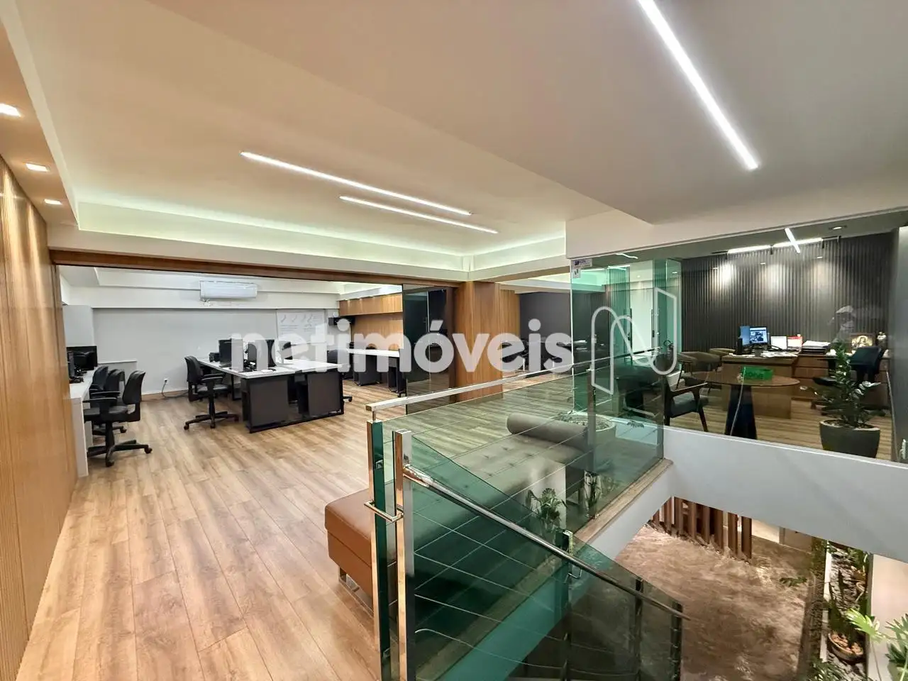 Mezanino com piso em vinílico, escritório, sala para reuniões e salão livre;