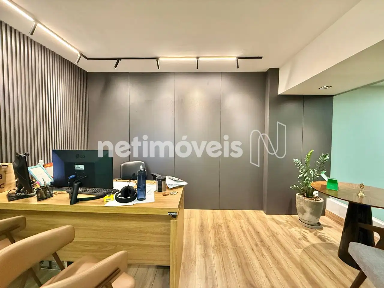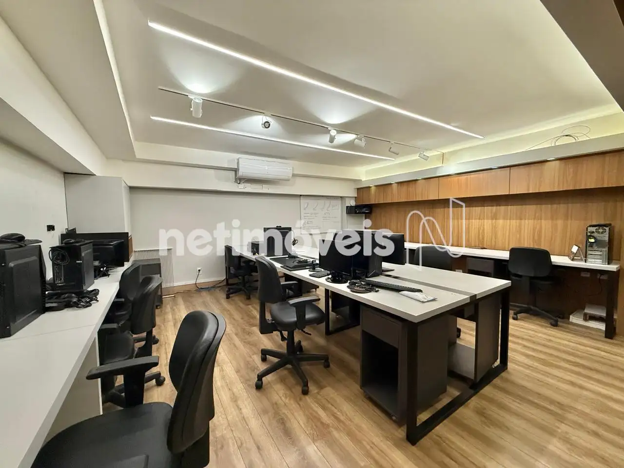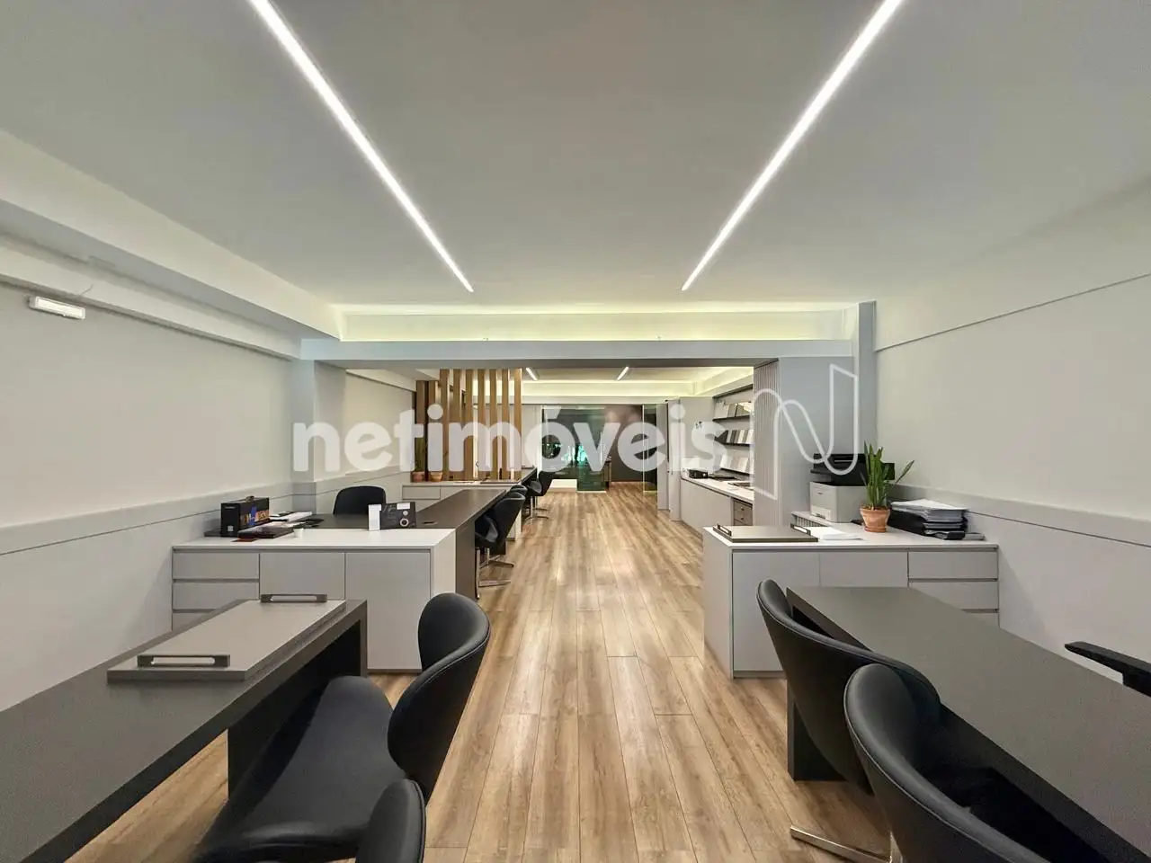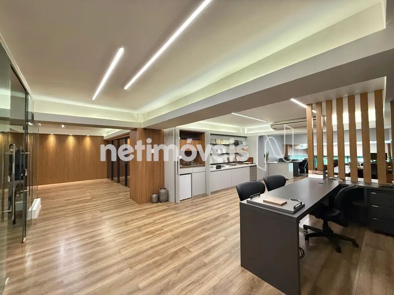 Mezanino com piso em vinílico, escritório, sala para reuniões e salão livre;