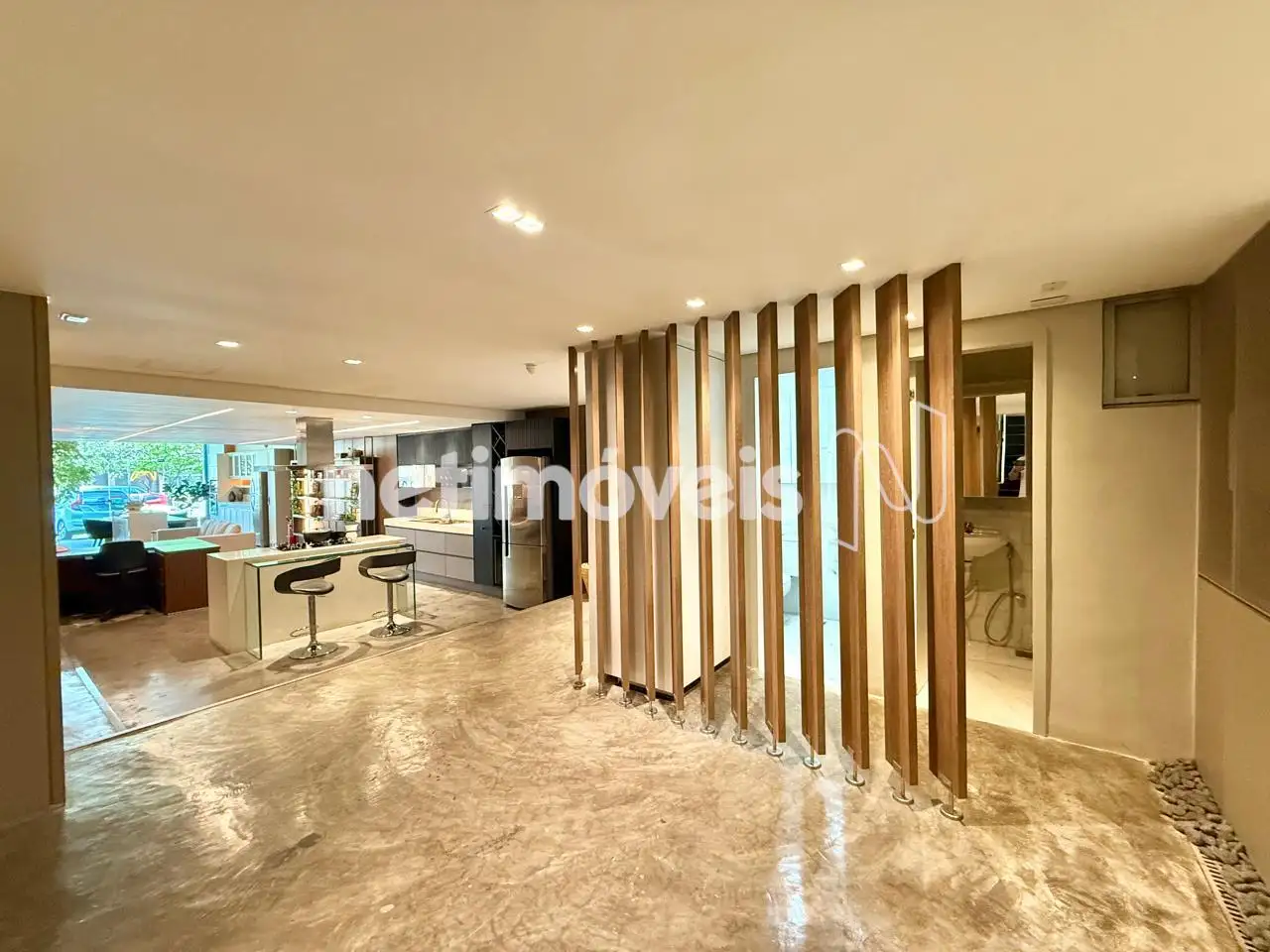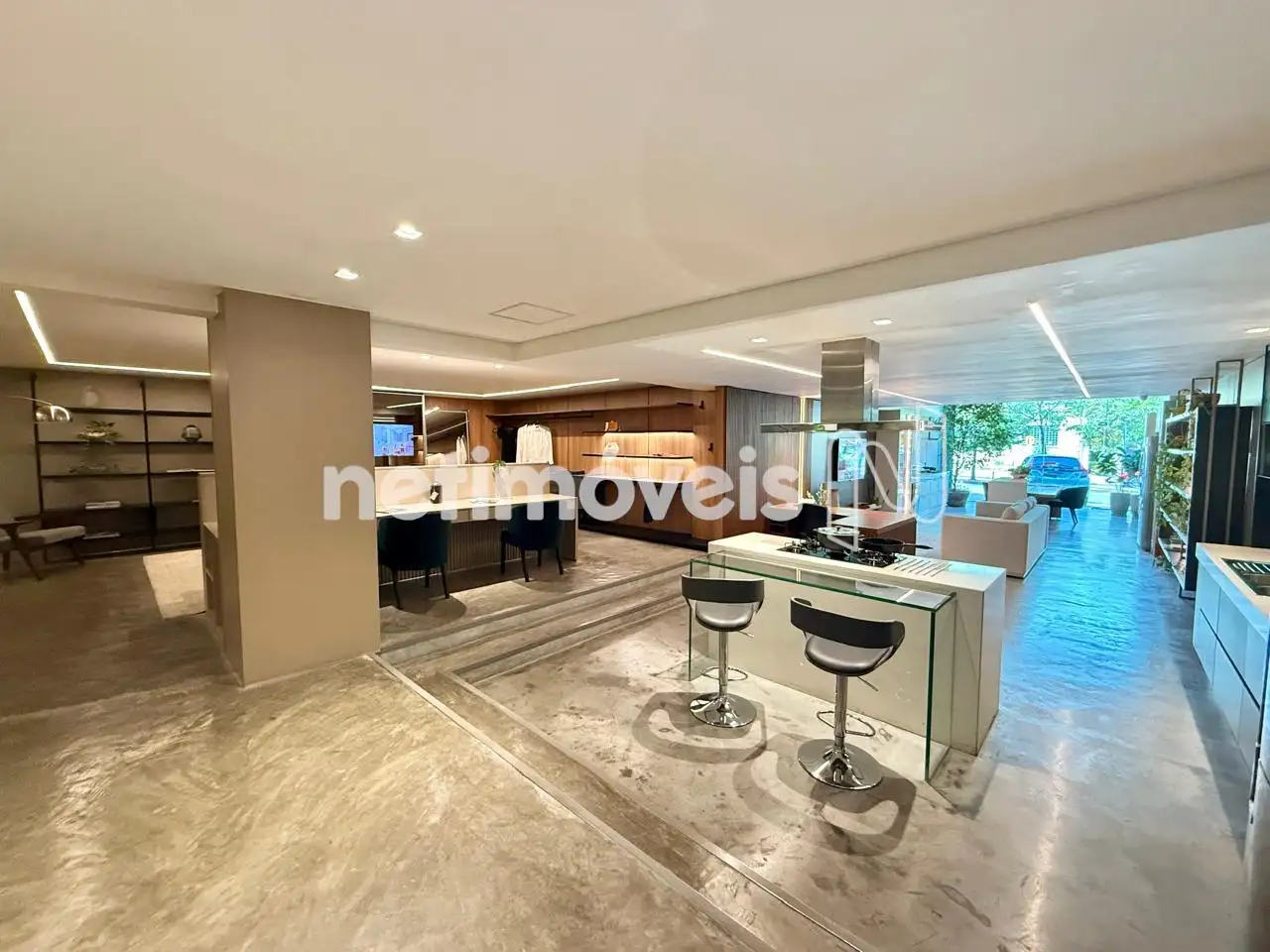 Piso no salão principal em cimento queimado, 02 banheiros, pequena copa;