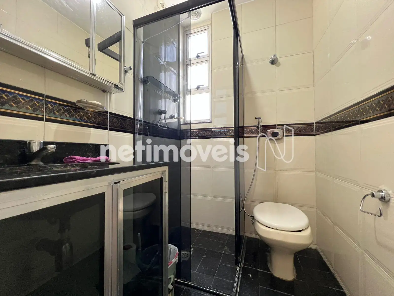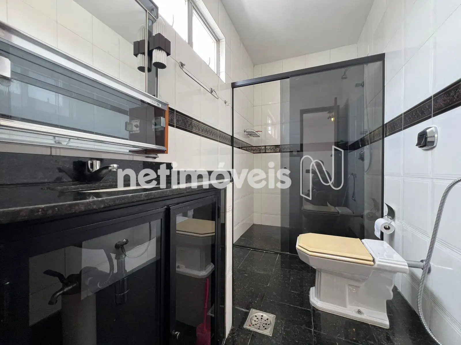 - Banho social com armário e box em vidro blindex;
