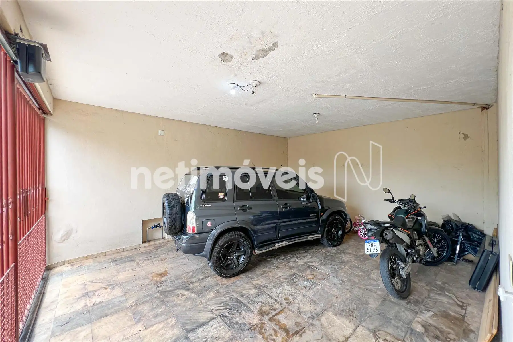Garagem coberta para 2 veículos grandes, com piso em pedra São Tomé, portões de metalon e acesso direto à casa.