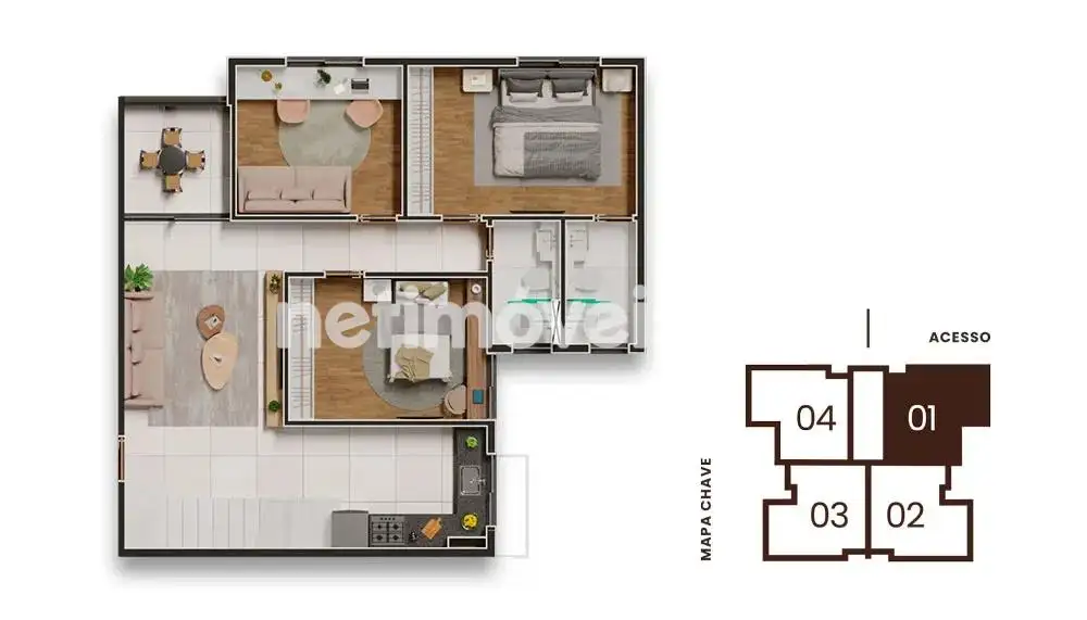 Apartamento: Aproximadamente 77 m² de área útil, composto por 01 sala ampla para 02 ambientes; 01 varanda; 03 quartos bons; 02 banheiros, sendo 01 suite 1 social, cozinha; área de serviços conjugada com cozinha.