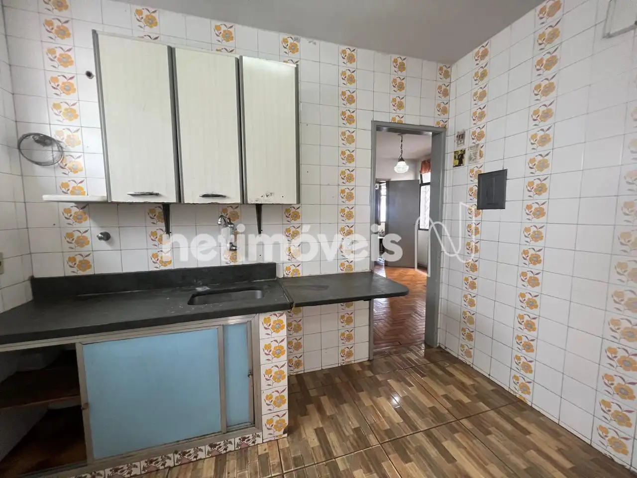 Cozinha com armários, piso em cerâmica.