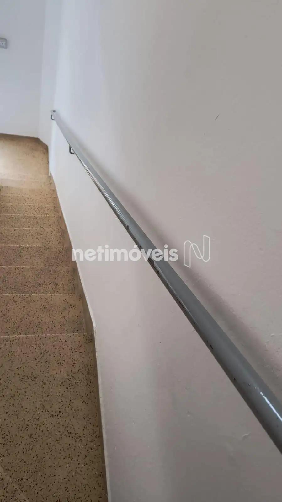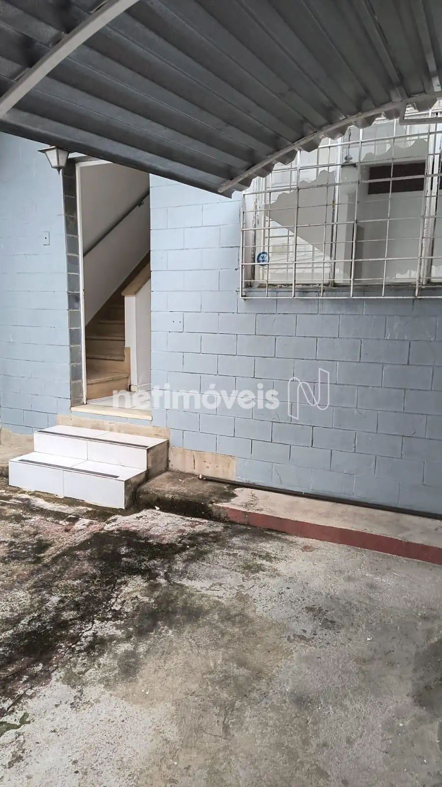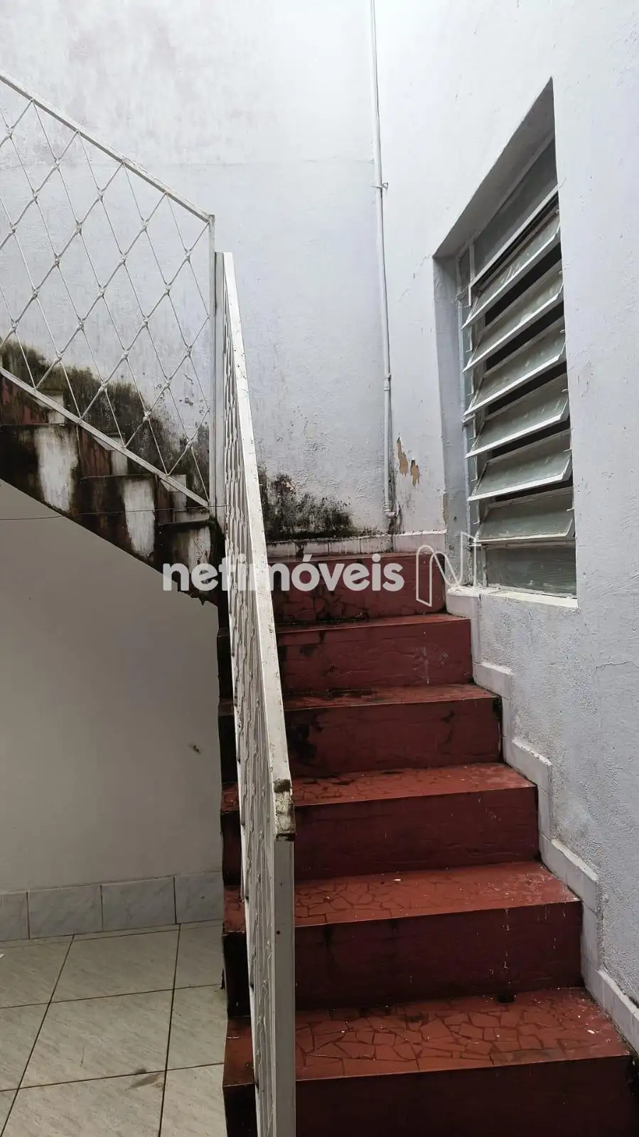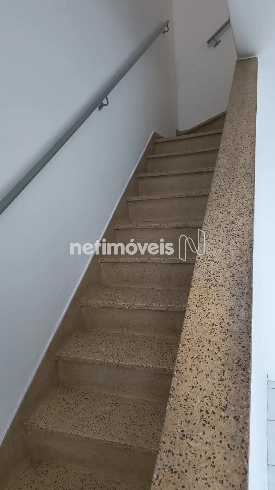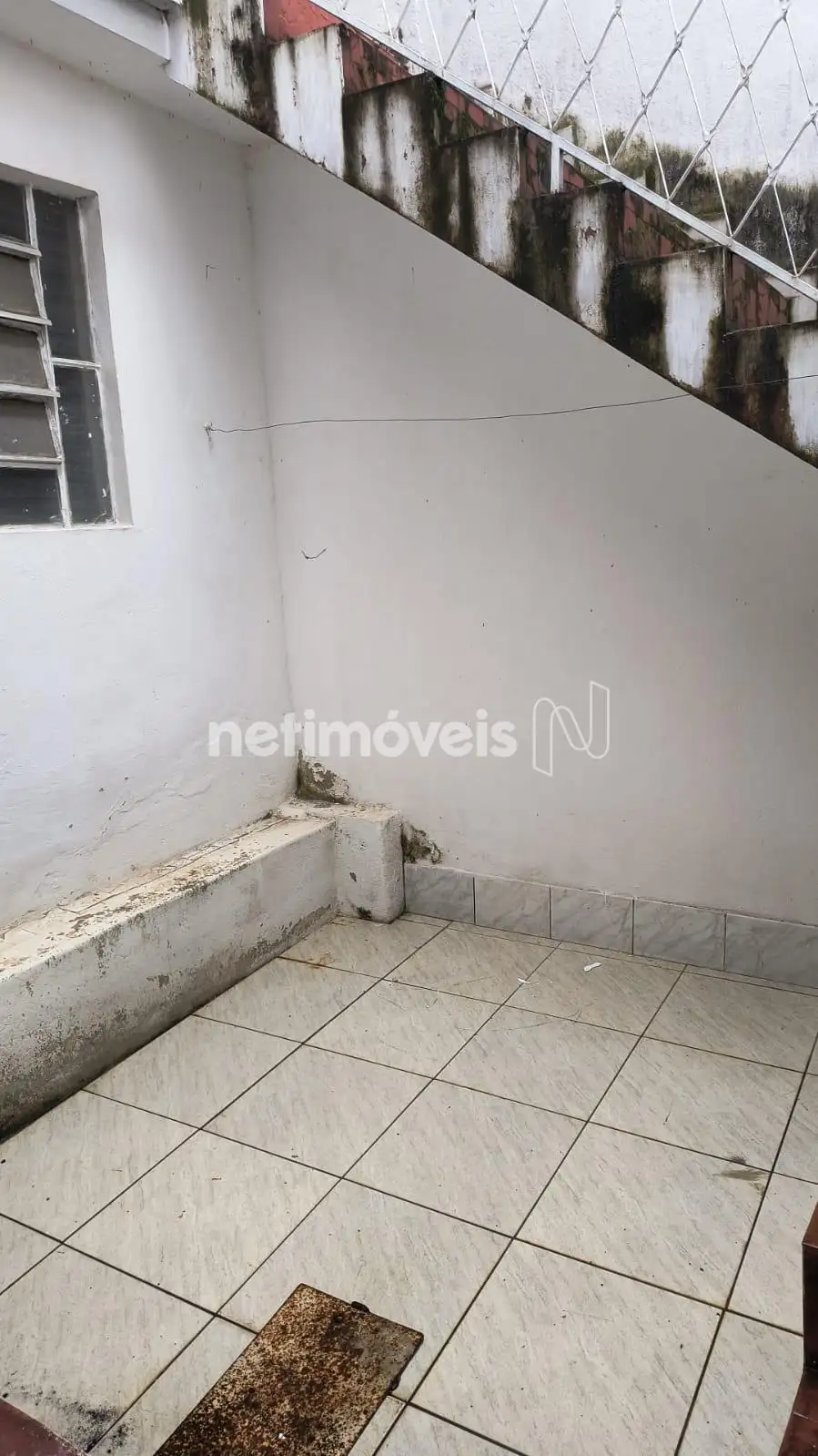 Escada que dá acesso a um terraço espaçoso, com uma varanda e uma parte descoberta.