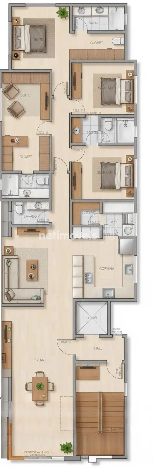 - 4 quartos sendo 2 suítes master com closet e 2 semi-suítes