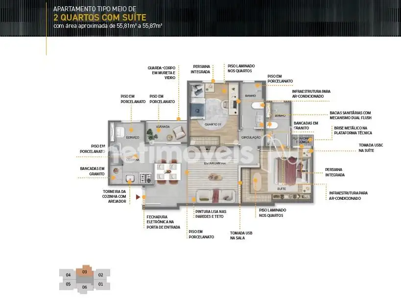 • 57 unidades de apartamento tipo ponta de 2 quartos com suíte com área aproximada de 58,51 m² a 58,58 m².