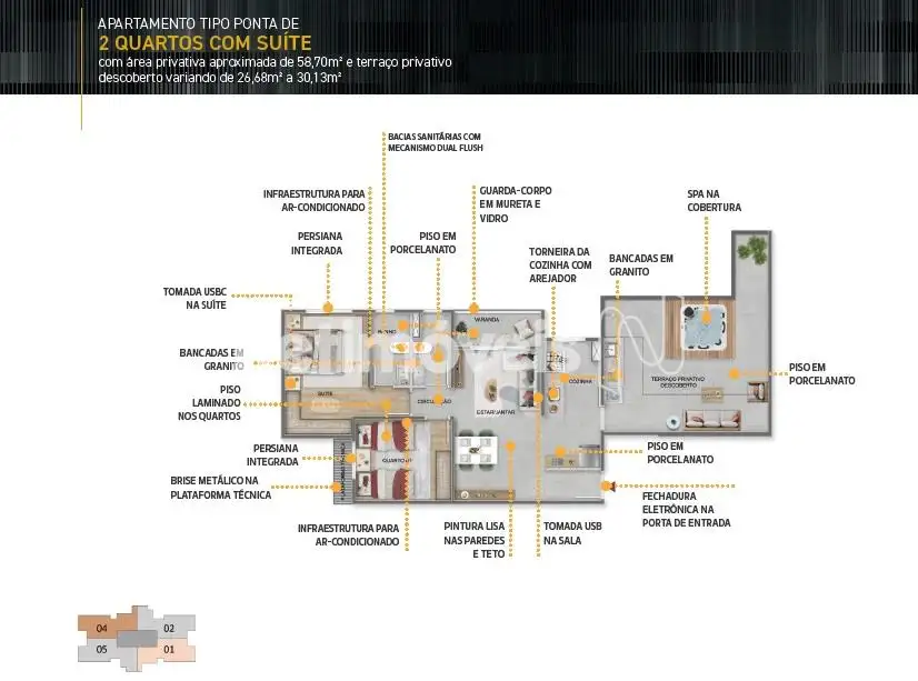 • 04 unidades de apartamento tipo ponta, de 2 quartos com suíte e área privativa. Com área aproximada variando de 58,51m² a 58,58m² e terraço descoberto variando de 4,73m² a 33m².