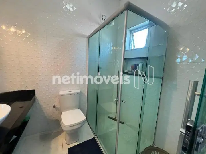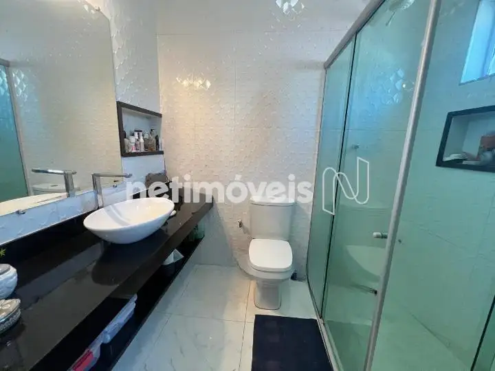 Banho social com exaustor; banho da suite com box em vidro blindex, bancada em granito.