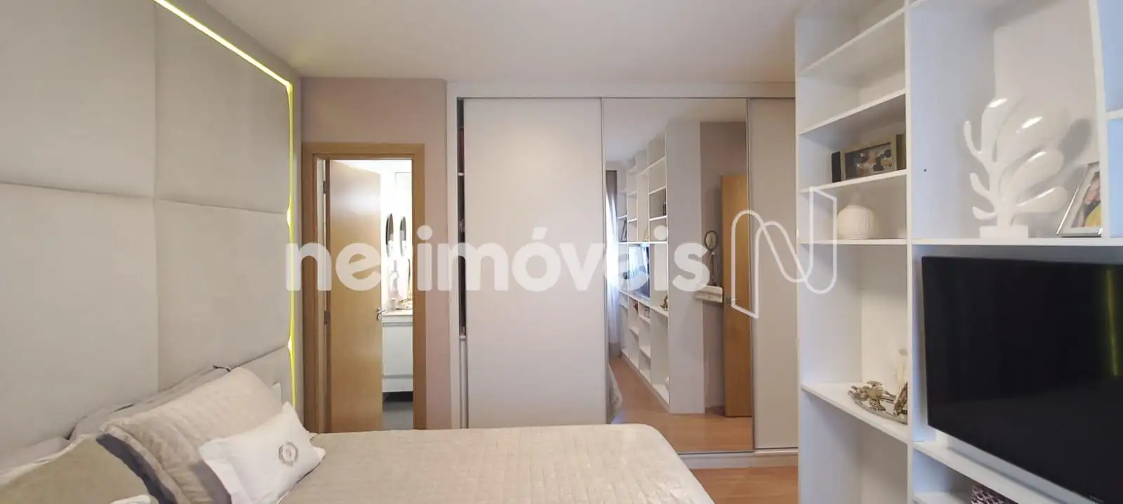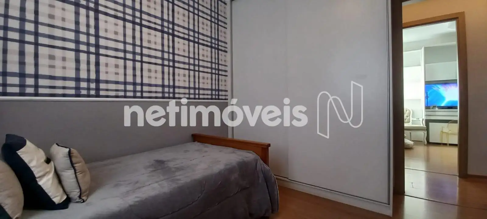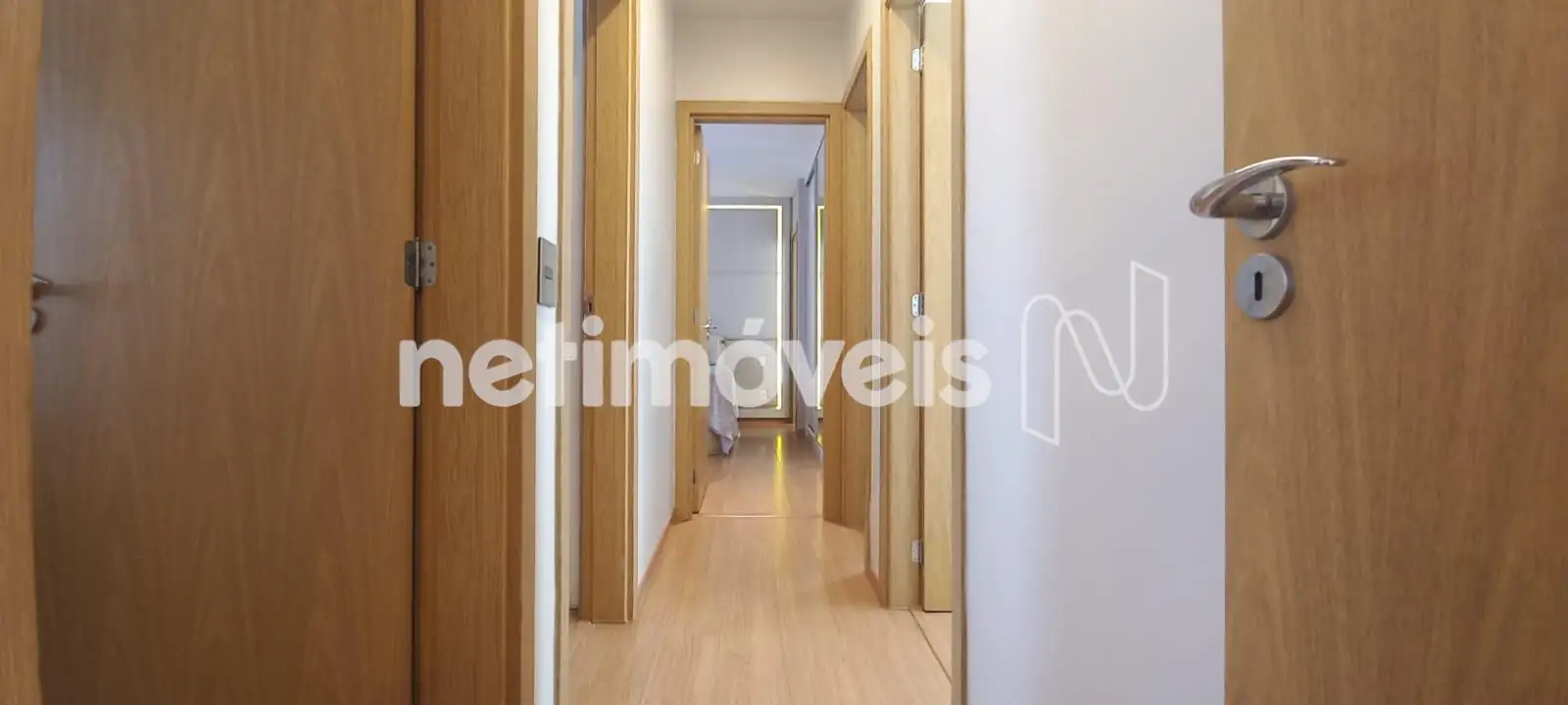 A área íntima conta com quatro quartos, todos com armários planejados, sendo um deles suíte. No corredor, um roupeiro adicional contribui para a otimização do espaço de armazenamento.