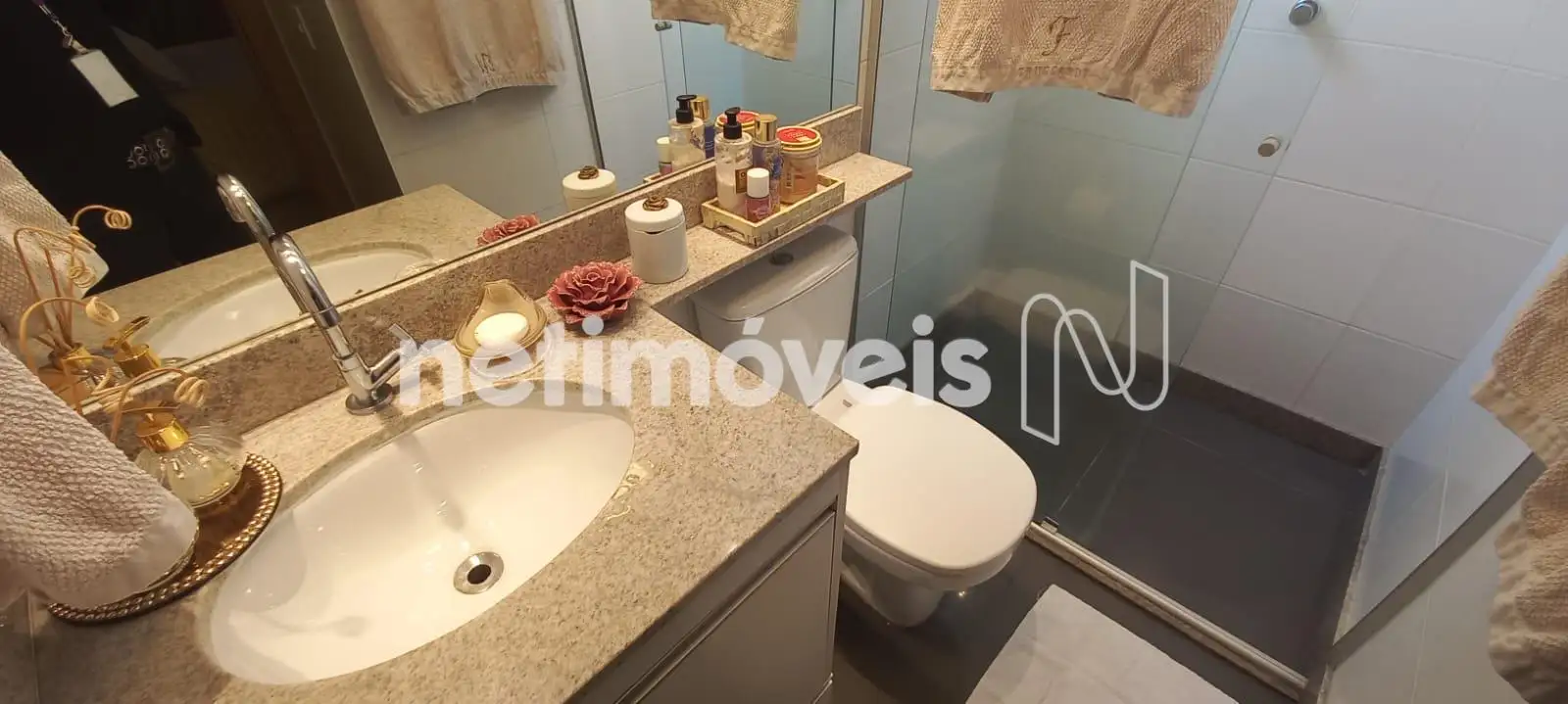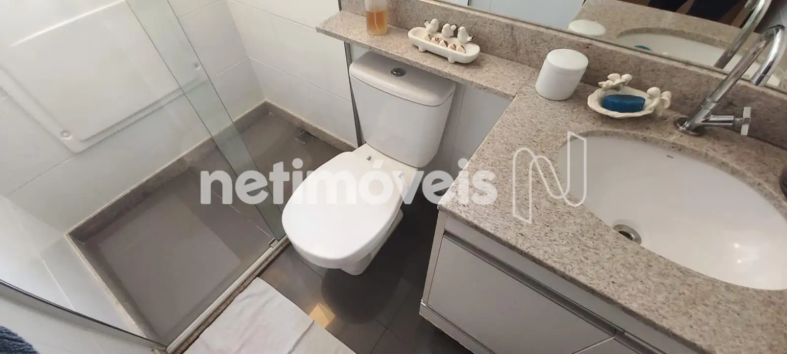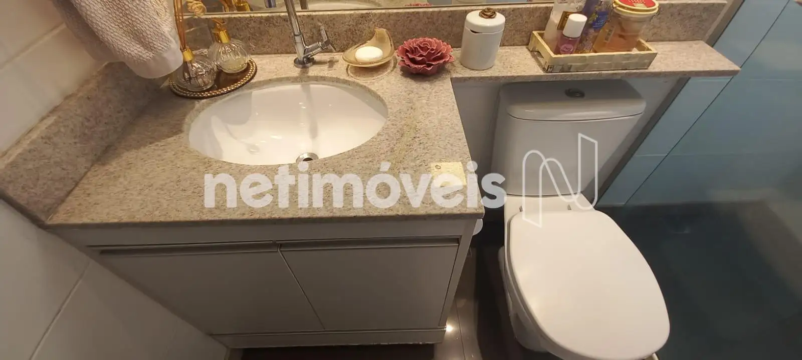 O banheiro social é completo, com armário, box em vidro temperado e espelho. Todos os banhos possuem piso e bancadas em granito, além de armários sob bancada.