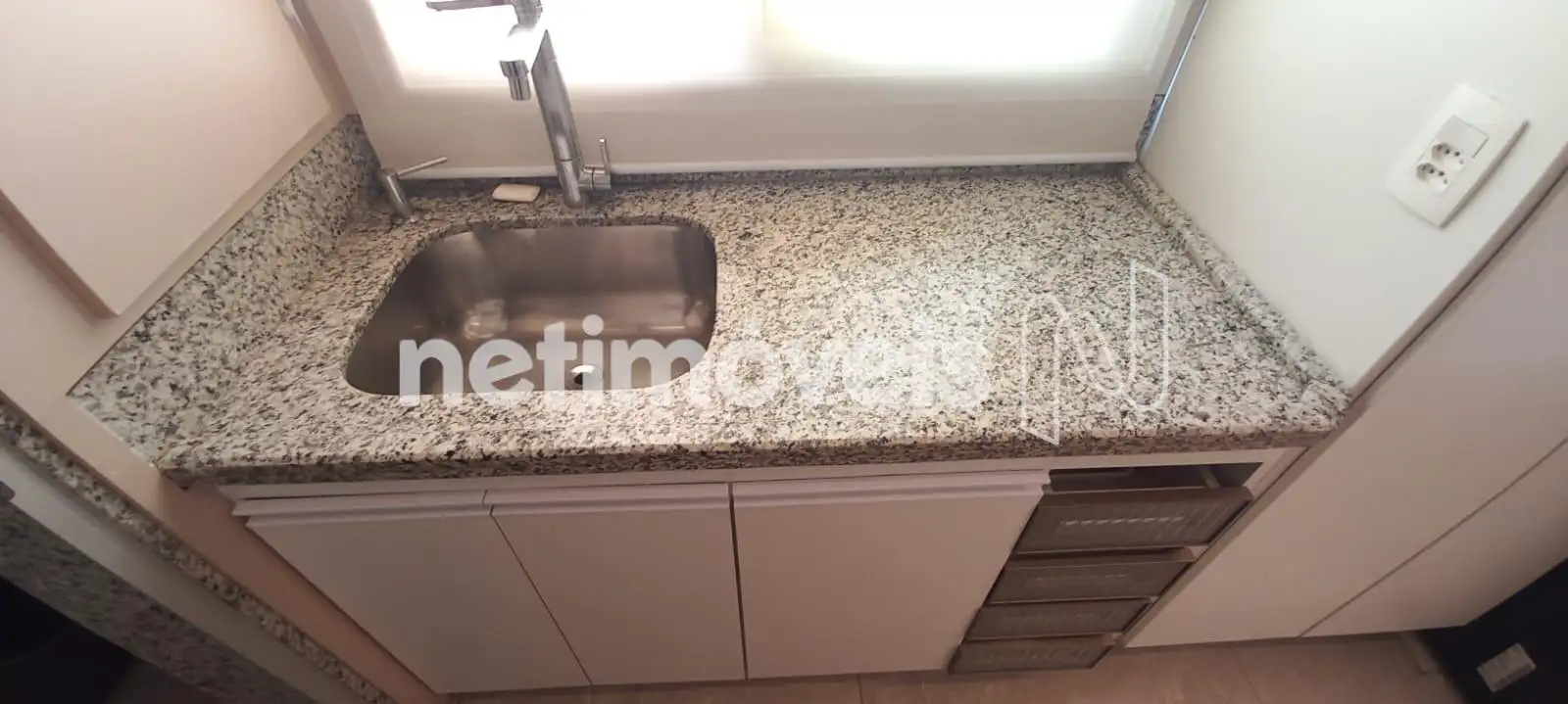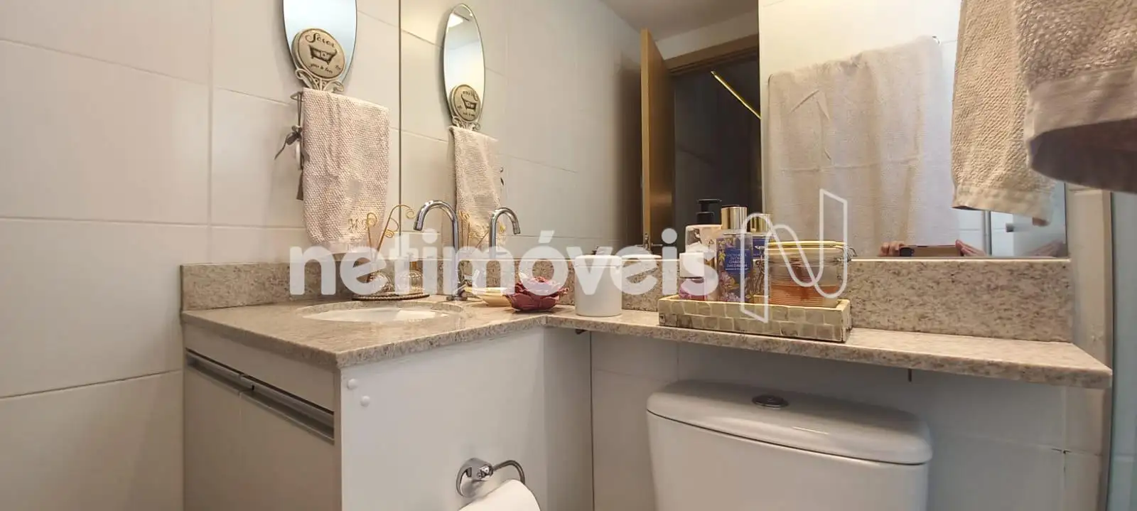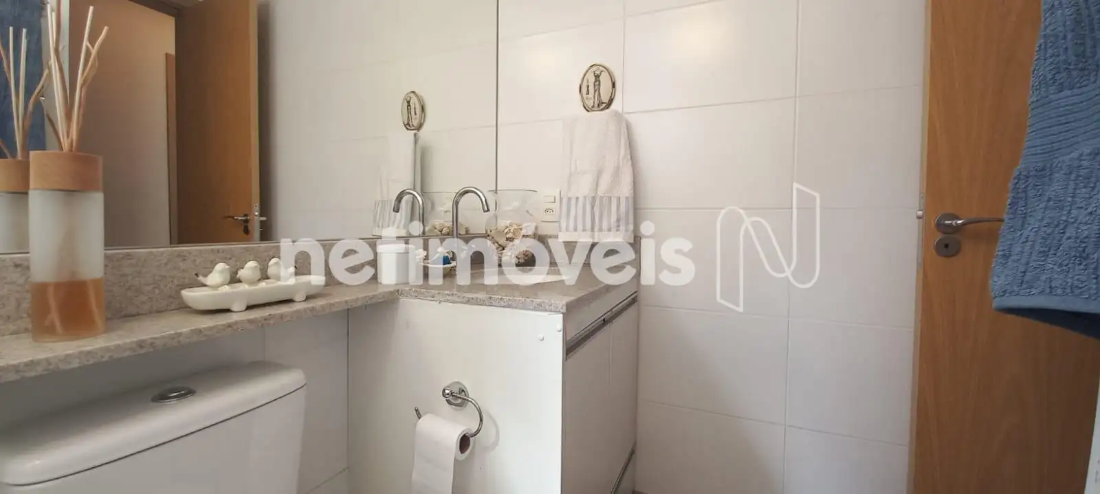 O banheiro social é completo, com armário, box em vidro temperado e espelho. Todos os banhos possuem piso e bancadas em granito, além de armários sob bancada.