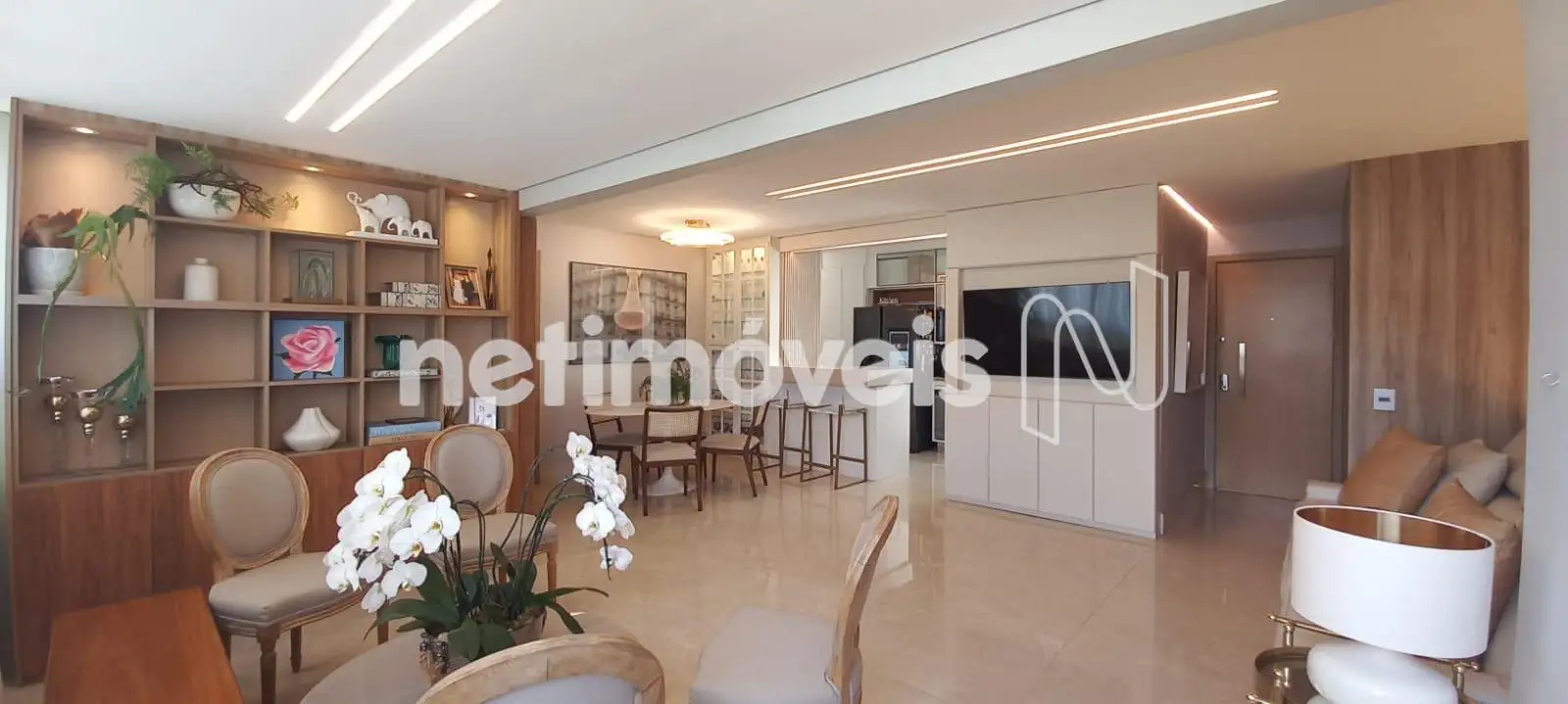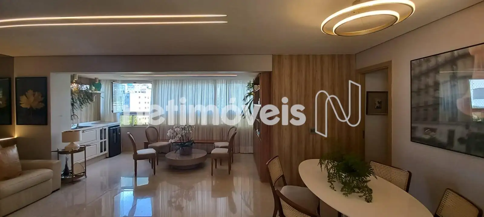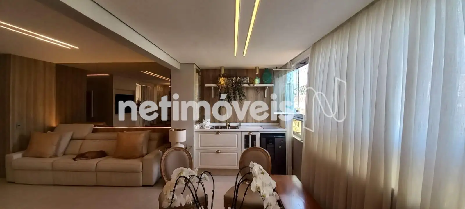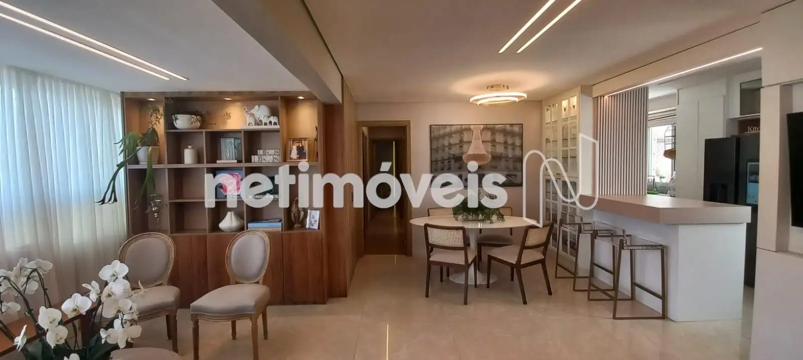 O apartamento apresenta uma sala de estar ampla, com integração harmoniosa à varanda, onde o espaço gourmet já está montado e pronto para uso. Os janelões valorizam a entrada de luz natural e proporcionam excelente ventilação cruzada. O projeto luminotécnico, aliado à cristaleira cuidadosamente planejada, cria um ambiente moderno, acolhedor e perfeito para receber.