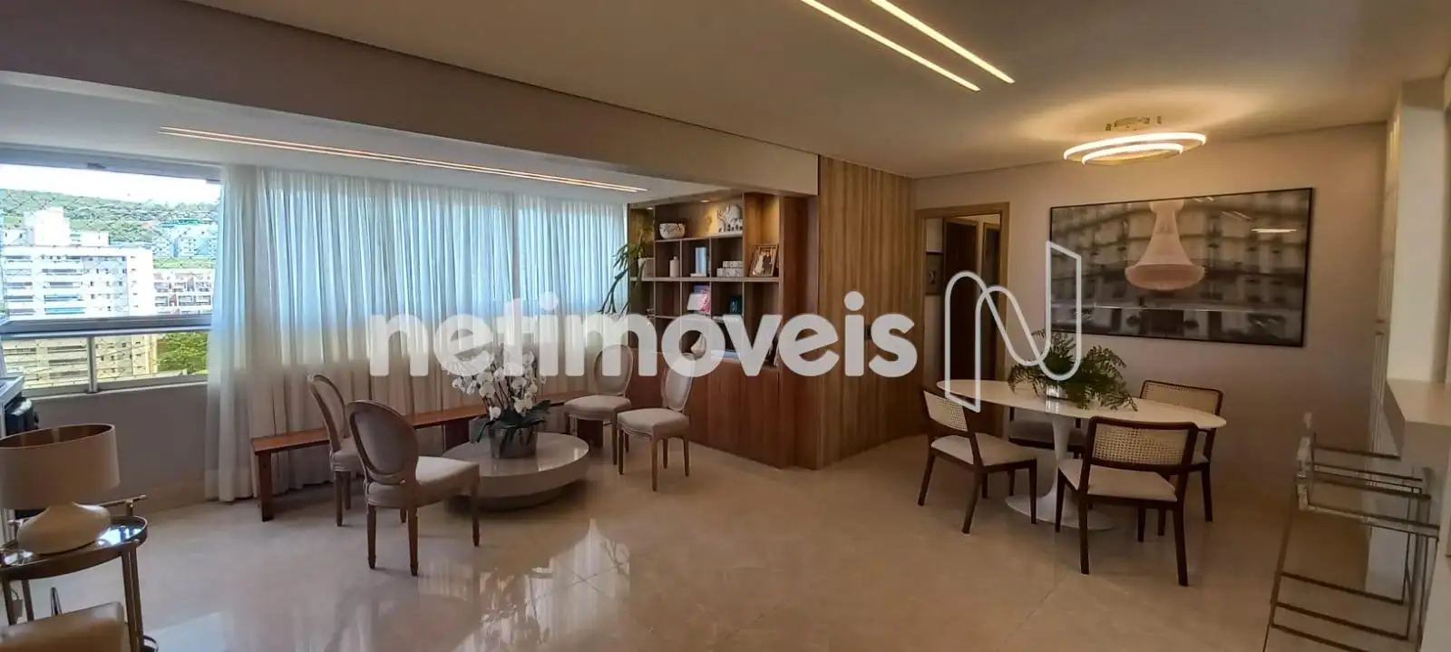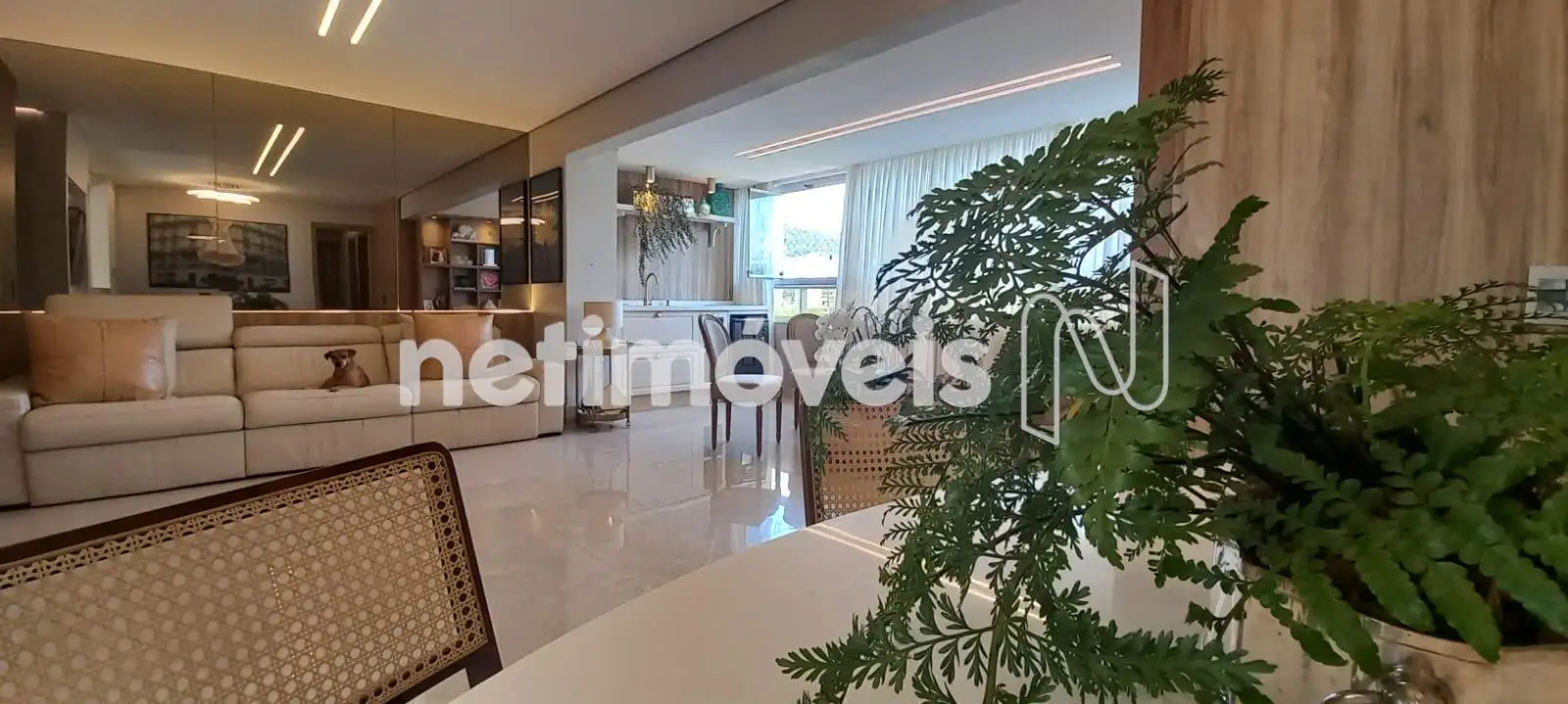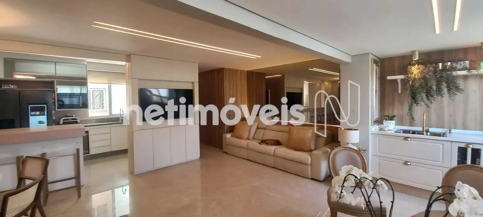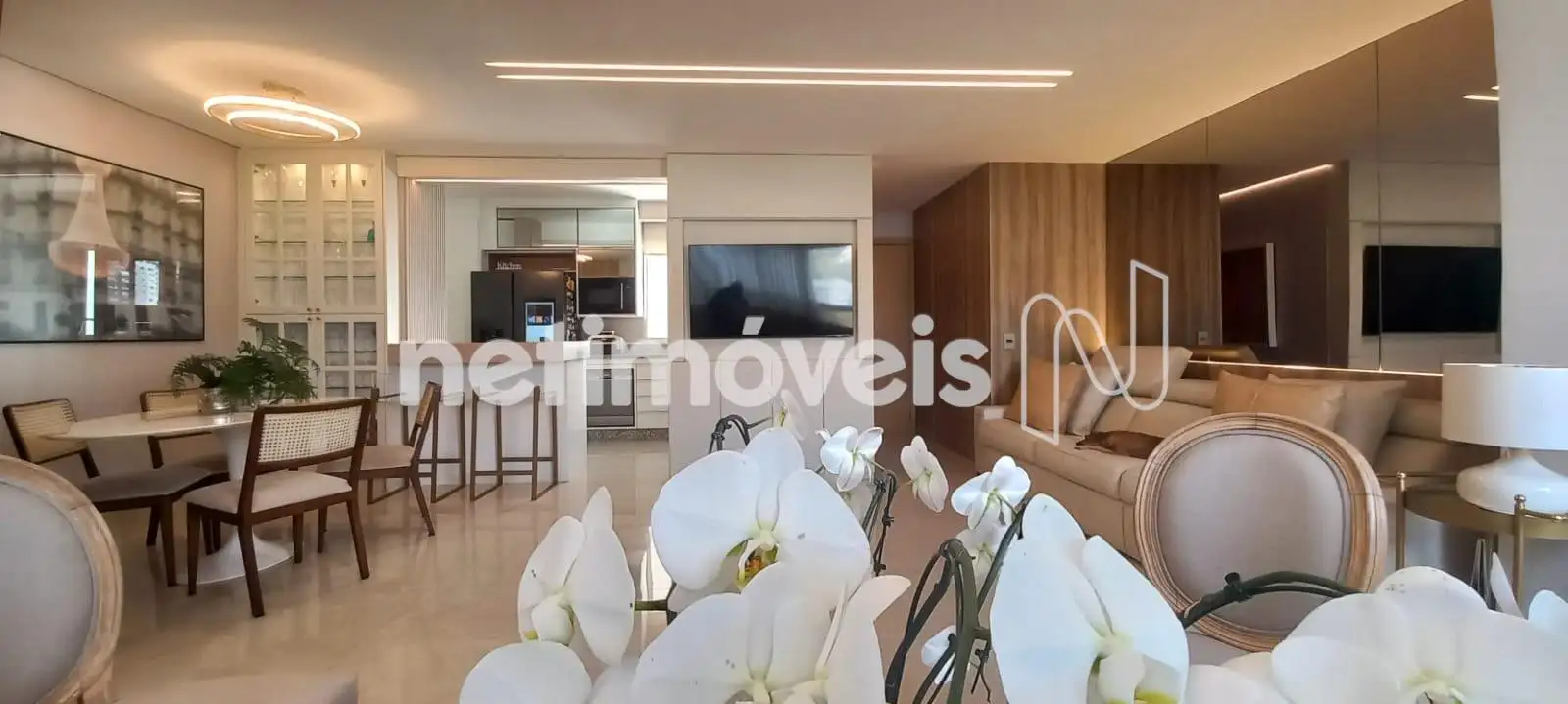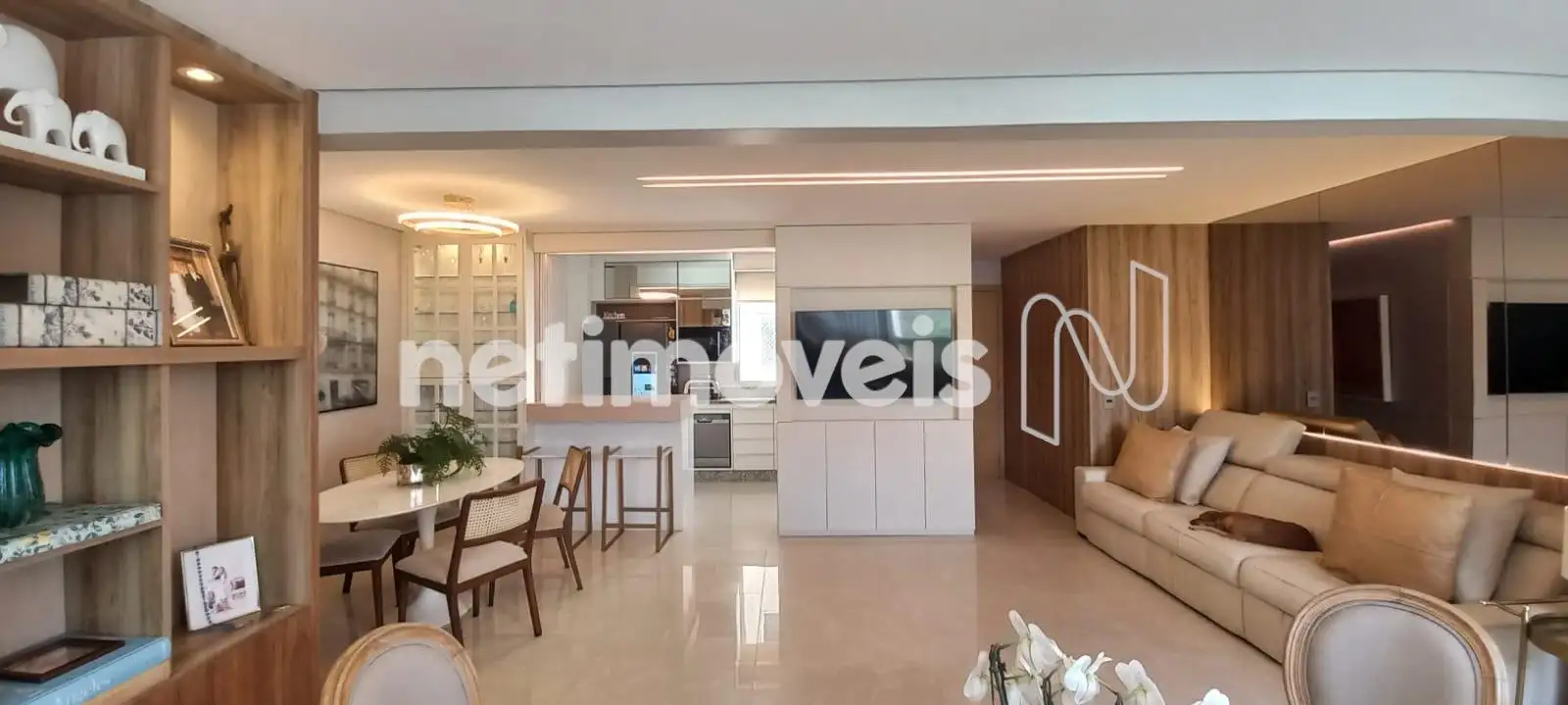 O apartamento apresenta uma sala de estar ampla, com integração harmoniosa à varanda, onde o espaço gourmet já está montado e pronto para uso. Os janelões valorizam a entrada de luz natural e proporcionam excelente ventilação cruzada. O projeto luminotécnico, aliado à cristaleira cuidadosamente planejada, cria um ambiente moderno, acolhedor e perfeito para receber.