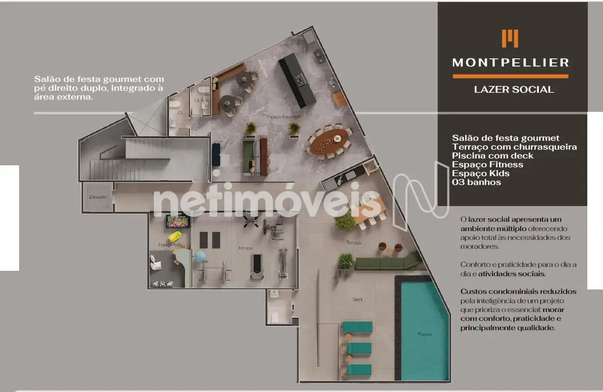 - Fachada 100% revestida em porcelanato, portaria virtual, hall decorado, elevadores,,salão de festas, espaço gourmet, terraço com churrasqueira a carvão, ,piscina com deck, espaço fitness, espaço kids, academia. ponto para carro elétrico, 02 vagas livres.
