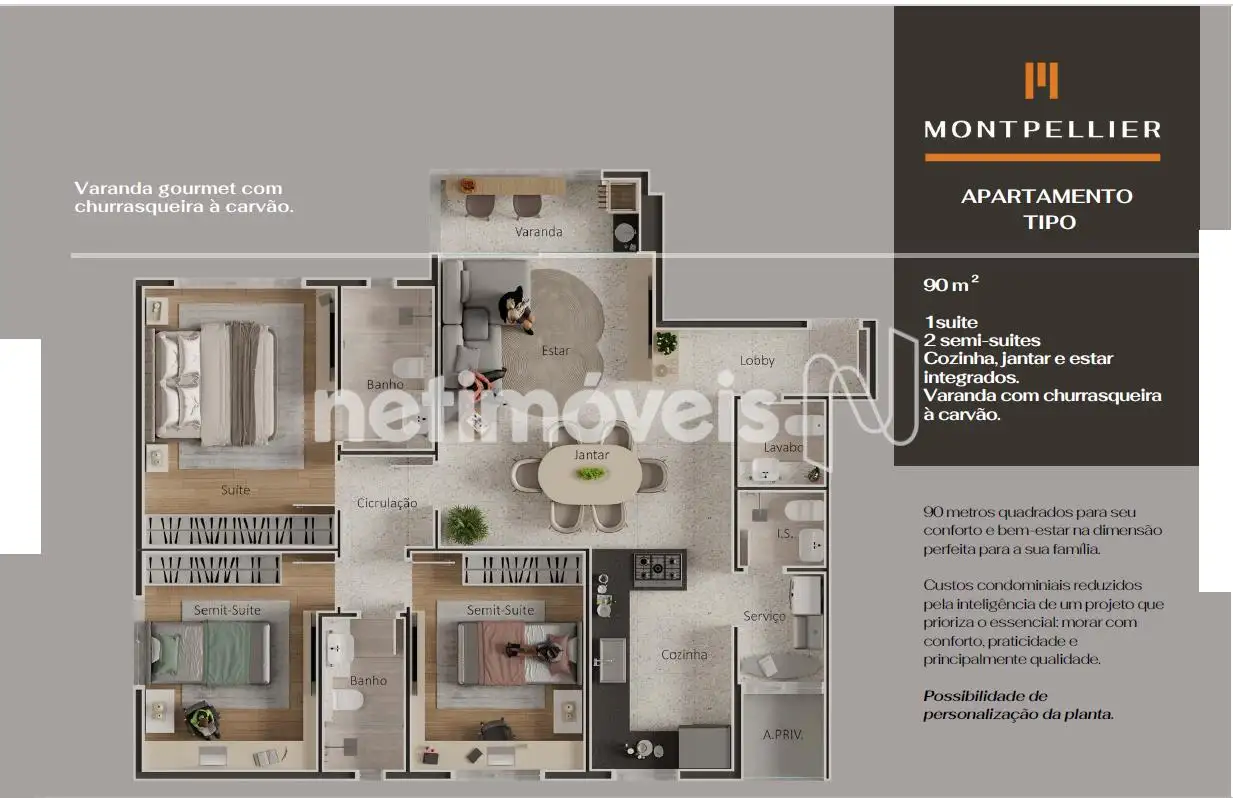 - 2 banhos sendo 1 suite e 2 semi-suites, piso e revestimento em porcelanato. Água quente em todos os banheiros, metais e louças Deca.