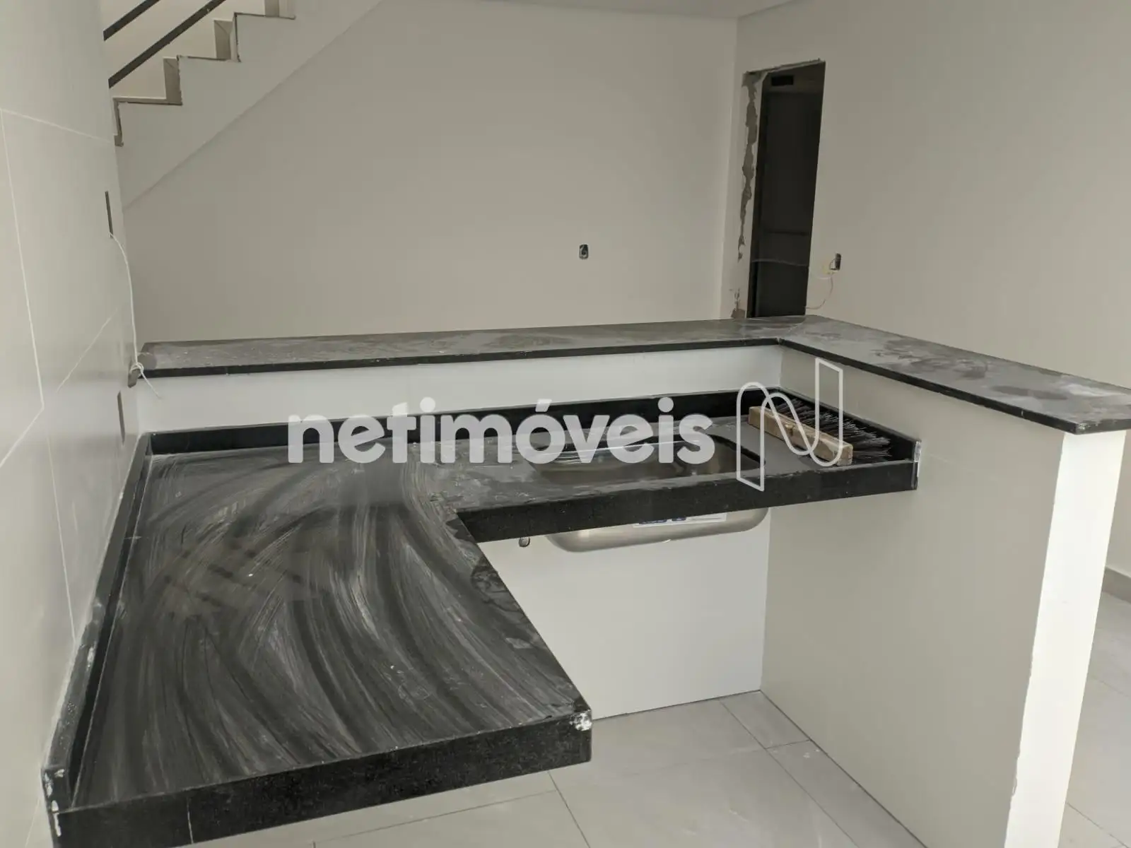 Cozinha em estilo americana, com bancadas em granito e piso em porcelanato;