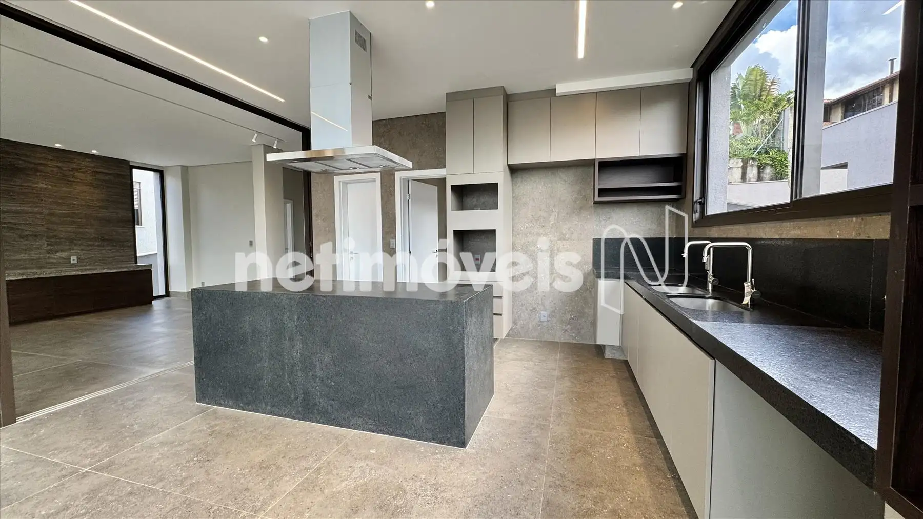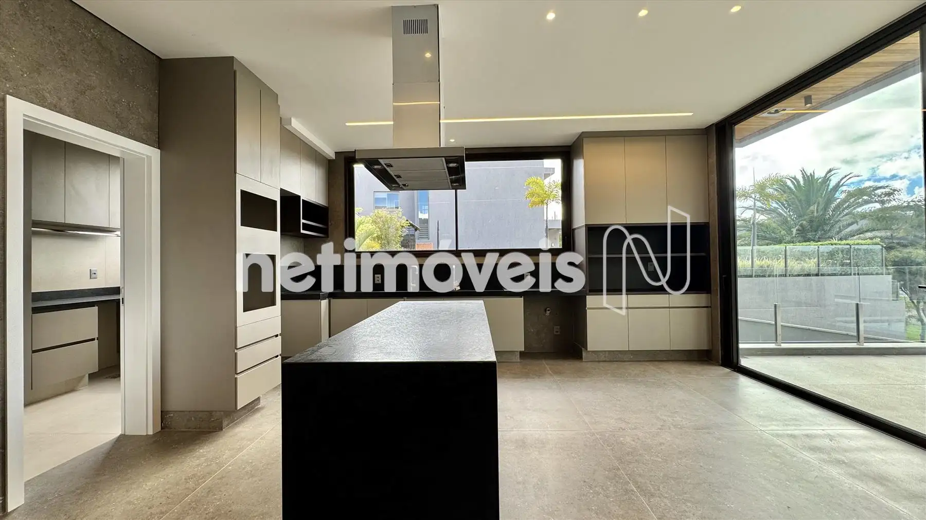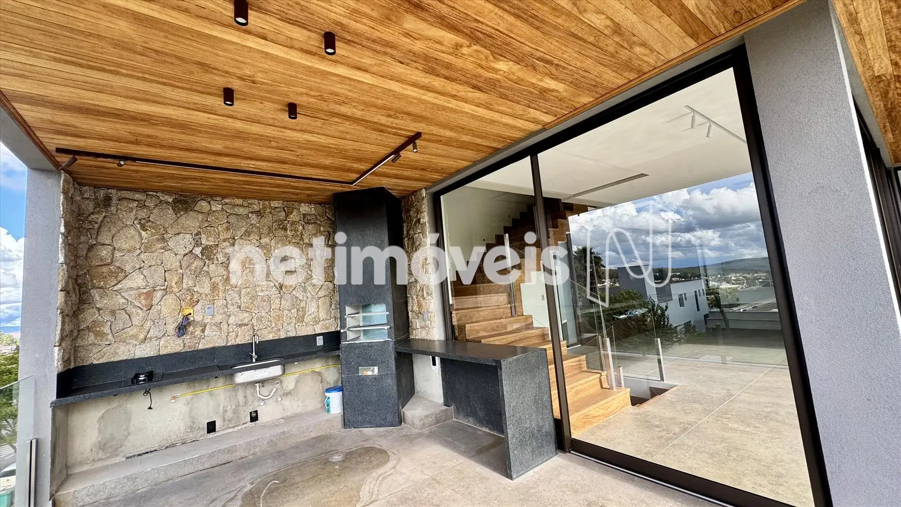 - Cozinha e área gourmet montadas com armários e eletrodomésticos,