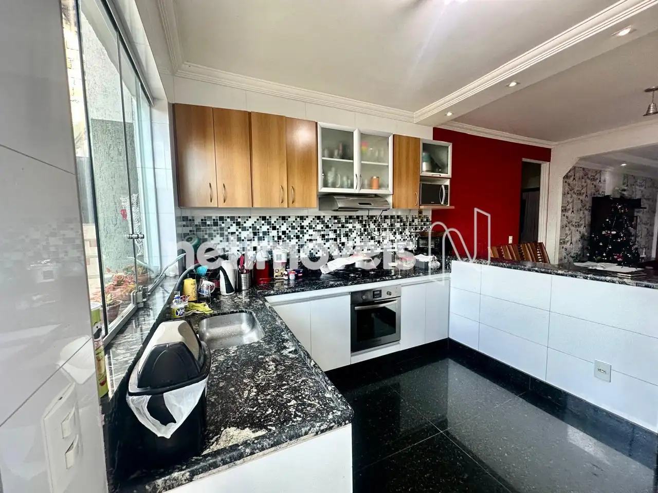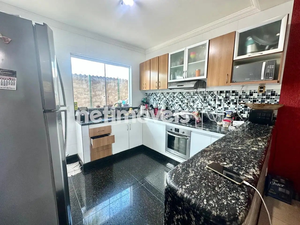 Cozinha americana com armários planejados, bancadas em granito e piso em porcelanato