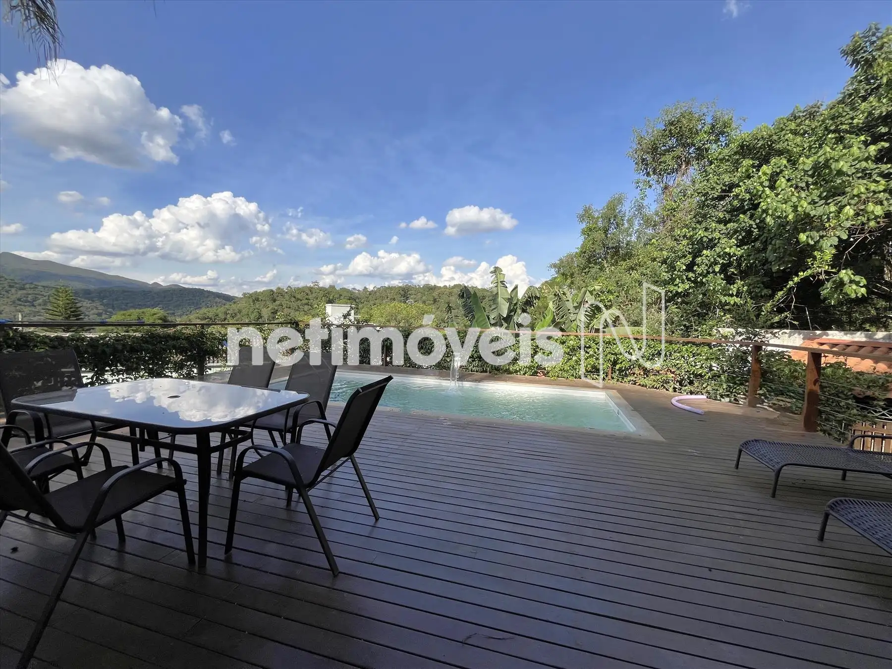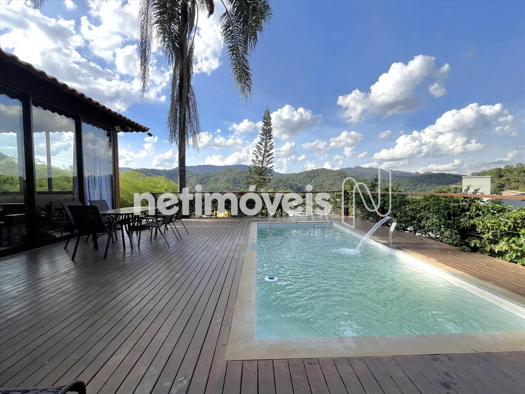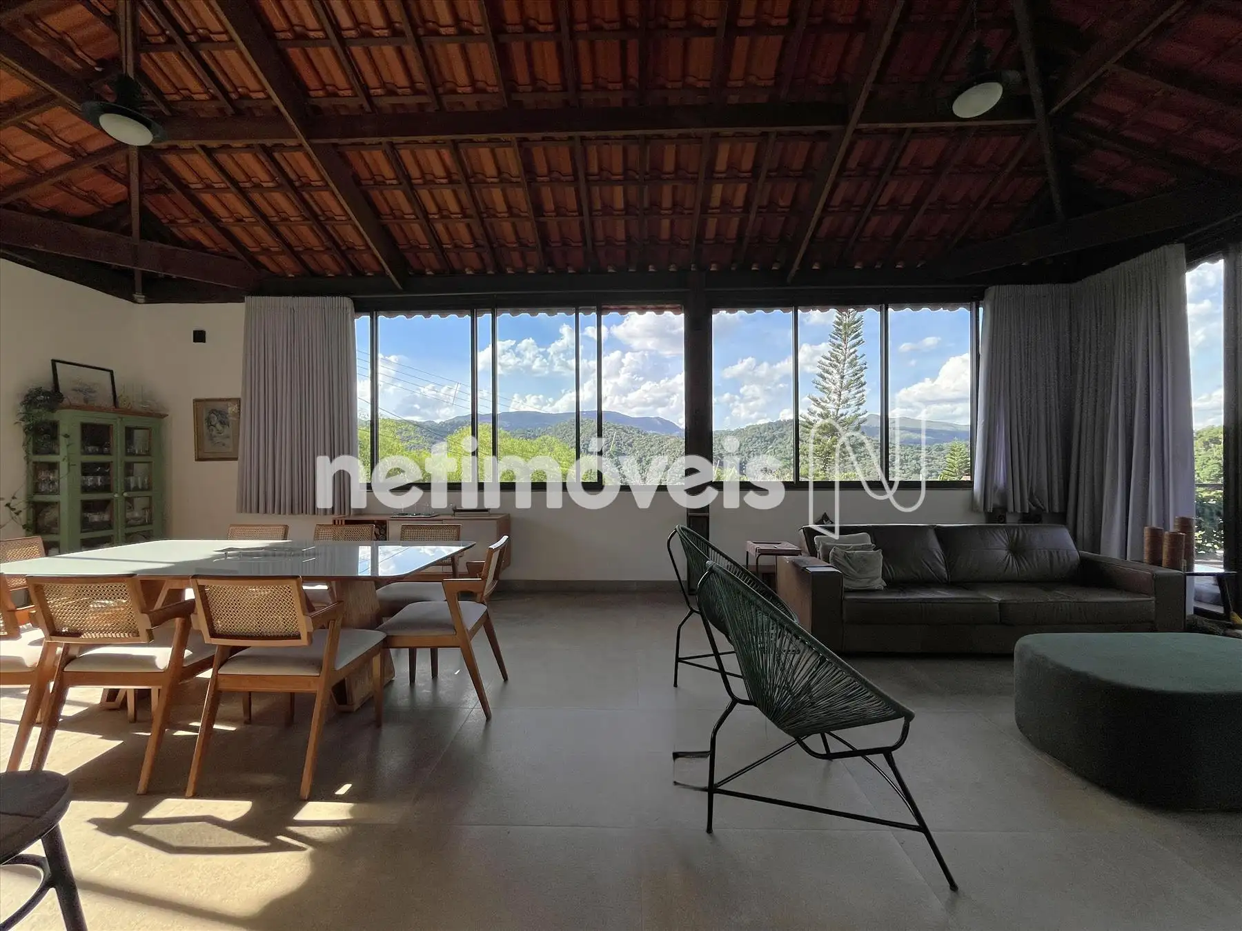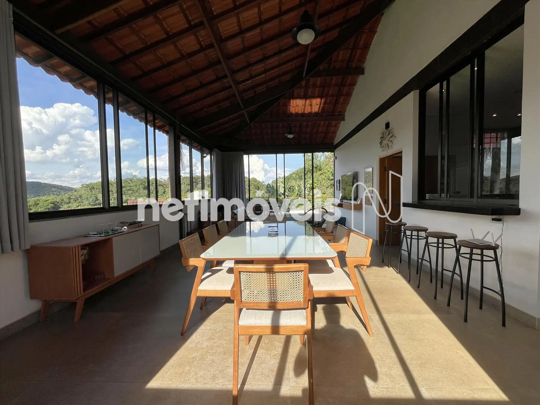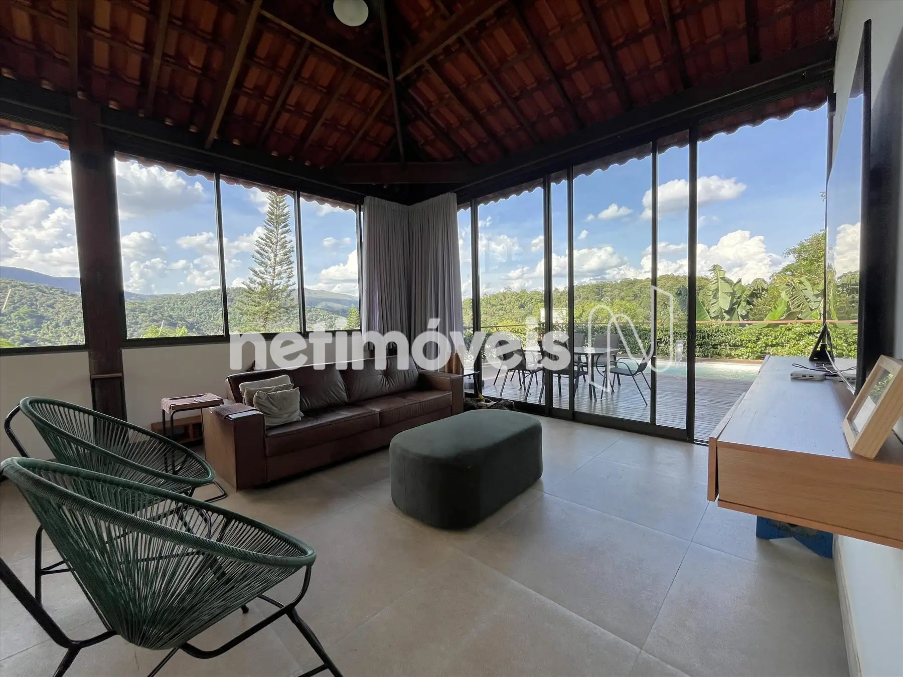 Salão com pé direito duplo integrado a cozinha gourmet integrada a varandão gourmet com acesso ao deck de madeira na área da piscina com cascata. Dois lavabos um na área social interna e outro para área molhada. De todos esses ambientes se aprecia a vista bela para o vale, as montanhas e para mata.