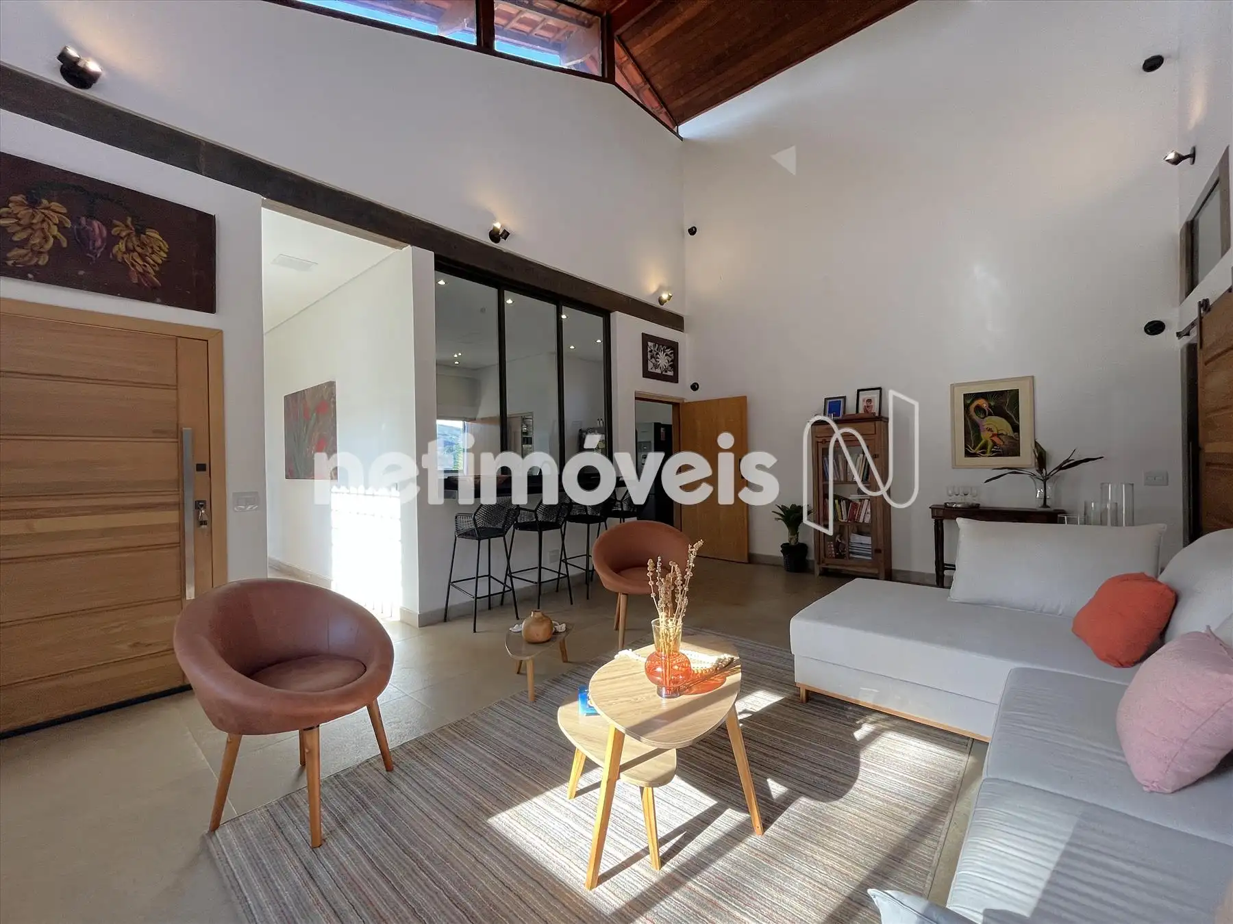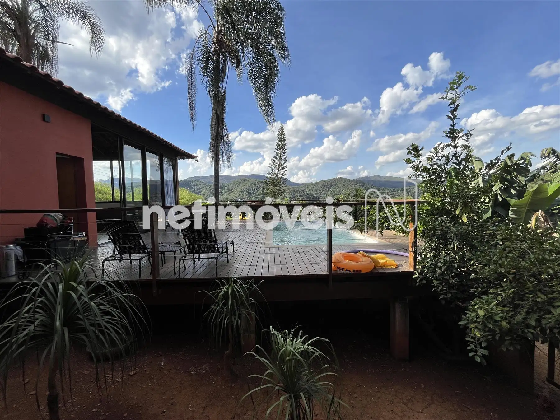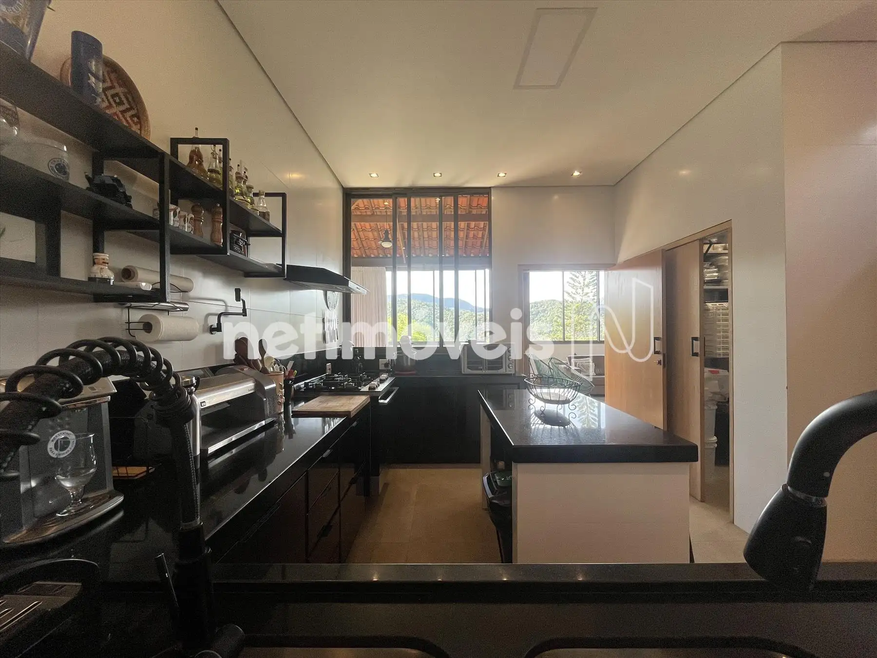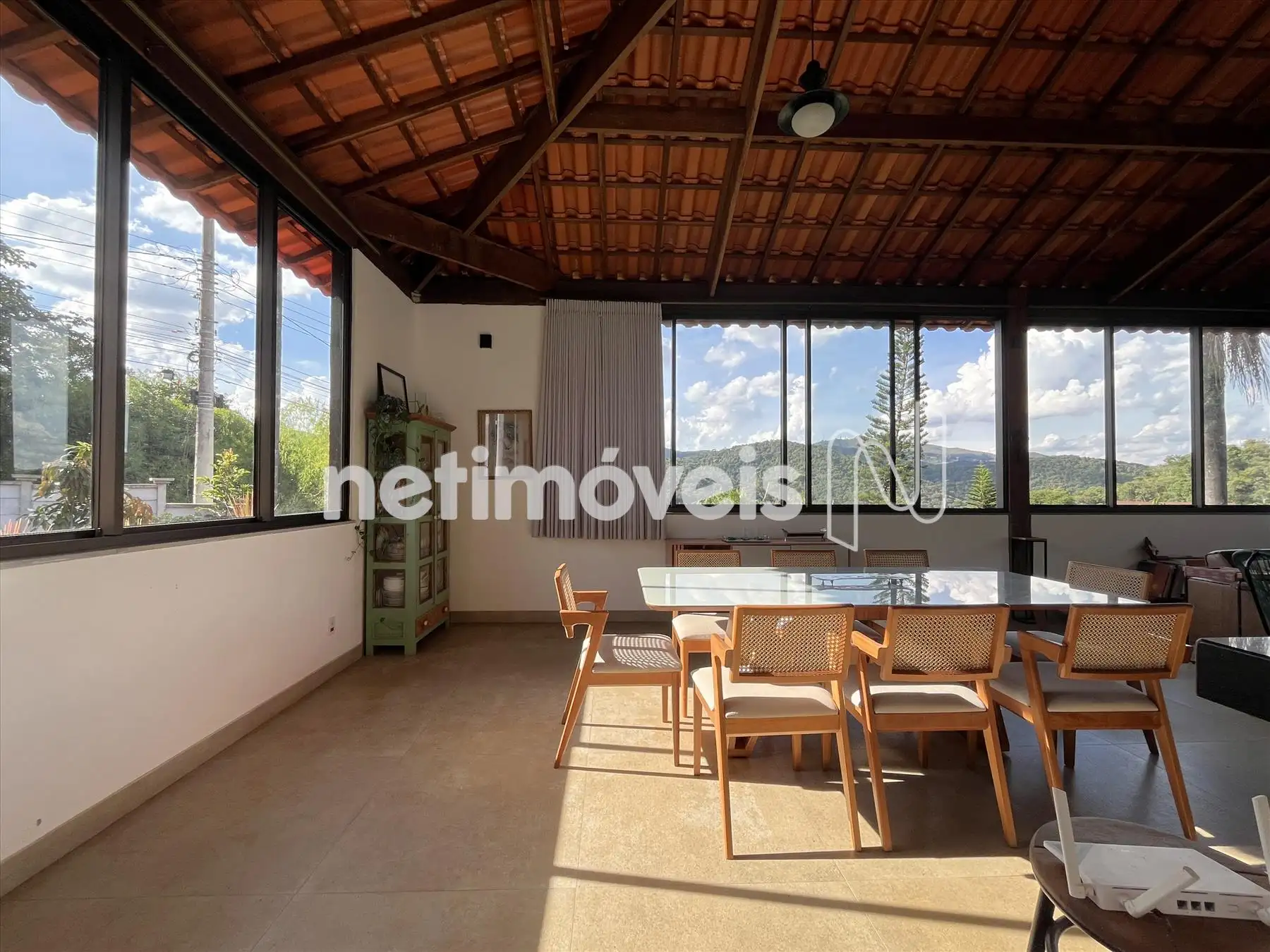 Salão com pé direito duplo integrado a cozinha gourmet integrada a varandão gourmet com acesso ao deck de madeira na área da piscina com cascata. Dois lavabos um na área social interna e outro para área molhada. De todos esses ambientes se aprecia a vista bela para o vale, as montanhas e para mata.
