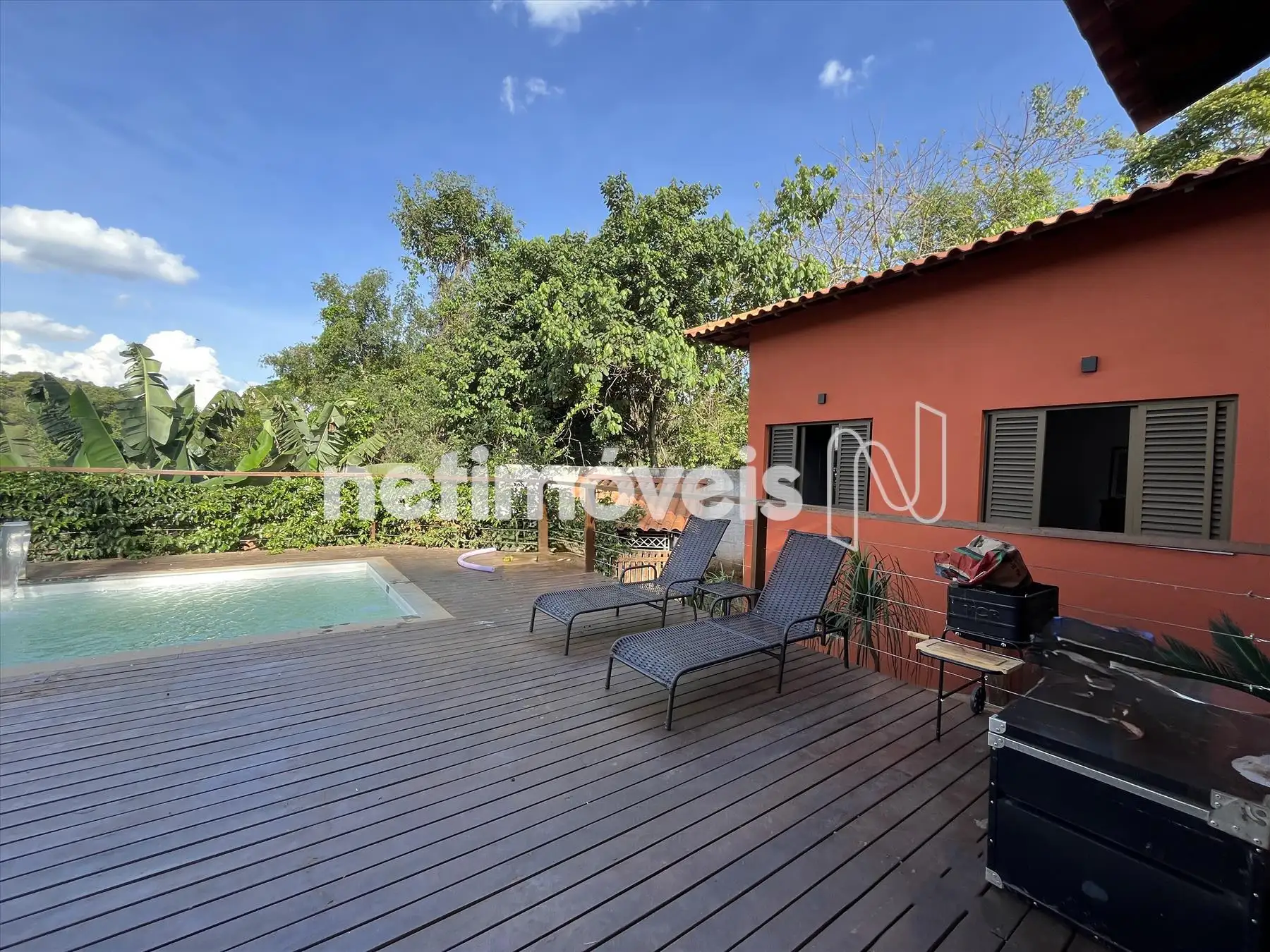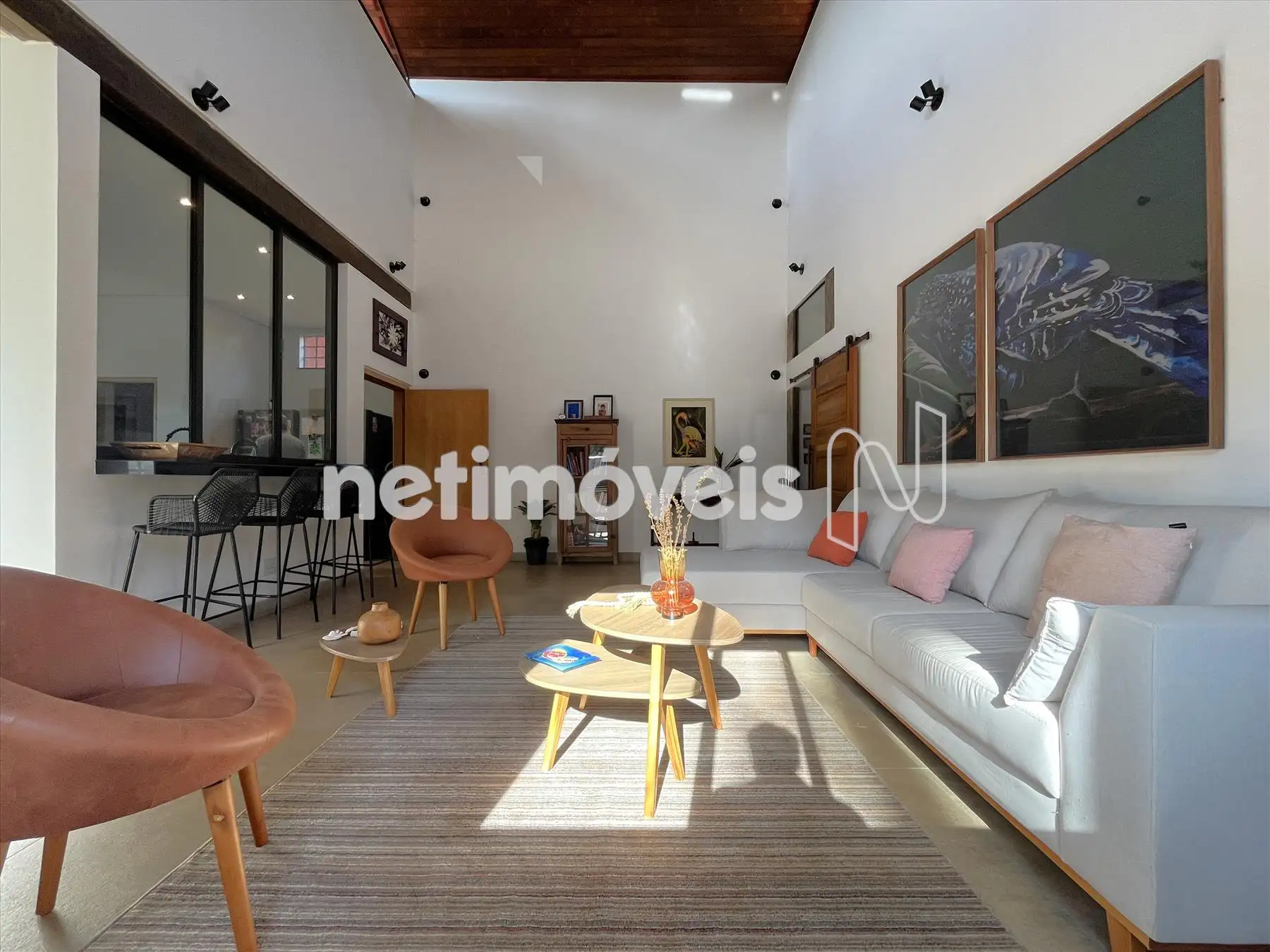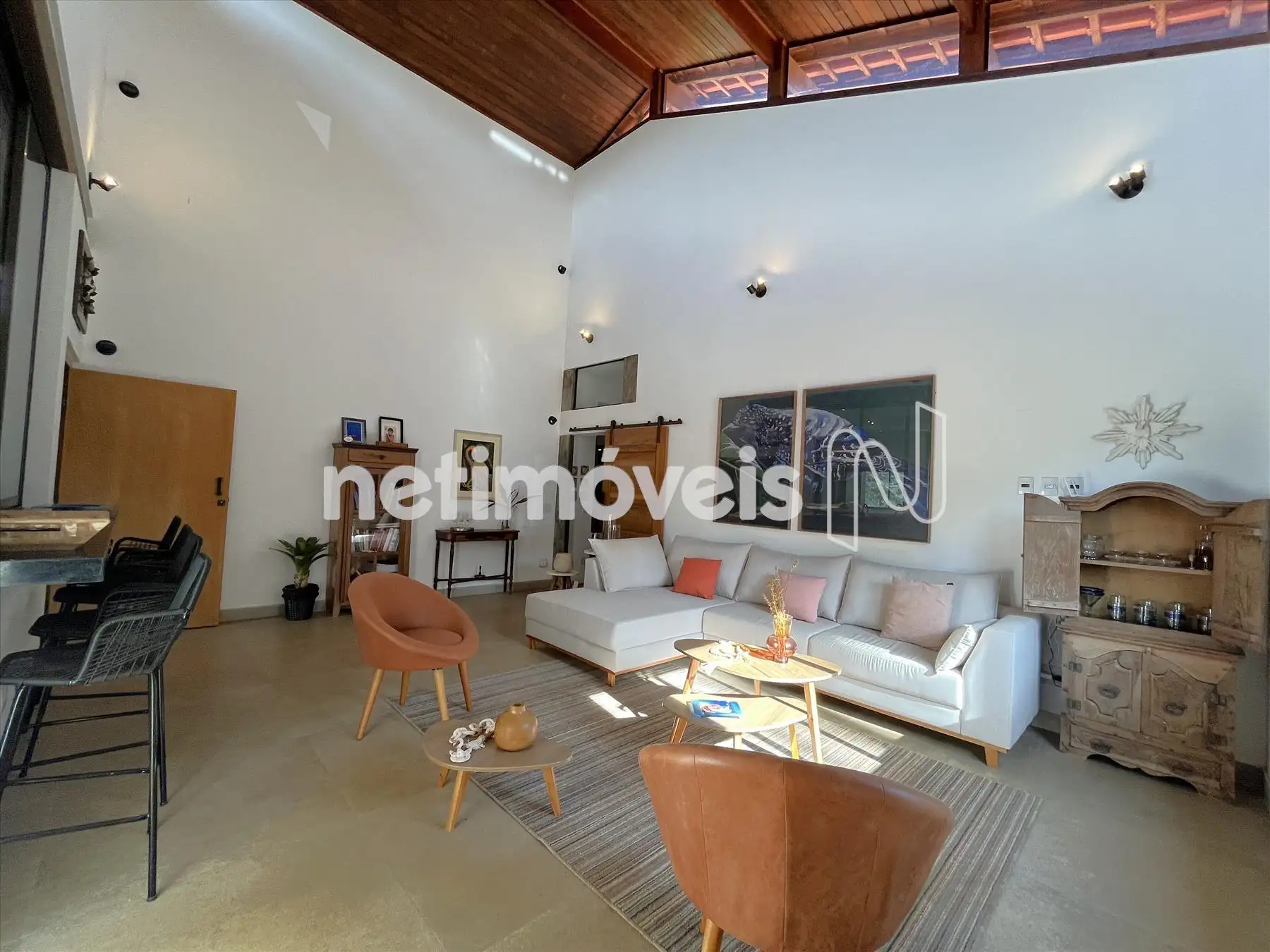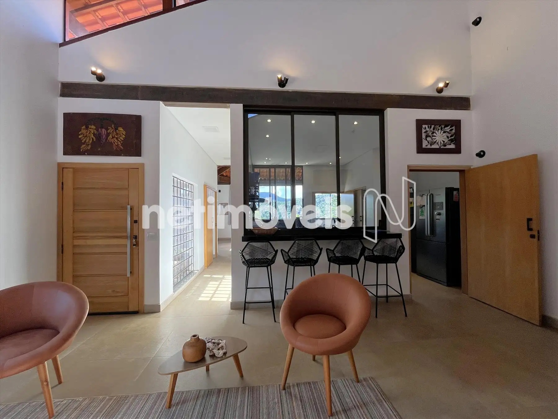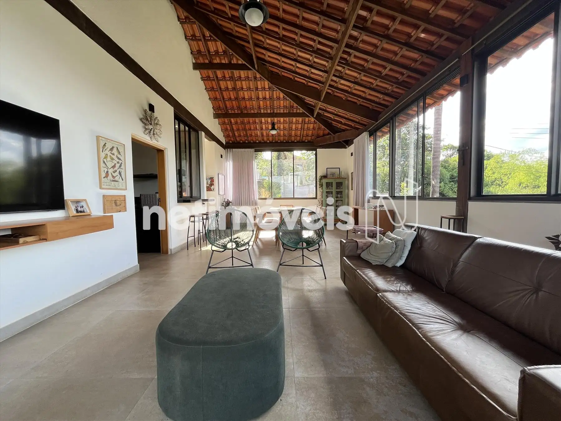 Salão com pé direito duplo integrado a cozinha gourmet integrada a varandão gourmet com acesso ao deck de madeira na área da piscina com cascata. Dois lavabos um na área social interna e outro para área molhada. De todos esses ambientes se aprecia a vista bela para o vale, as montanhas e para mata.