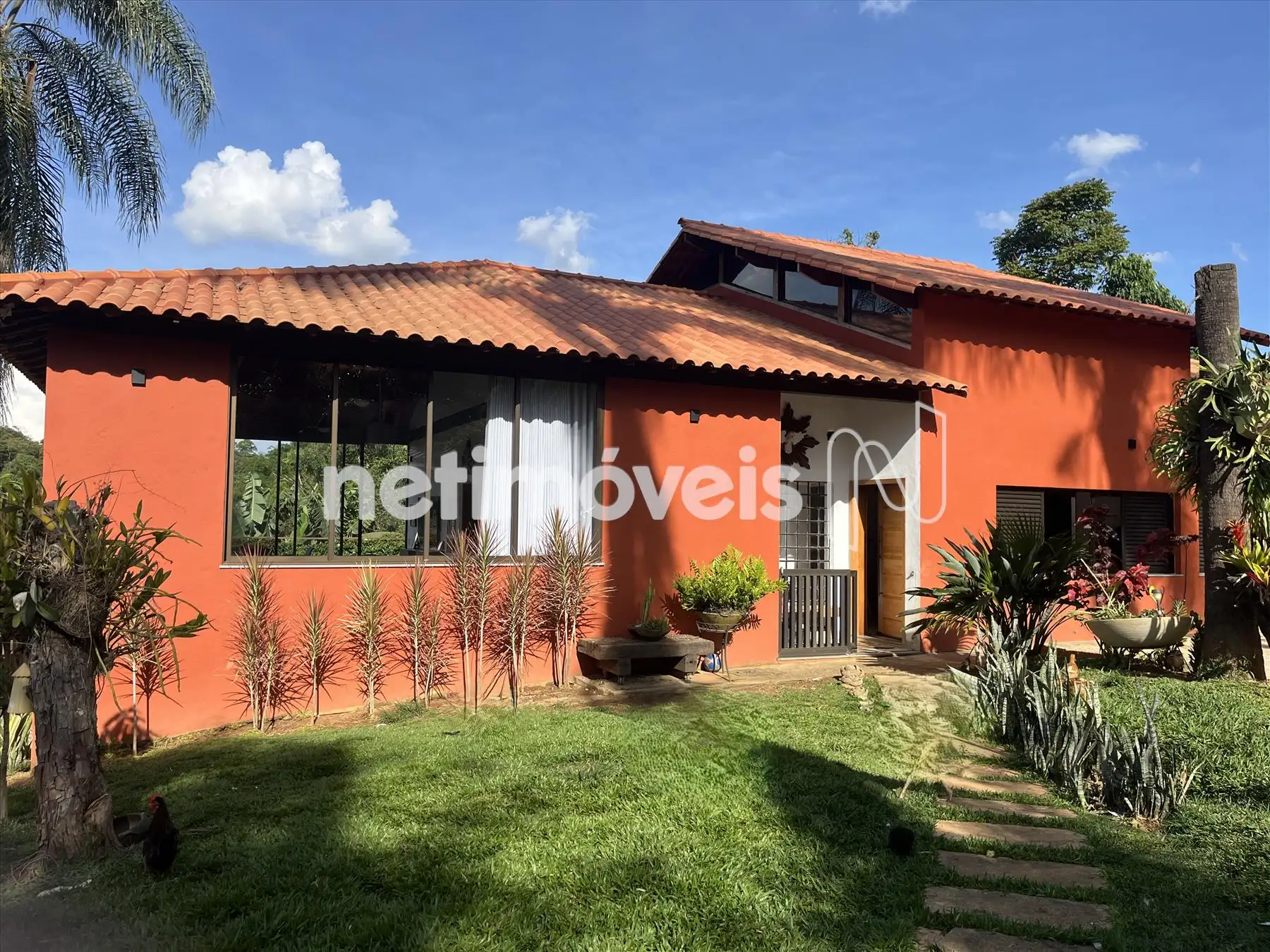 Quintal com gramado, ajardinado com plantas ornamentais, coqueiros, jardins, pomar, horta e galinheiro .