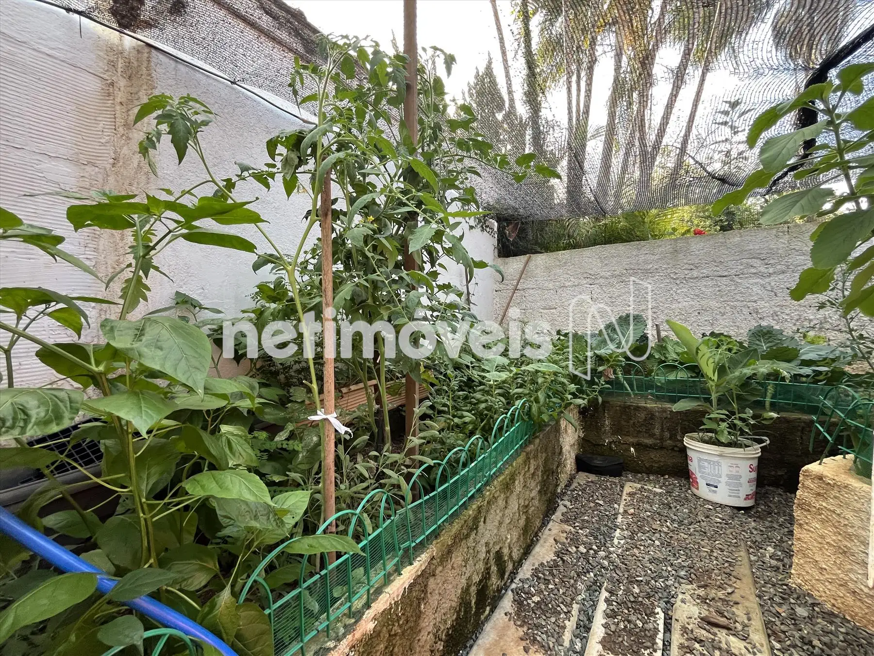 Toda murada, ajardinada com plantas, flores, árvores, pequeno pomar,