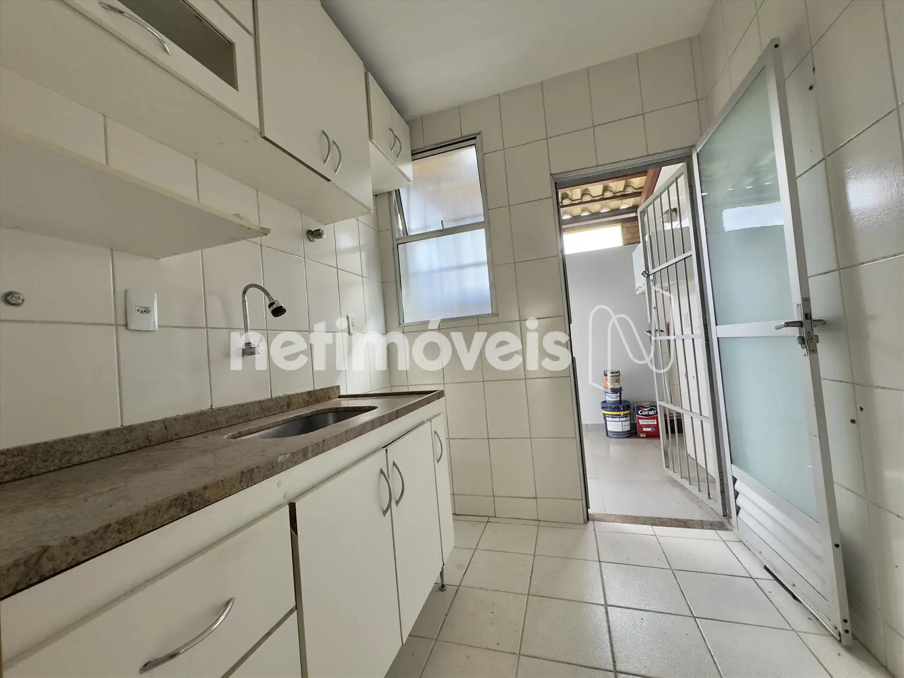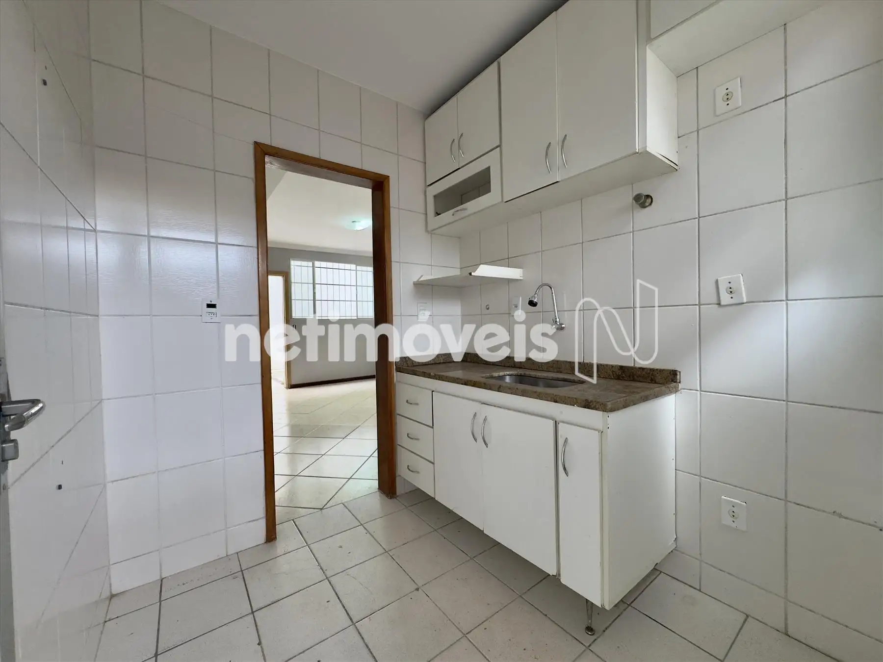 - Cozinha com armário e bancada em granito.