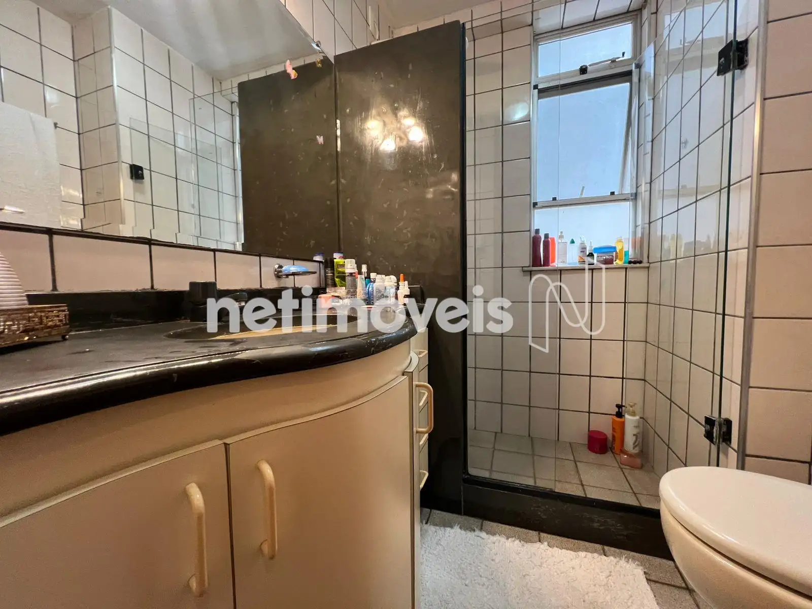 - Banhos com piso e bancada em mármore, box blindex.