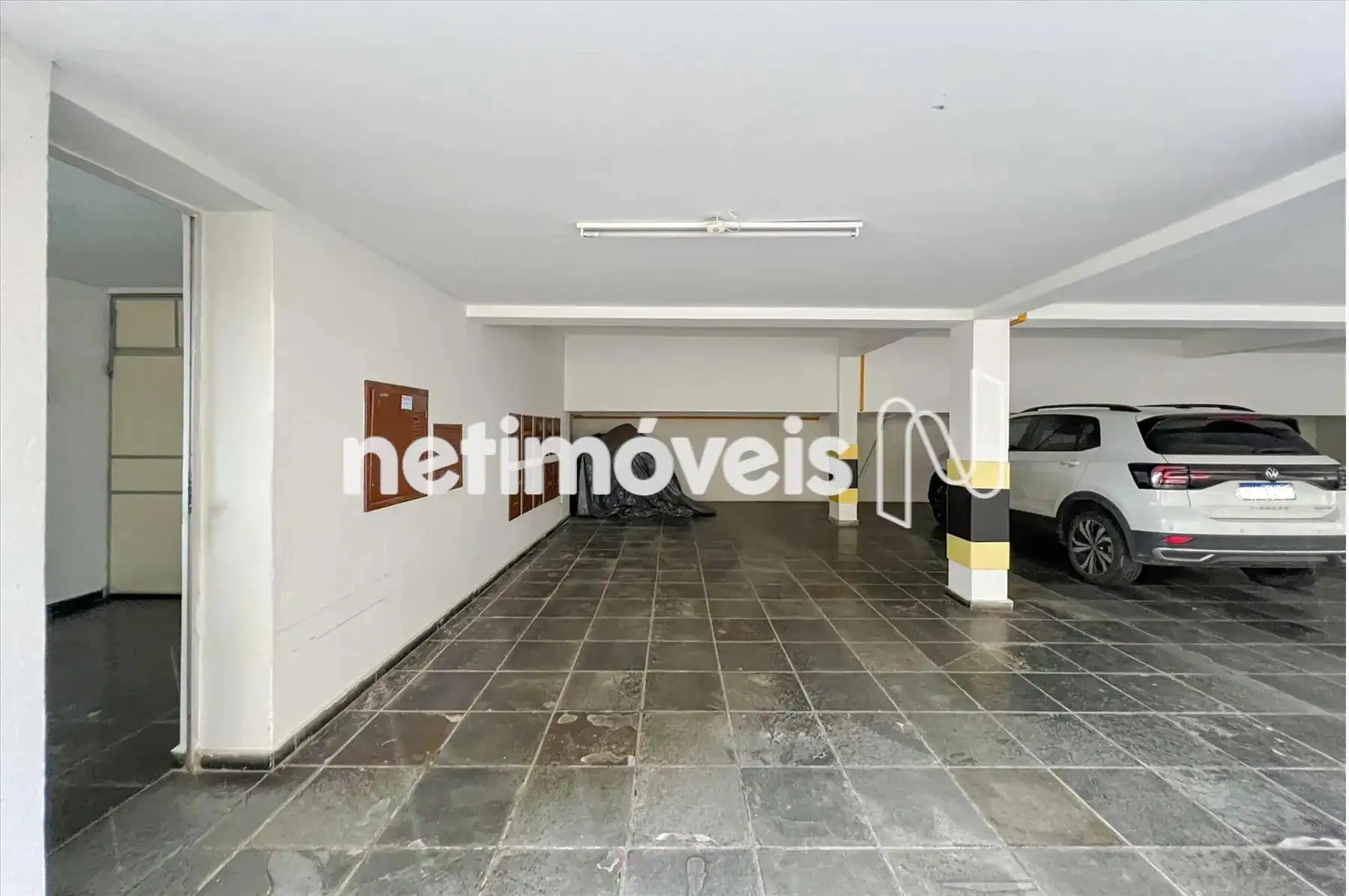 2 vagas de garagem demarcadas, sob pilotis, em linha.