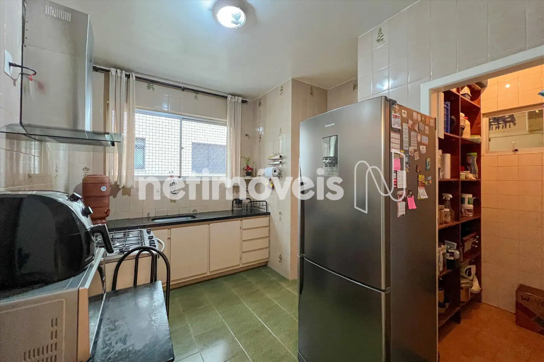 Cozinha espaçosa, com vasto espaço de armazenamento e despensa.