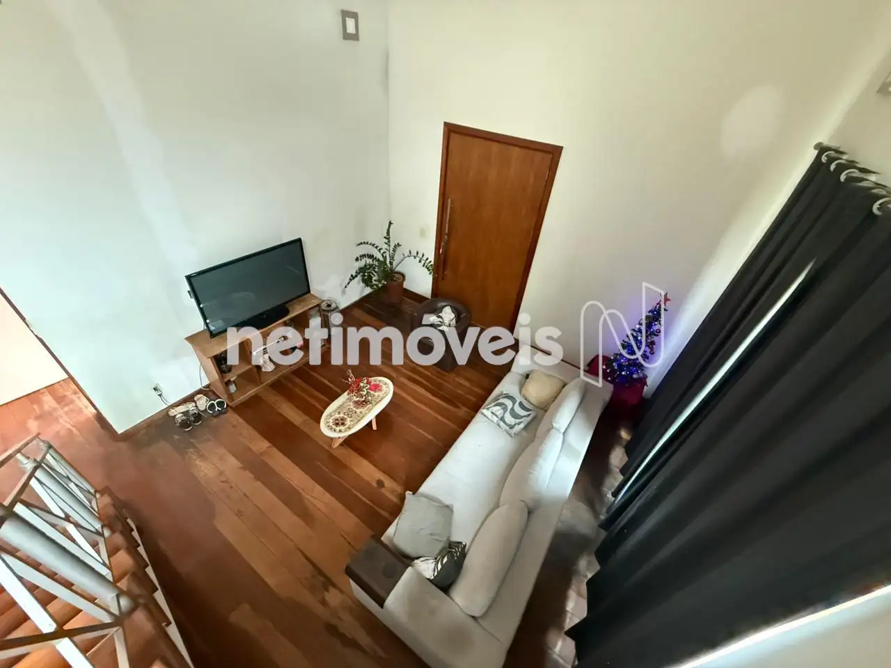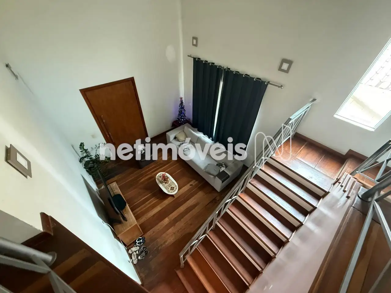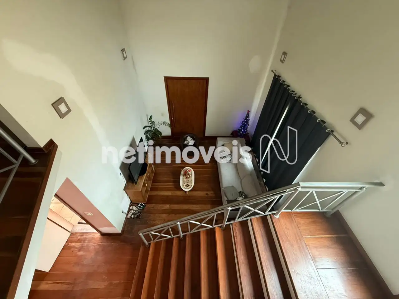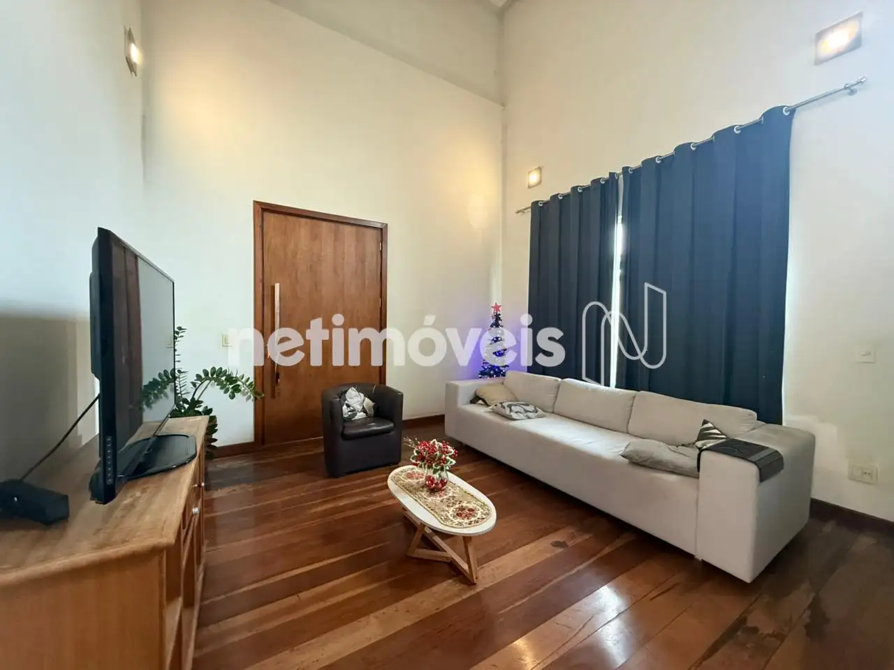A sala de estar com pé-direito alto traz imponência e ótima iluminação natural. Conta ainda com copa e cozinha com armários planejados.