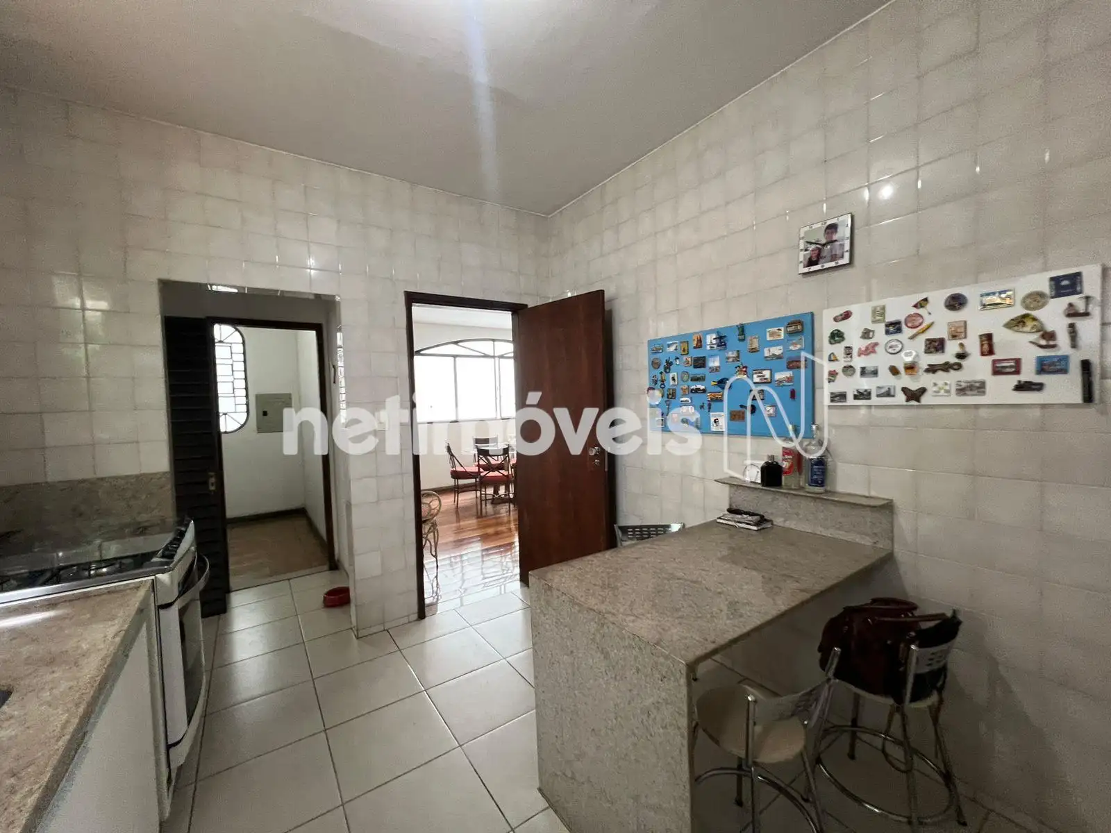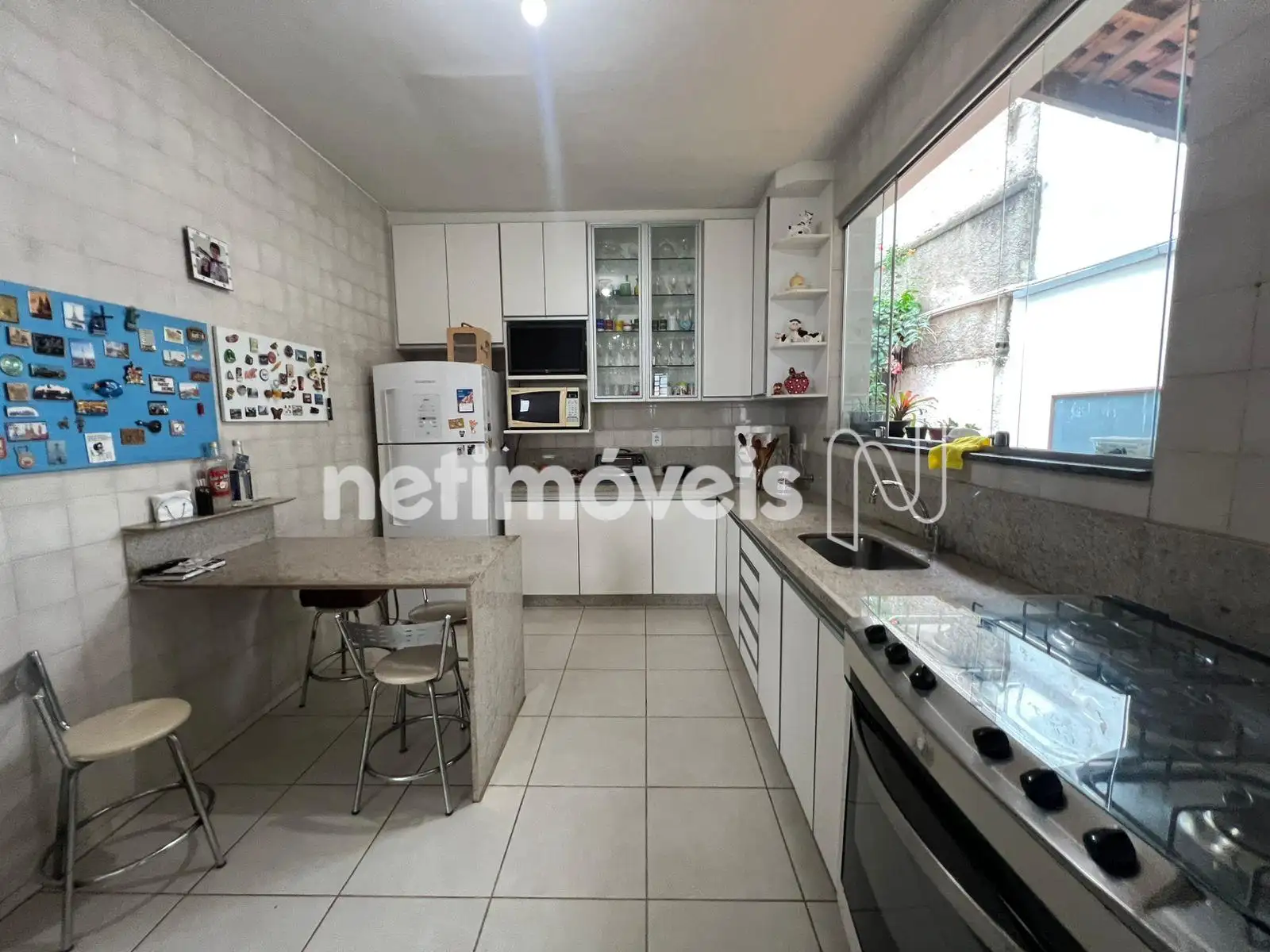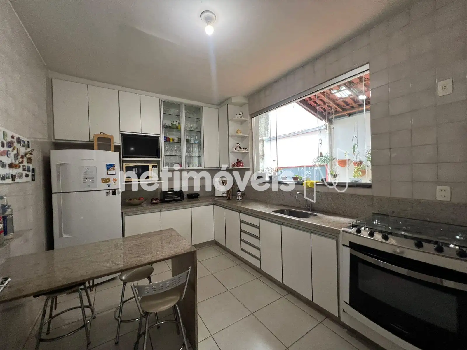 - Cozinha ampla com armários sob e sobre bancada em granito;