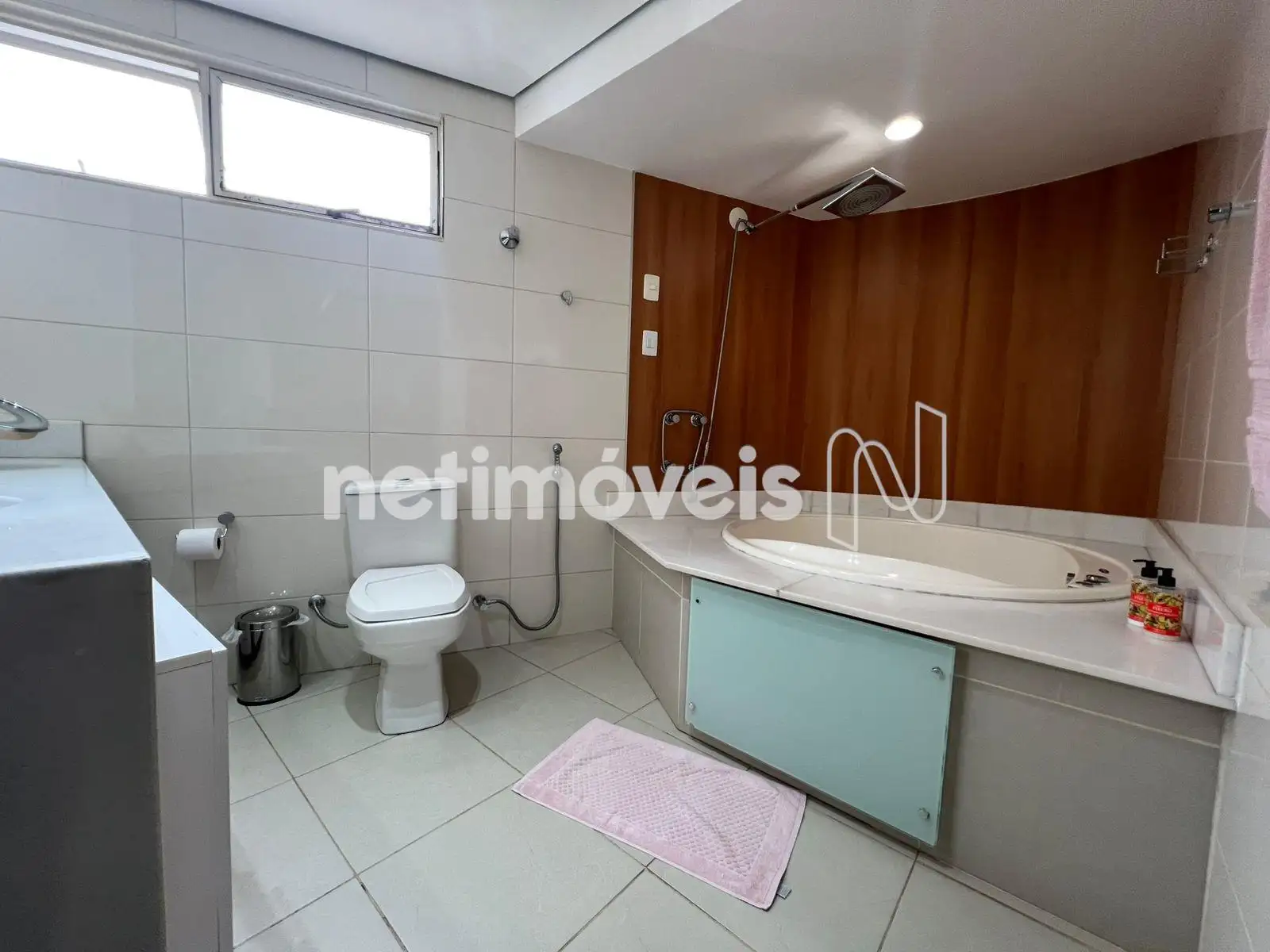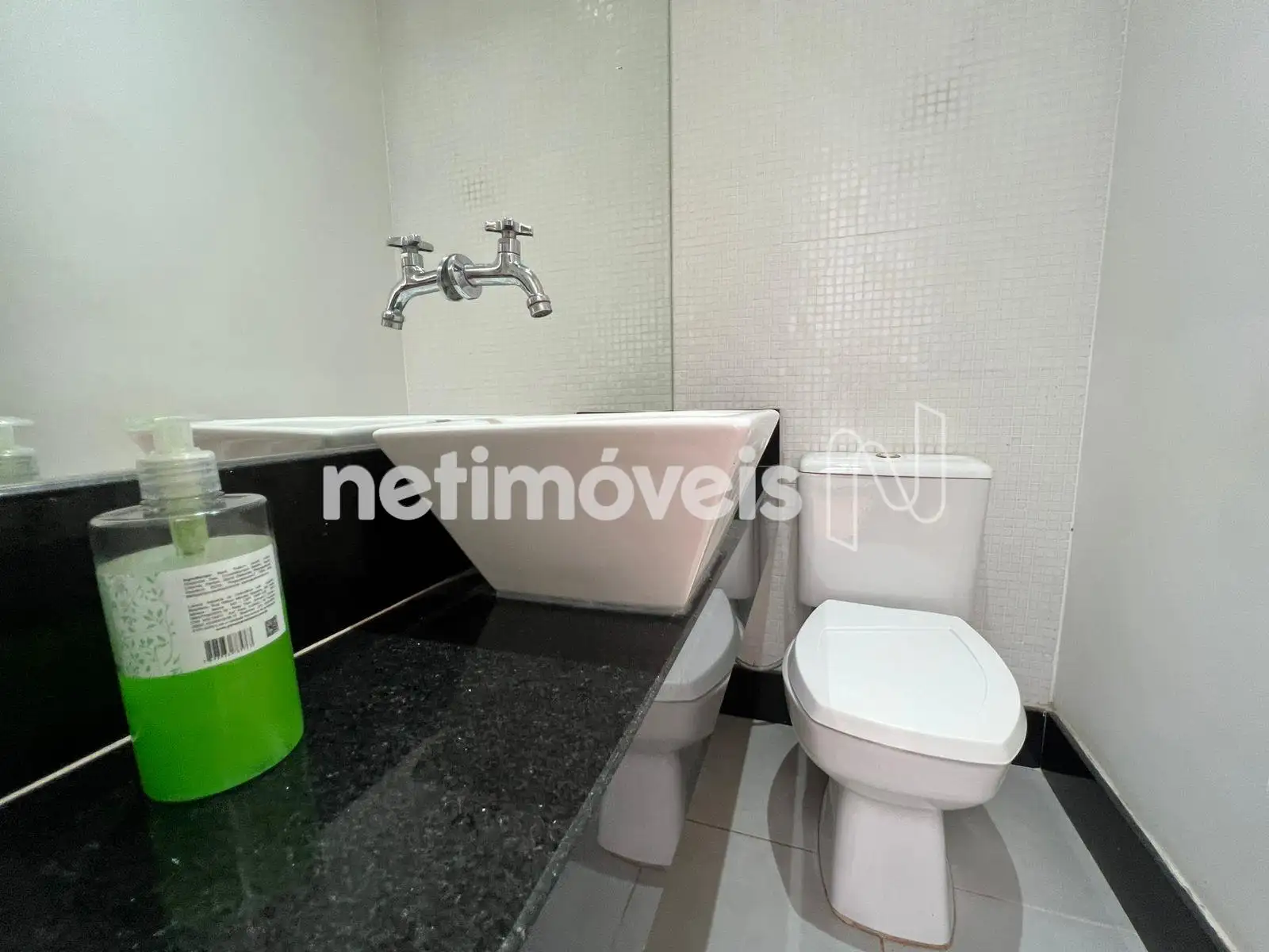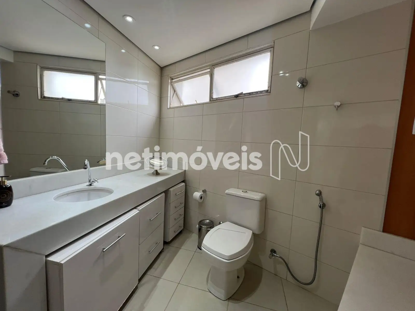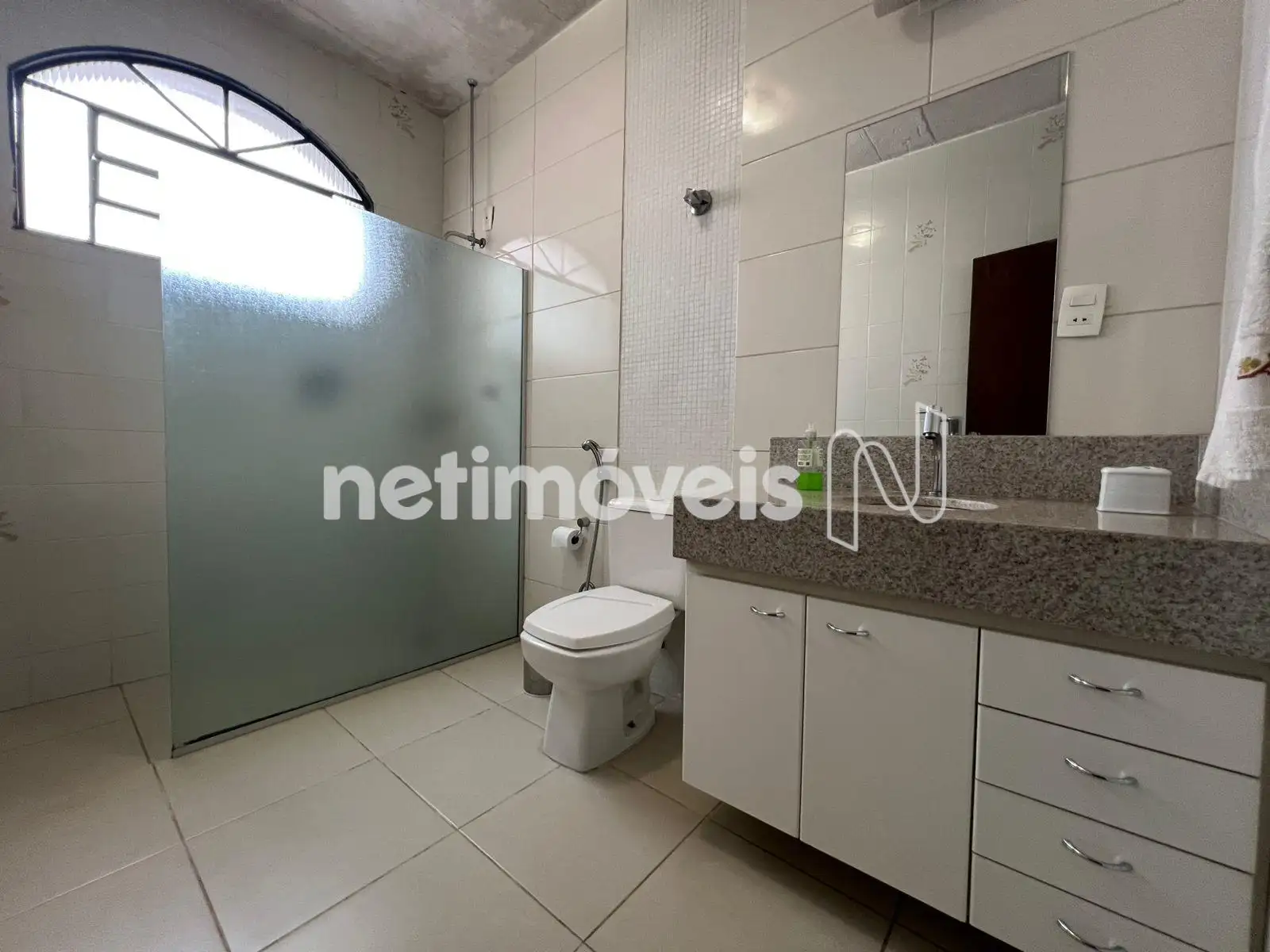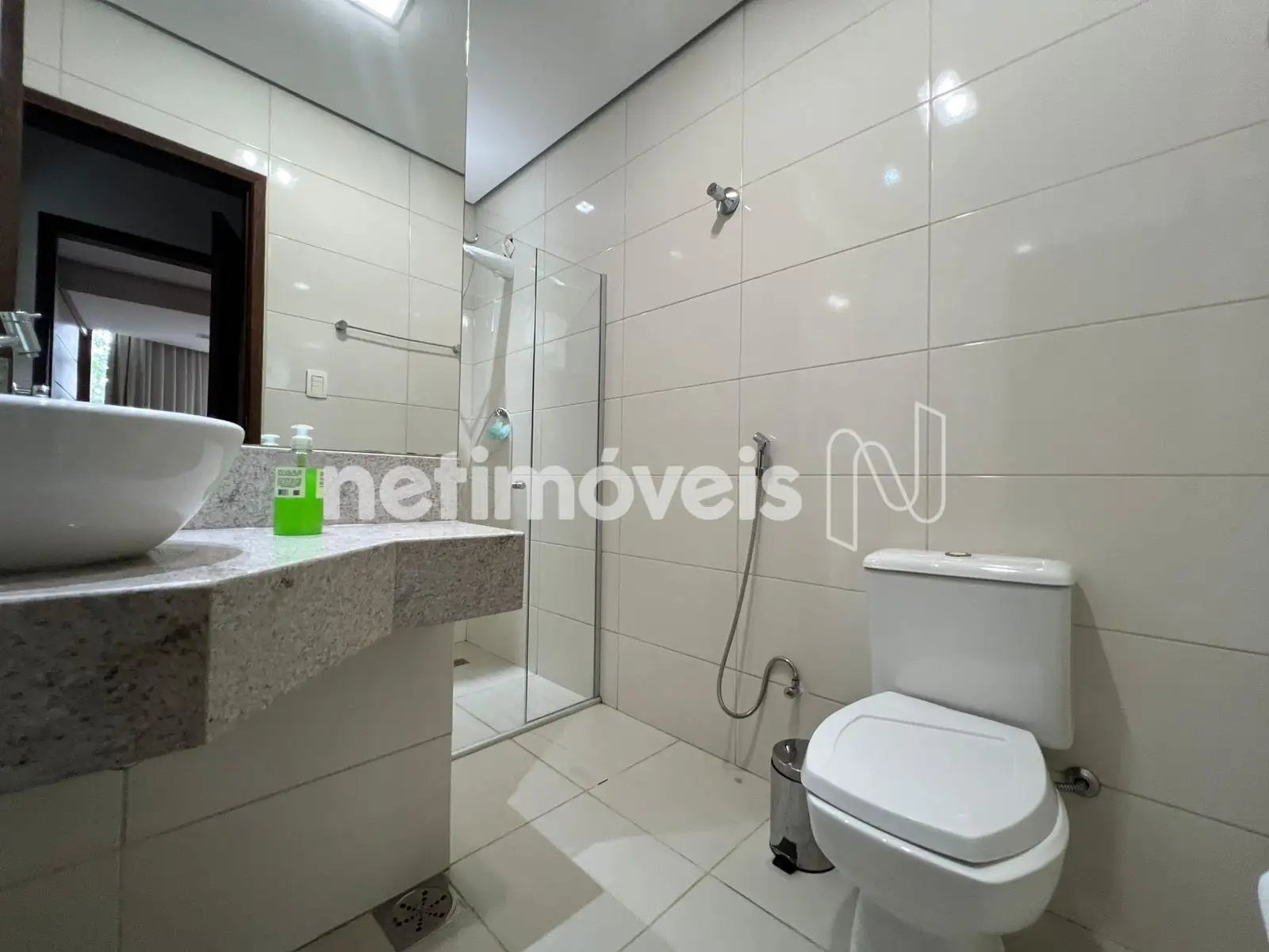 - Banheiro social com bancada em granito, armário e box em vidro blindex;