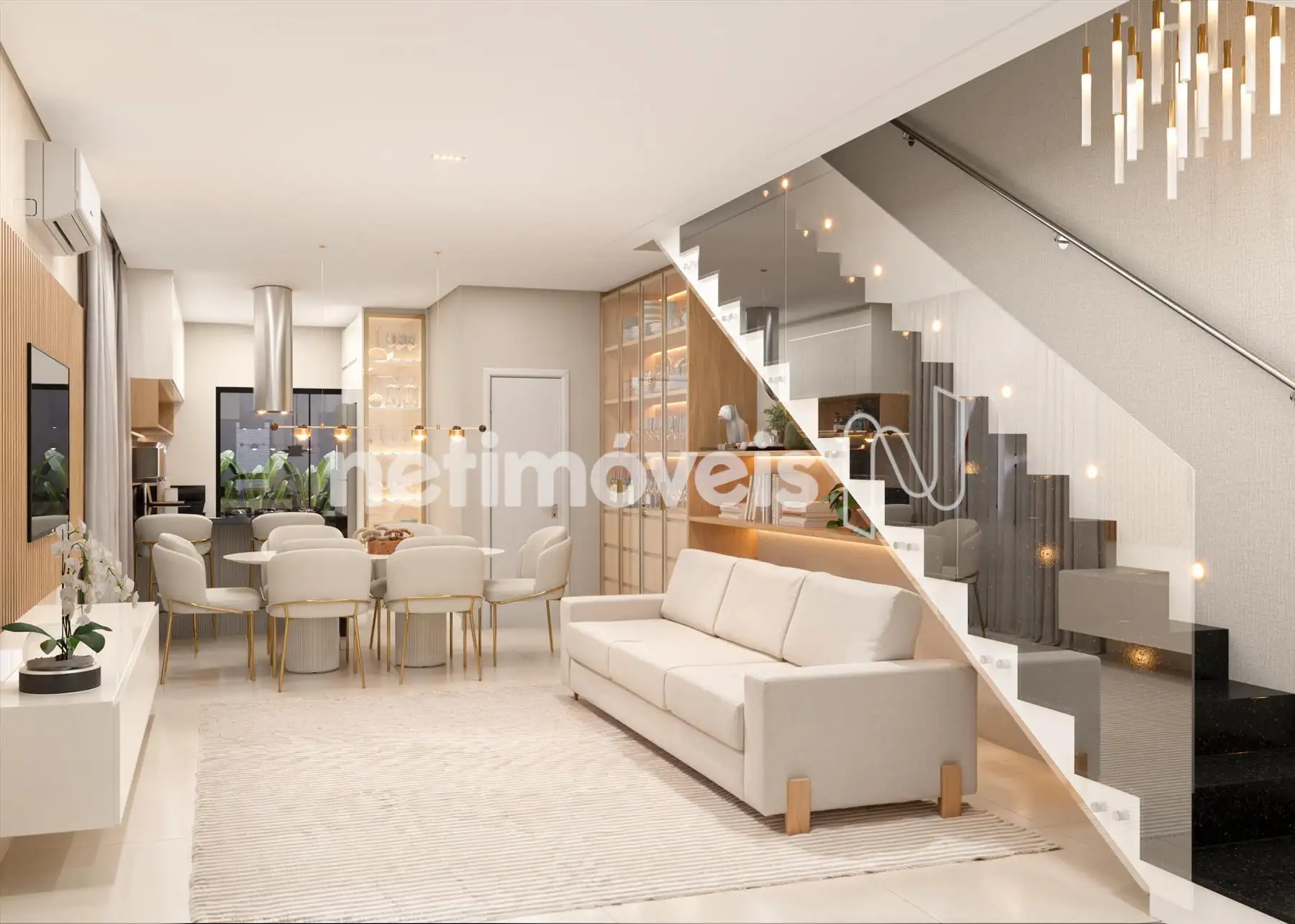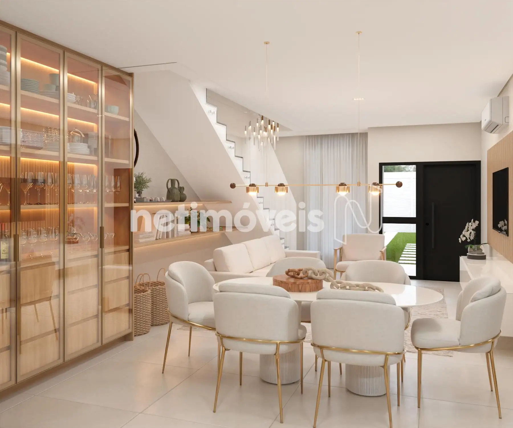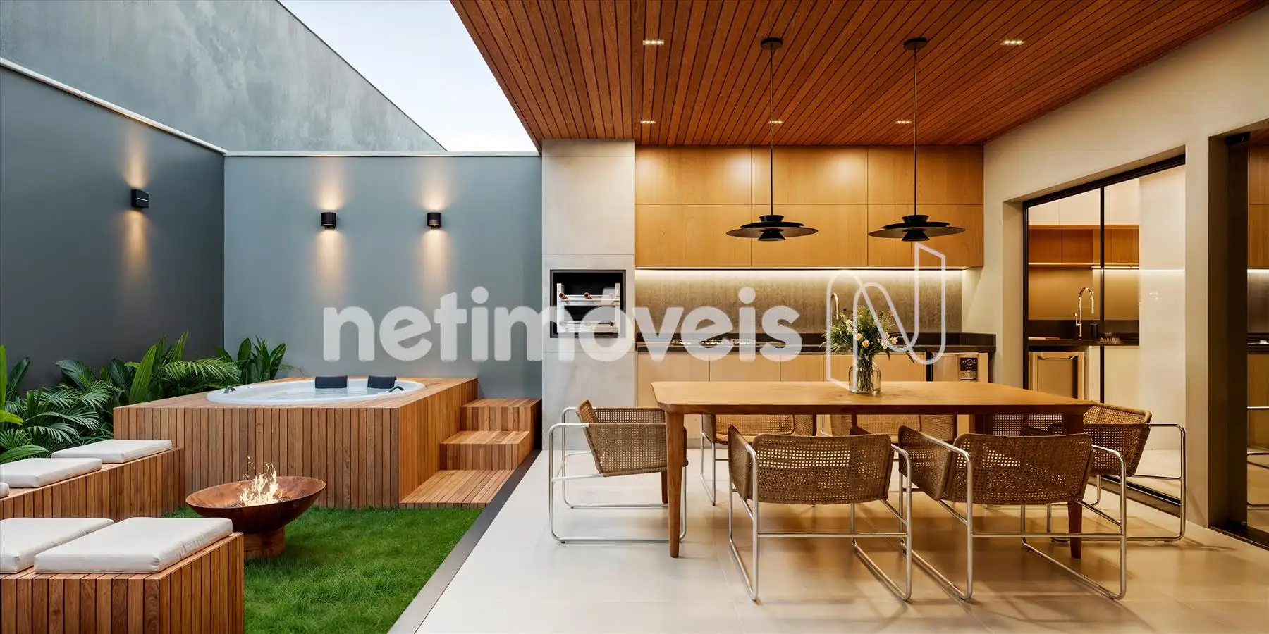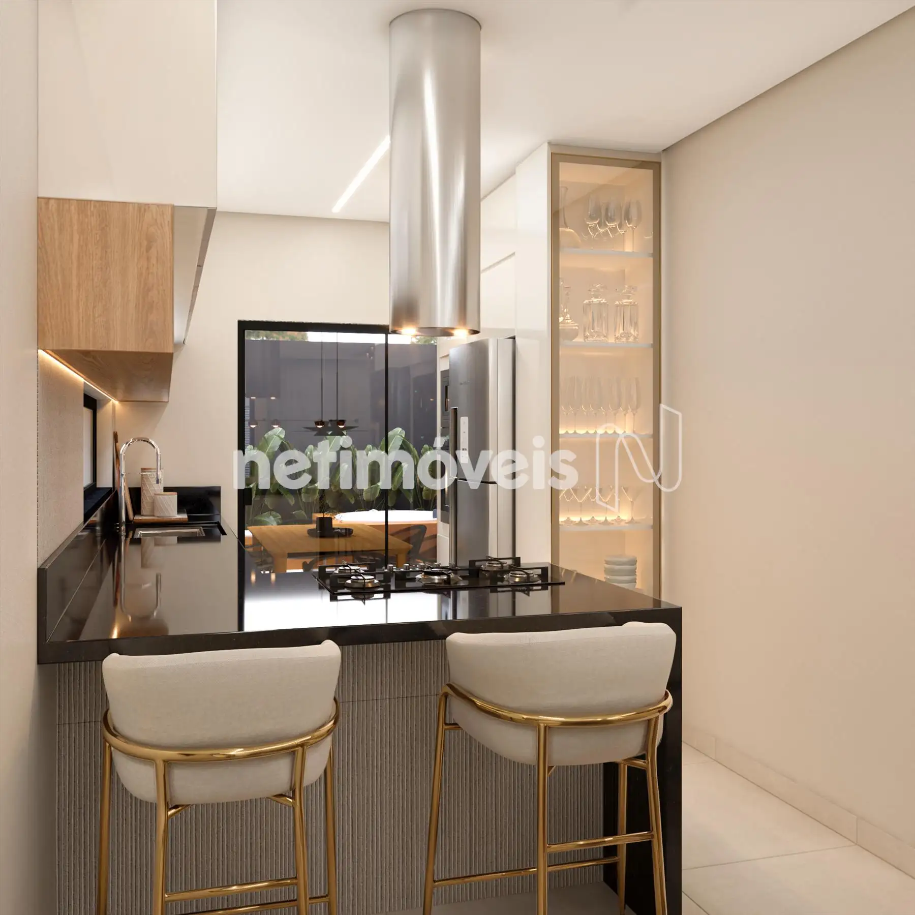 - No 1° pavimento, a casa contará com sala para dois ambientes integrada à cozinha, bancadas em granito, previsão para cooktop em península, lavanderia separada da cozinha com acesso independente e acesso externo para a área gourmet. O projeto prevê ainda jardim lateral, janelas adicionais, excelente iluminação e ventilação natural, além de infraestrutura para ar-condicionado, previsão para área gourmet, previsão para jacuzzi e previsão para gás encanado atendendo a área externa.