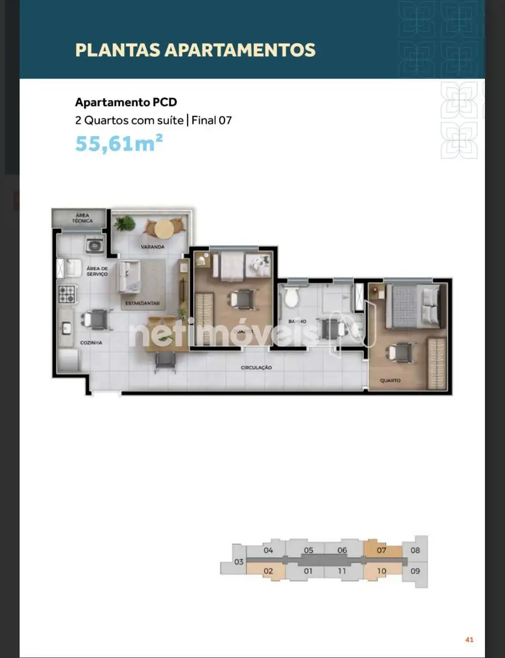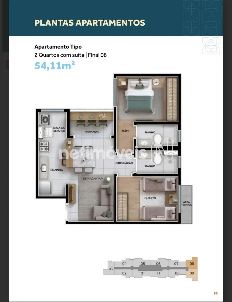 - Apartamentos de 1 ou 2 quartos, com suíte e varada: 54,11 m² a 56,89m²