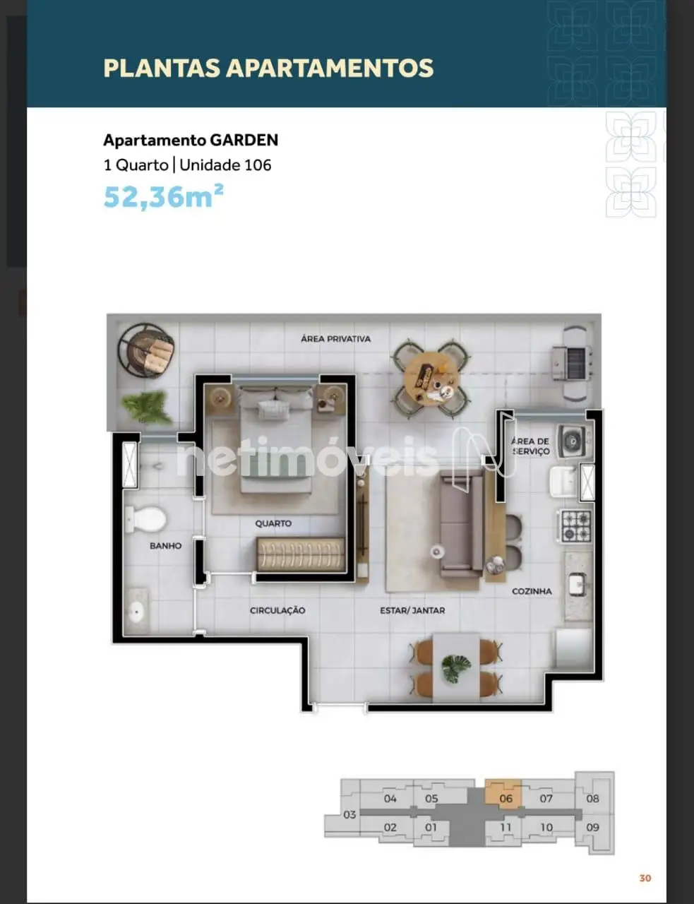 - Área Privativa 1 quarto: de 52,36m² a 83,34m²
