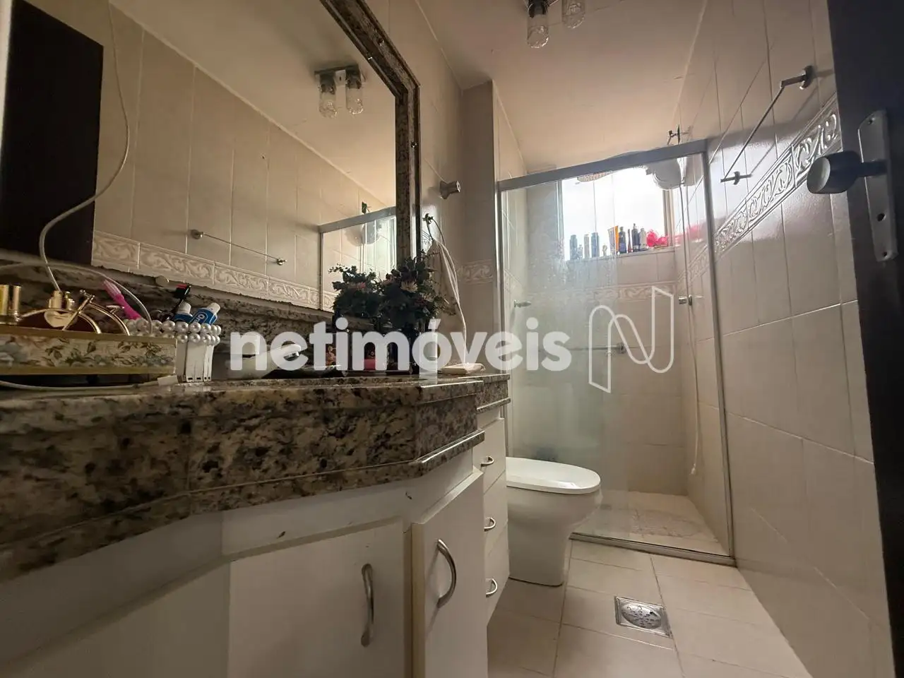 Banho social com piso e revestimento em cerâmica, pia com bancada em granito, armário, espelho e box em vidro temperado;