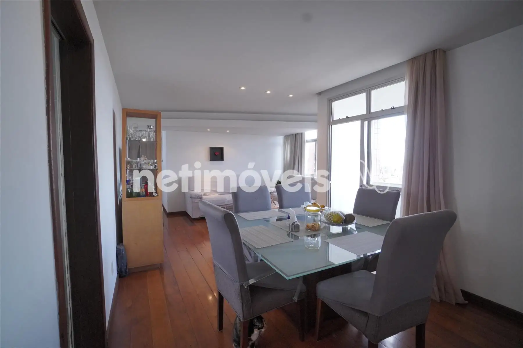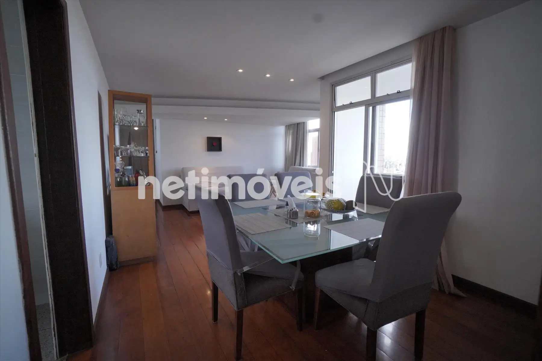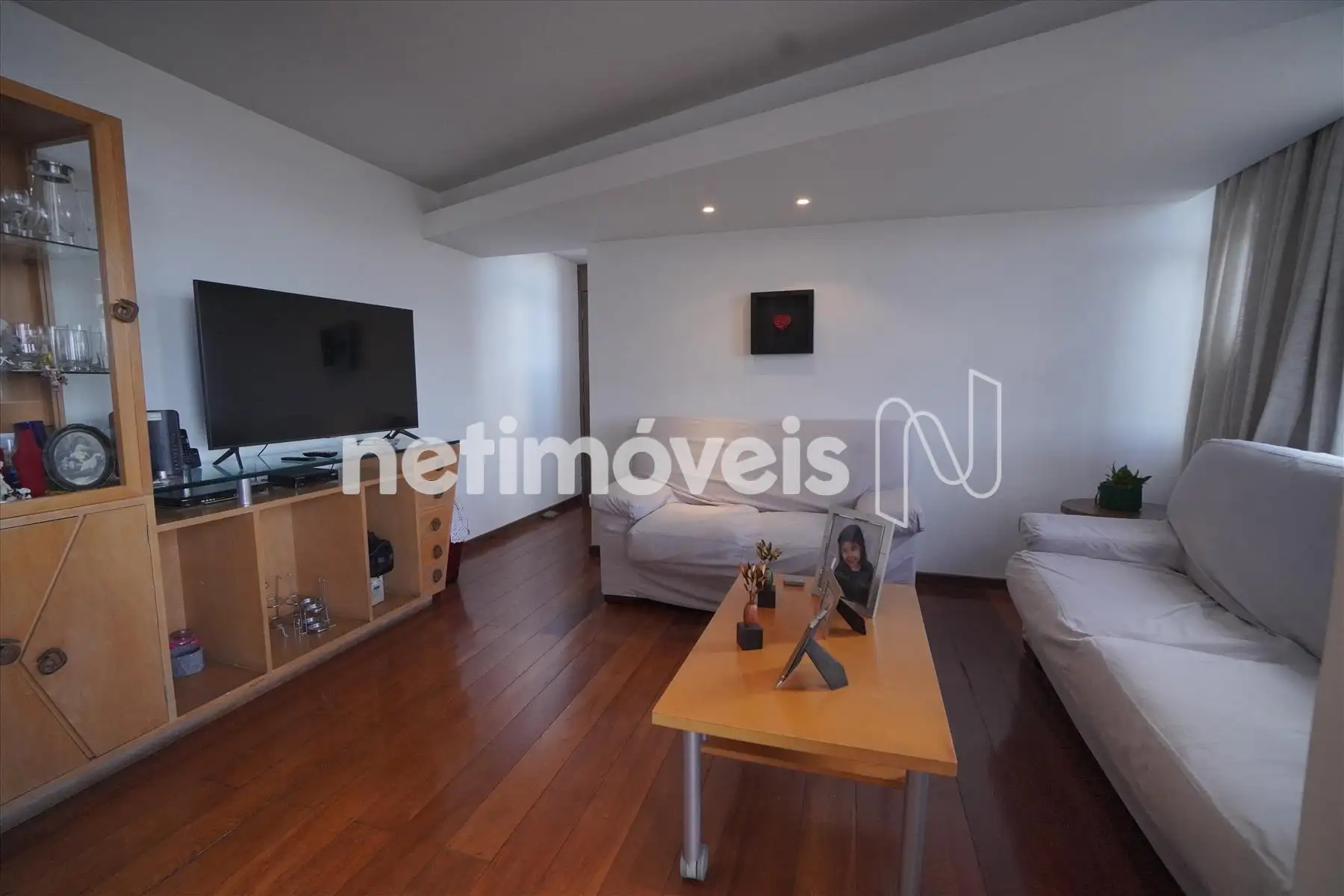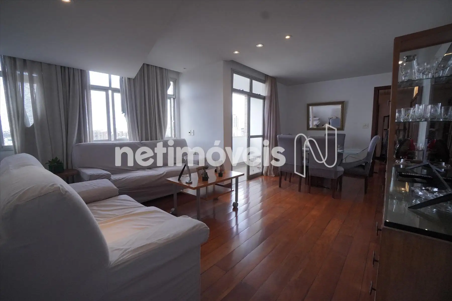 imóvel possui teto rebaixado, iluminação embutida e cortinas.