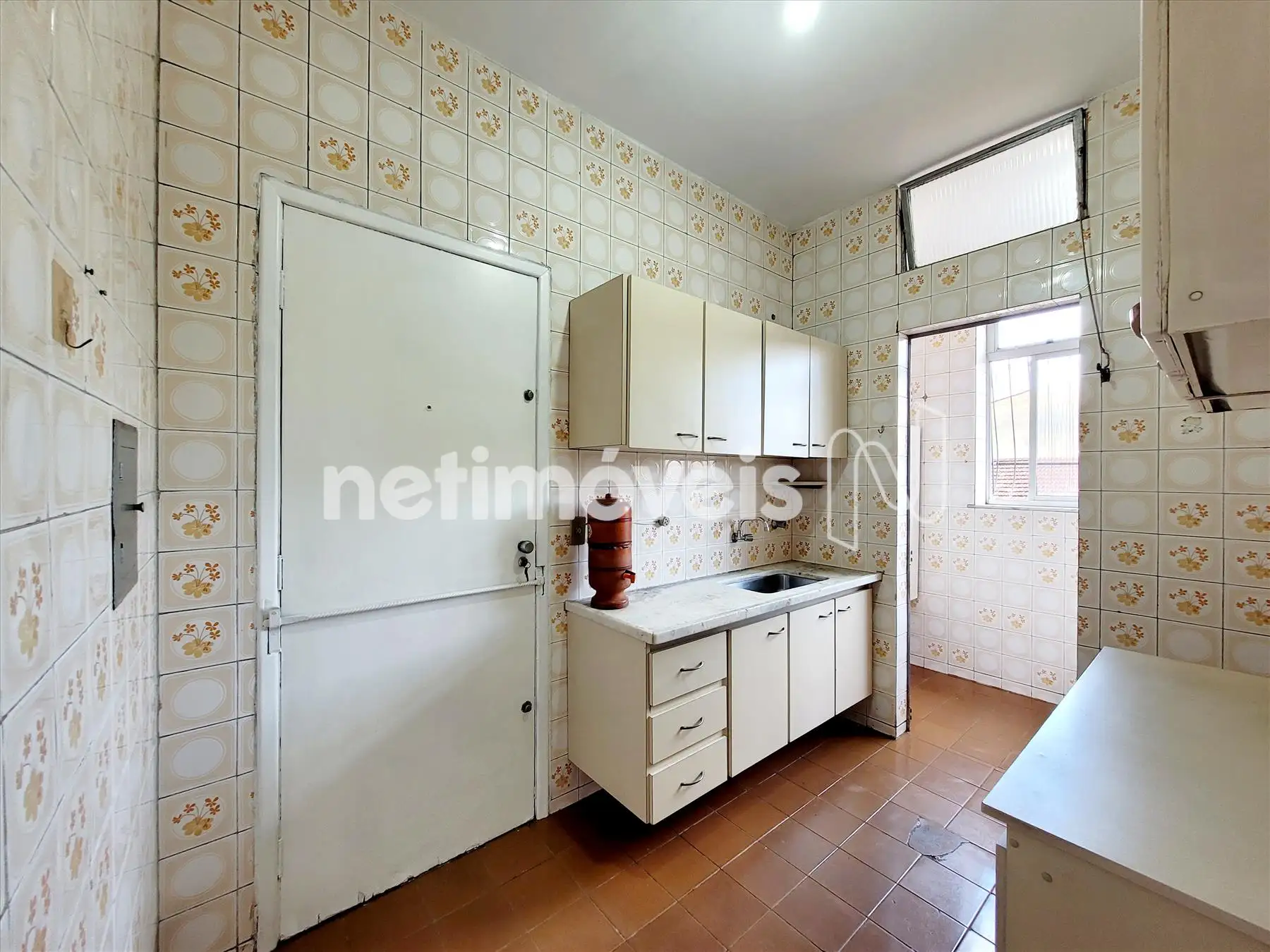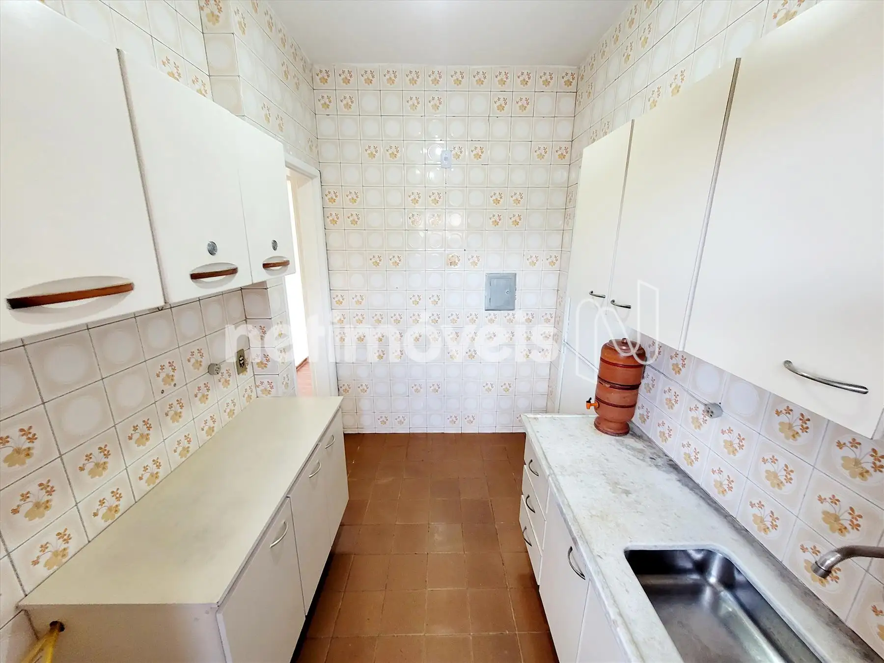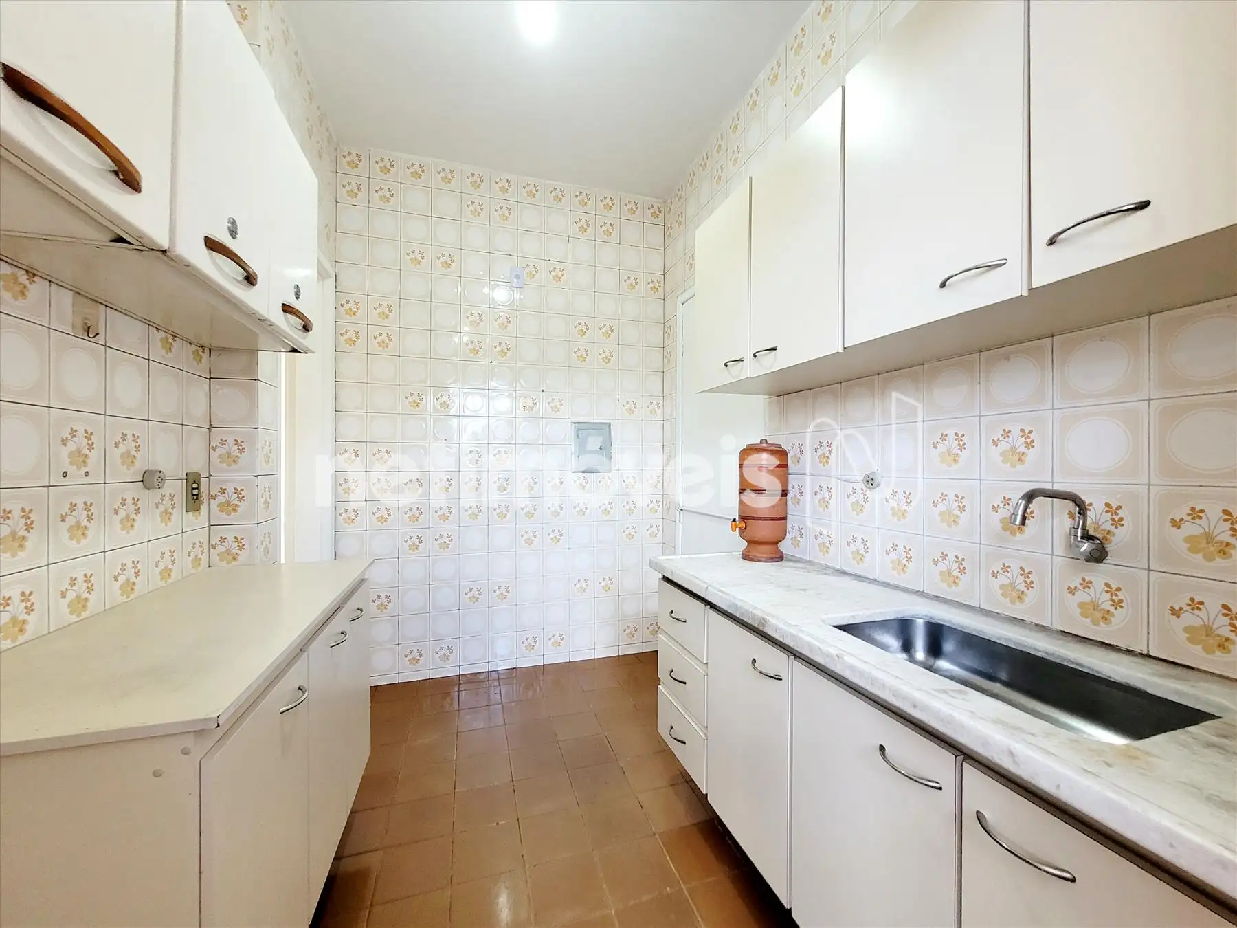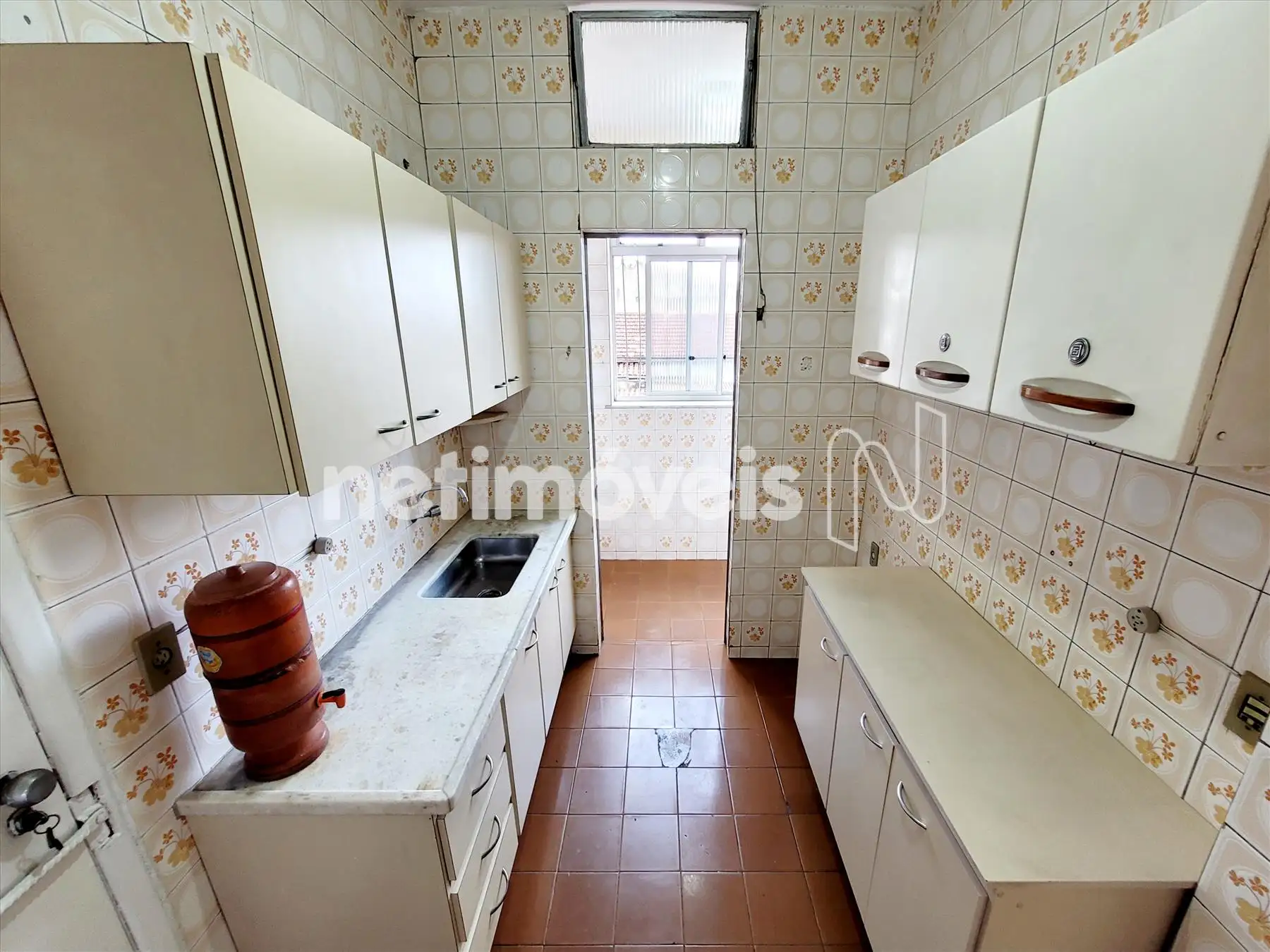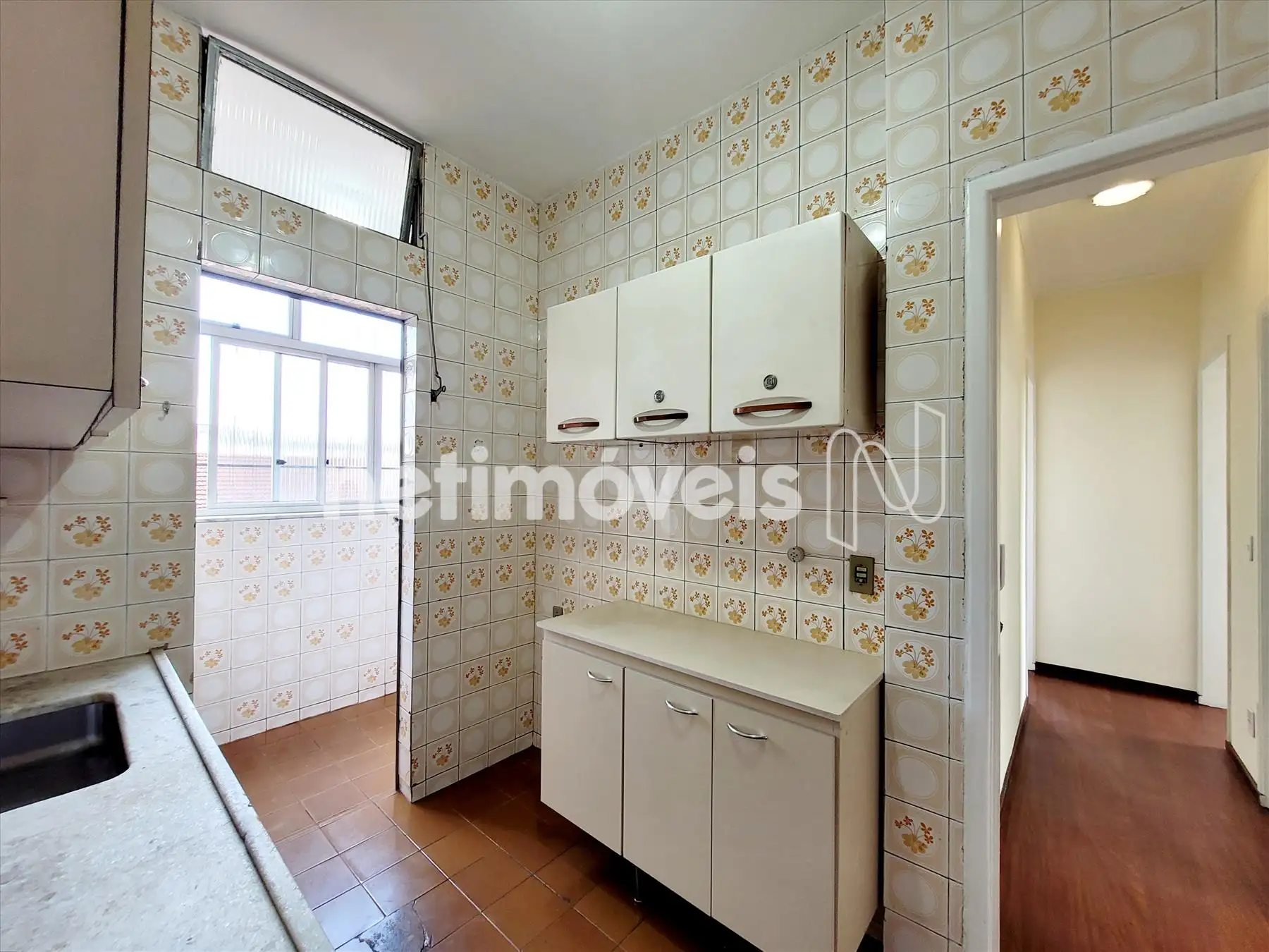 Cozinha com armários sobre e sob bancada em mármore. Piso em cerâmica;