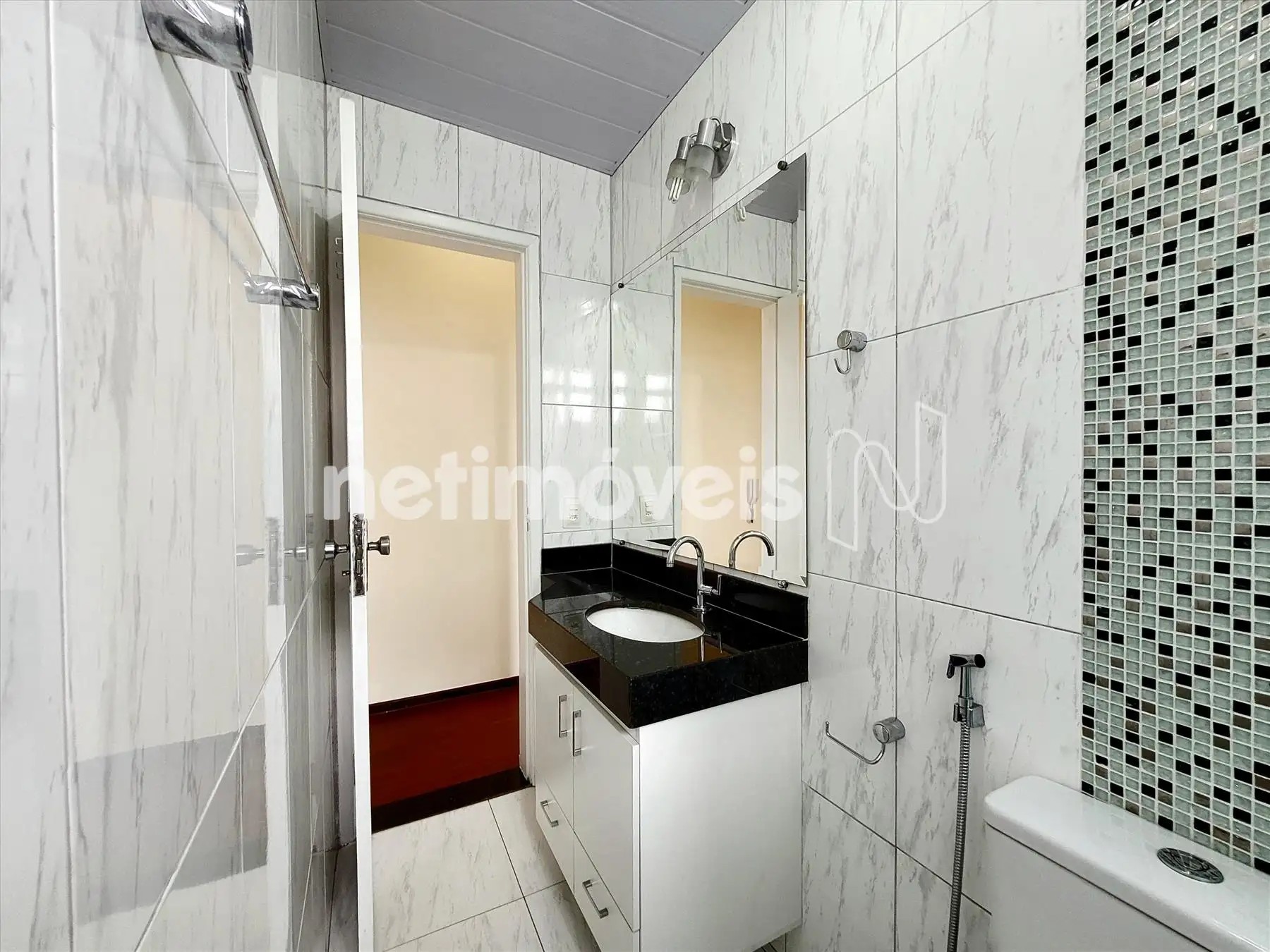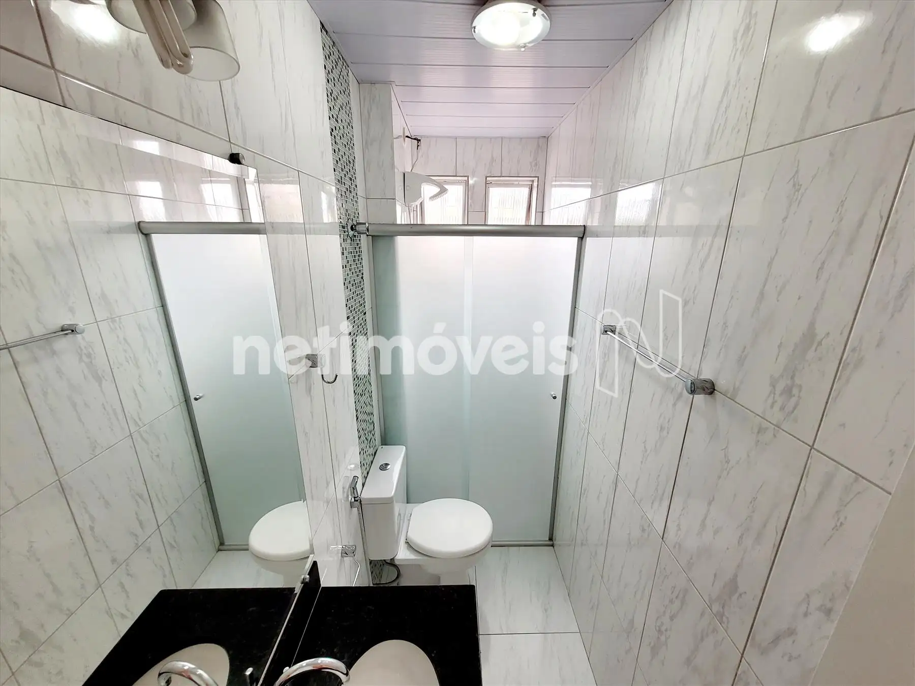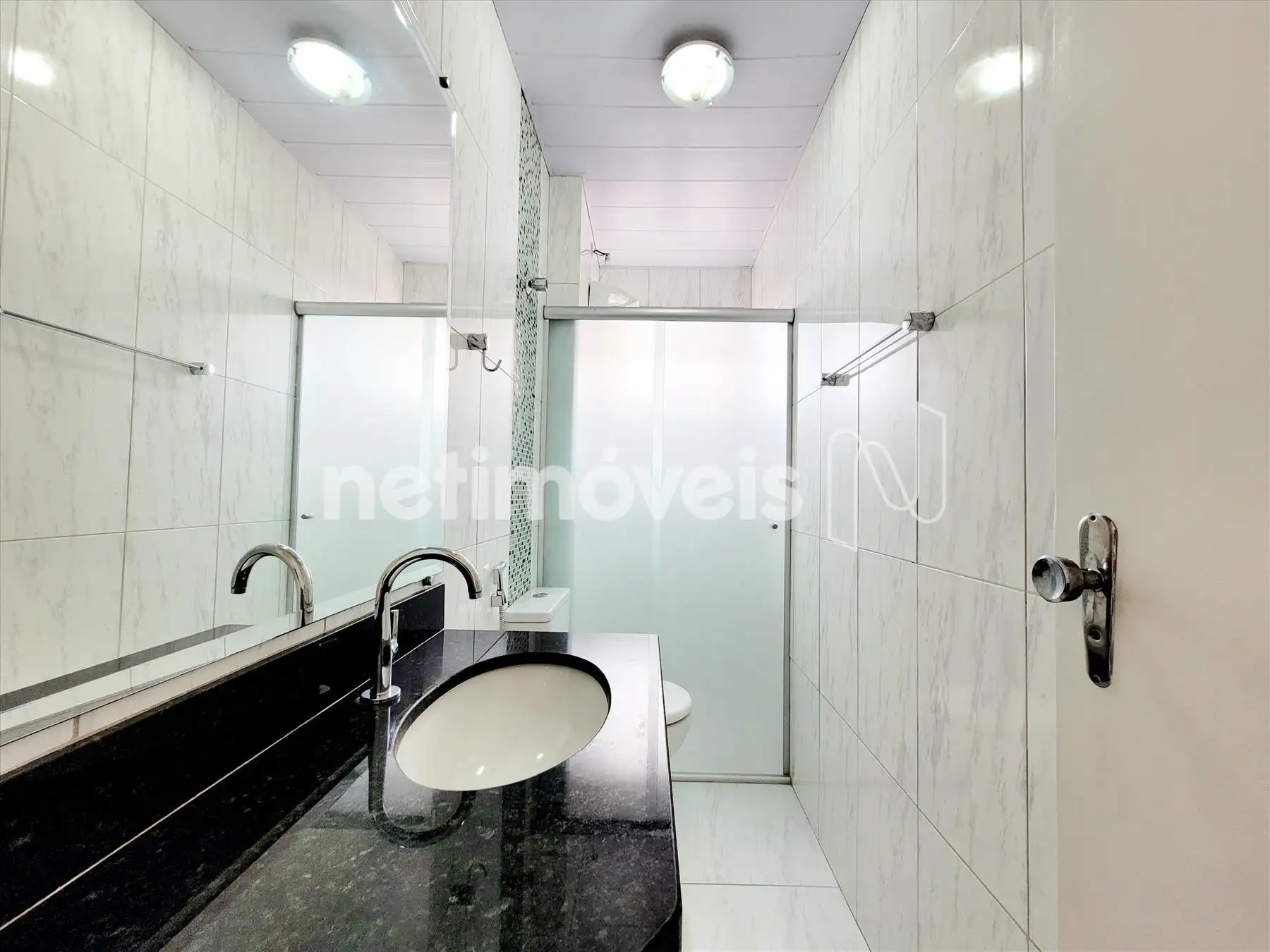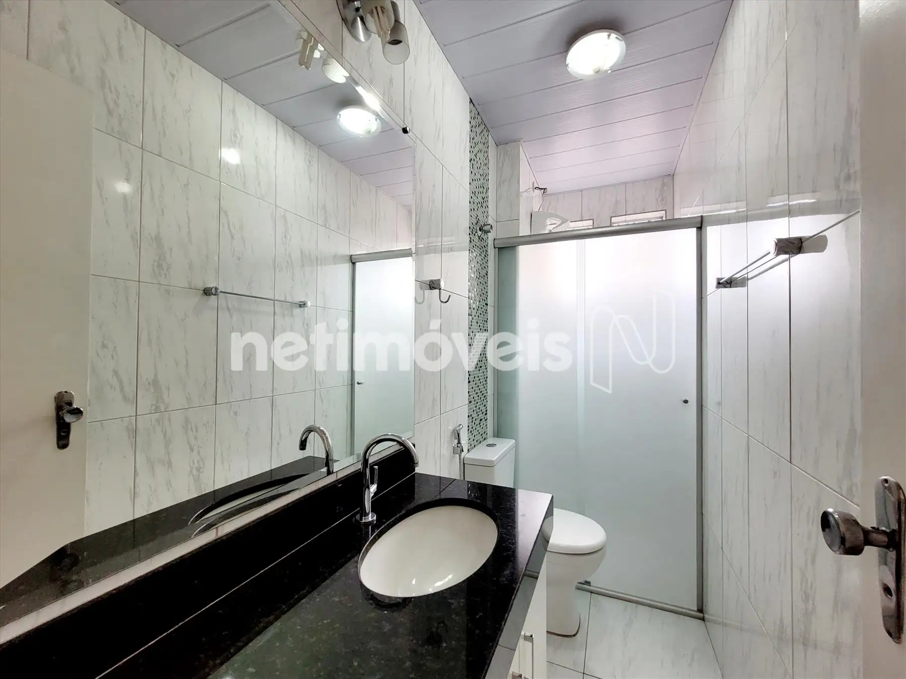 Banho social com box em blindex, bancada em granito, piso em cerâmica;