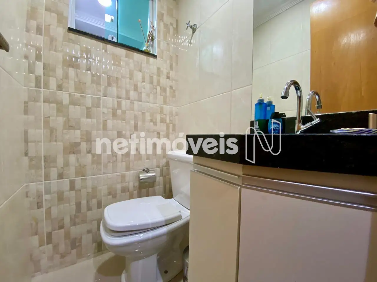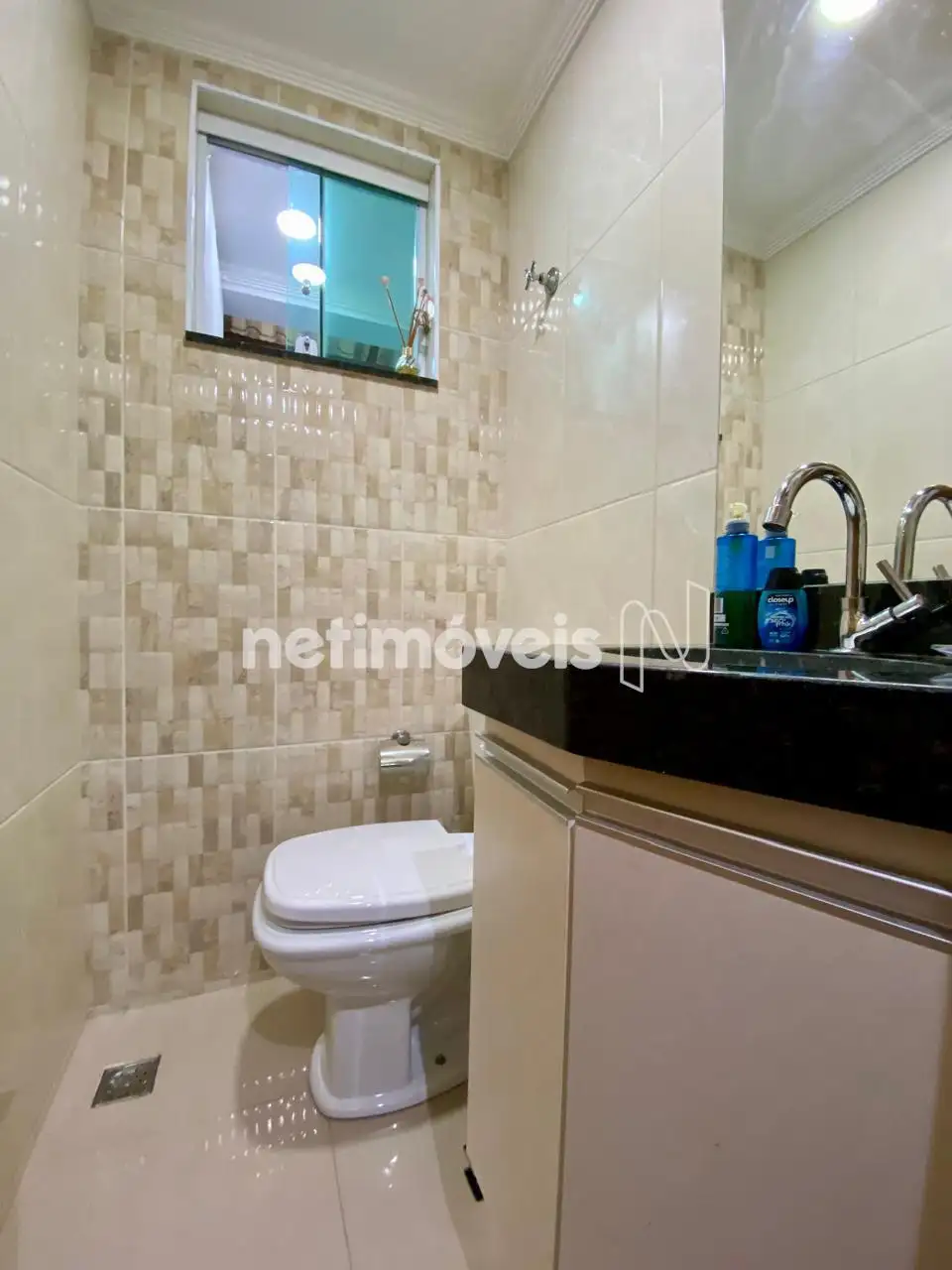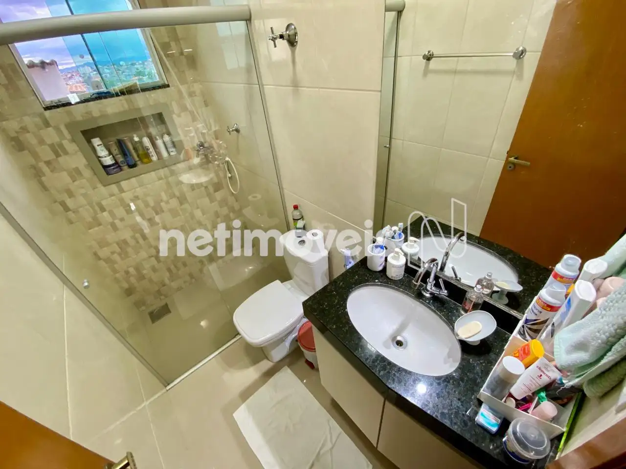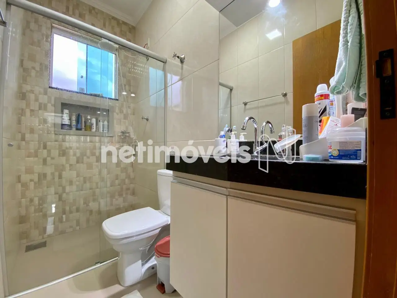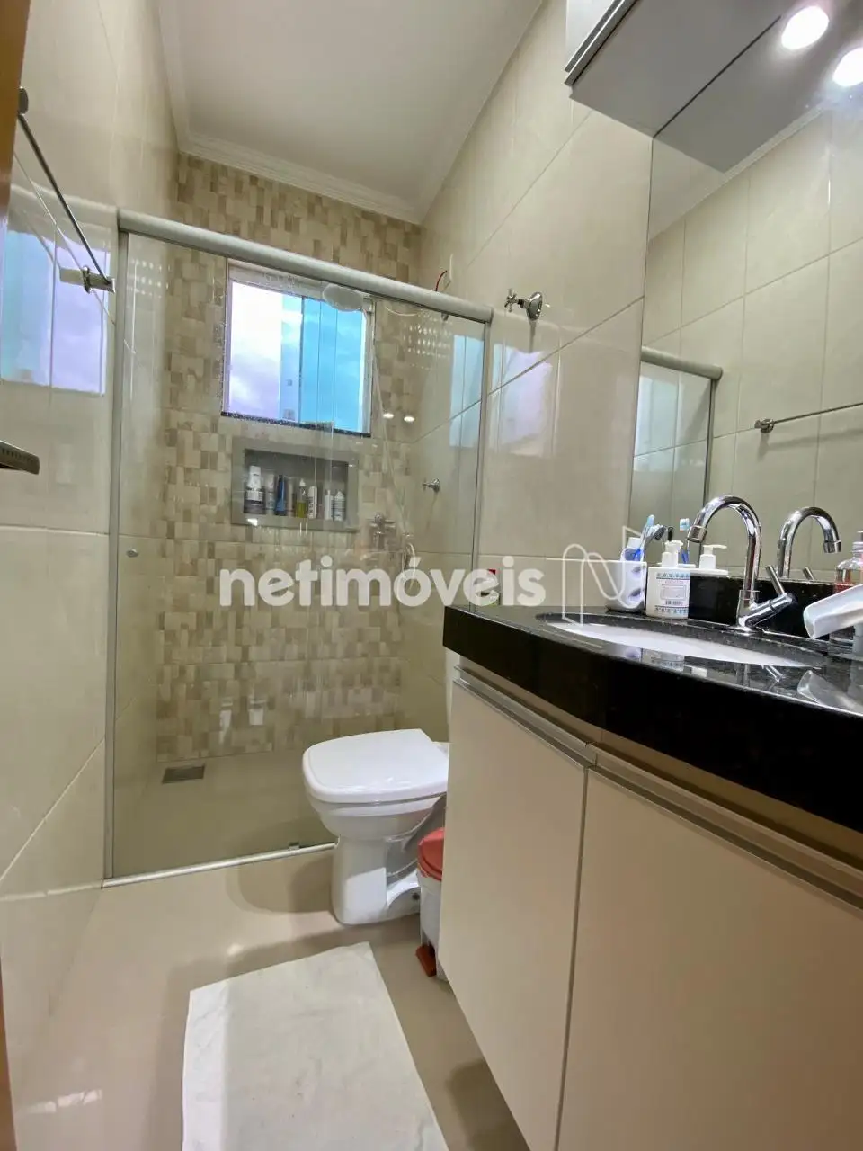 • Banho social com box em vidro e armário sob a pia