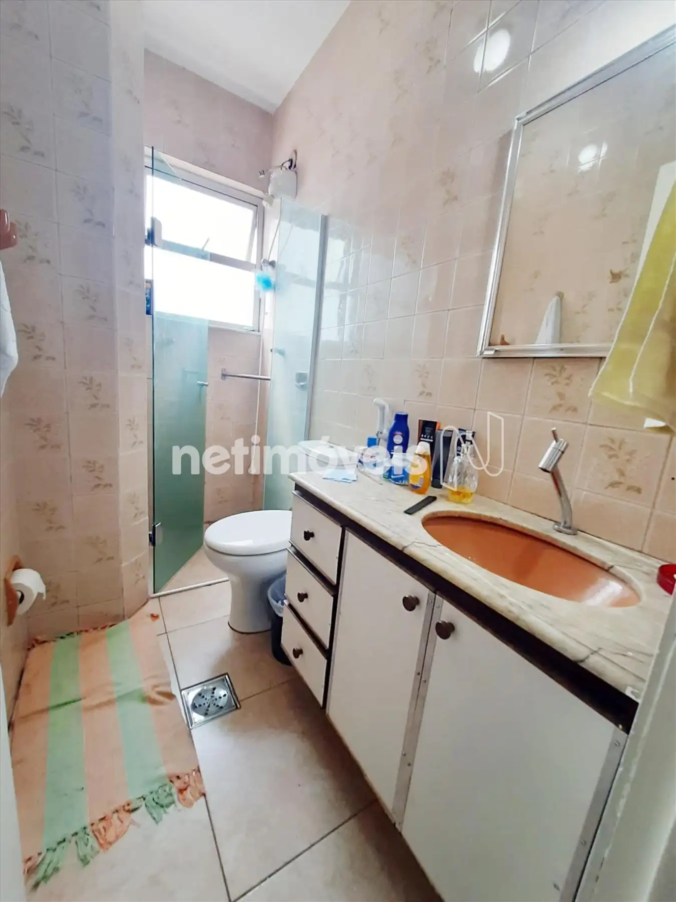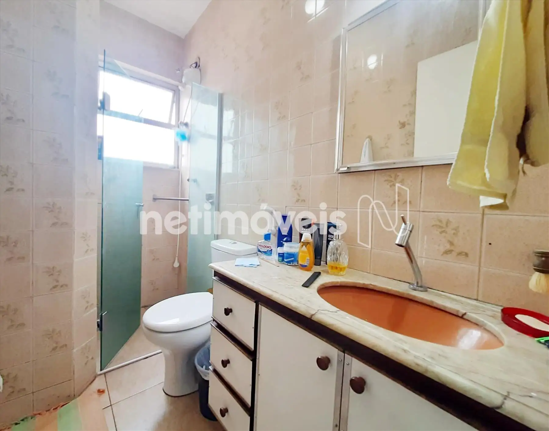 Banheiro social com piso em cerâmica, box em vidro temperado.