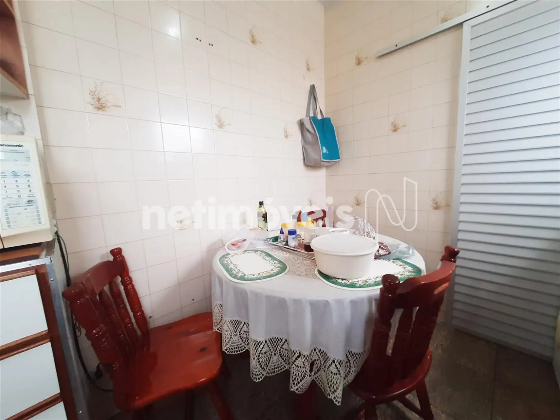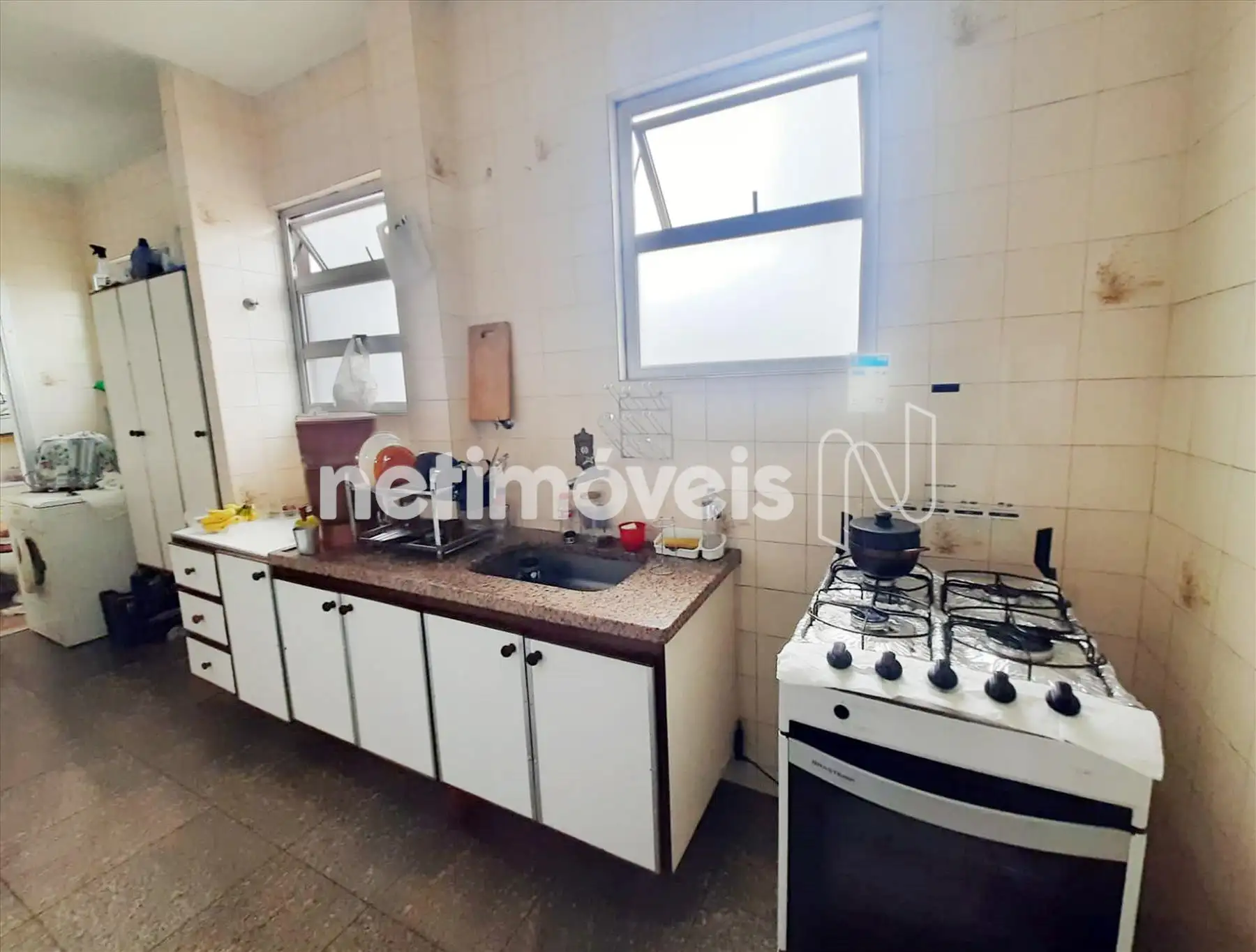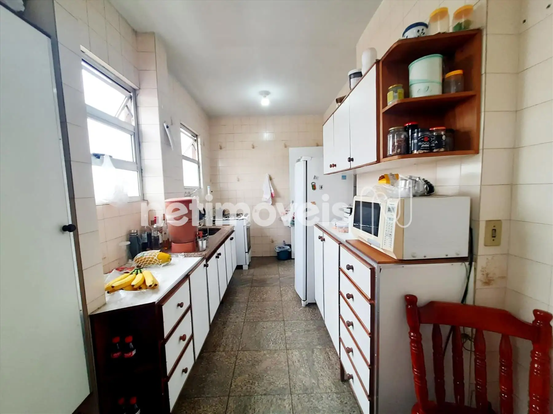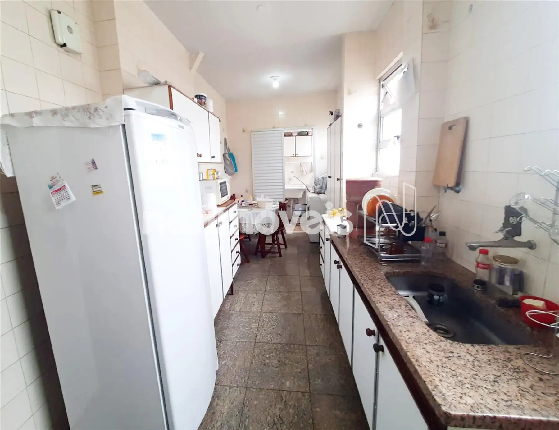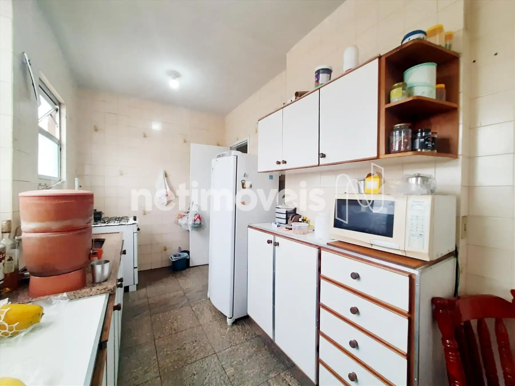 Cozinha grande com piso em cerâmica.